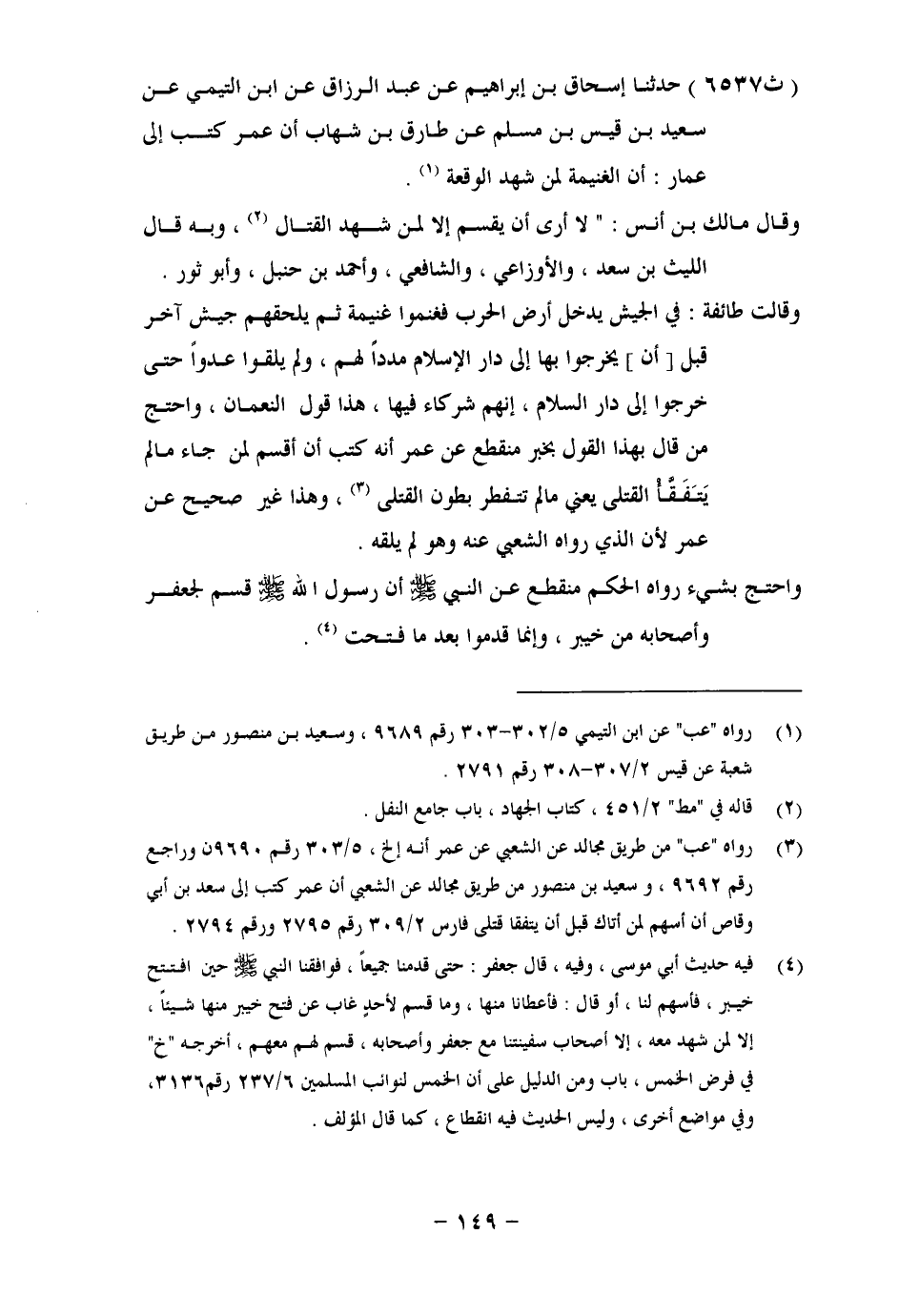 6537 - حَدَّثَنَا إِسْحَاقُ بْنُ إِبْرَاهِيمَ، عَنْ عَبْدِ الرَّزَّاقِ، عَنِ ابْنِ التَّيْمِيِّ، عَنْ سَعِيدِ بْنِ قَيْسِ بْنِ مُسْلِمٍ، عَنْ طَارِقِ بْنِ شِهَابٍ، أَنَّ عُمَرَ، كَتَبَ إِلَى عَمَّارٍ أَنَّ الْغَنِيمَةِ، لِمَنْ شَهِدَ الْوَقْعَةَ وَقَالَ مَالِكُ بْنُ أَنَسٍ: لَا أَرَى أَنْ يُقْسَمَ، إِلَّا لِمَنْ شَهِدَ الْقِتَالَ، وَبِهِ قَالَ اللَّيْثُ بْنُ سَعْدٍ، وَالْأَوْزَاعِيُّ، وَالشَّافِعِيُّ، وَأَحْمَدُ بْنُ حَنْبَلٍ، وَأَبُو ثَوْرٍ وَقَالَتْ طَائِفَةٌ فِي الْجَيْشِ يَدْخُلُ أَرْضَ الْحَرْبِ فَغَنِمُوا غَنِيمَةً، ثُمَّ يَلْحَقُهُمْ جَيْشٌ آخَرُ قَبْلَ أَنْ يَخْرُجُوا بِهَا إِلَى دَارِ الْإِسْلَامِ مَدَدًا لَهُمْ وَلَمْ يَلْقَوْا عَدُوًّا حَتَّى خَرَجُوا إِلَى دَارِ الْإِسْلَامِ: إِنَّهُمْ شُرَكَاءُ فِيهَا، هَذَا قَوْلُ النُّعْمَانِ وَاحْتَجَّ مَنْ قَالَ بِهَذَا الْقَوْلِ بِخَبَرٍ مُنْقَطِعٍ عَنْ عُمَرَ أَنَّهُ كَتَبَ أَنِ اقْسِمْ لِمَنْ جَاءَ مَا لَمْ يَتَفَقَّأْ يَعْنِي مَا لَمْ تَتَفَطَّرْ بُطُونُ الْقَتْلَى، وَهَذَا غَيْرُ صَحِيحٍ عَنْ عُمَرَ، لِأَنَّ الَّذِي رَوَاهُ الشَّعْبِيُّ عَنْهُ، وَهُوَ لَمْ يَلْقَهُ. وَاحْتَجَّ بِشَيْءٍ رَوَاهُ الْحَكَمُ مُنْقَطِعٍ عَنْ رَسُولِ اللهِ صَلَّى اللَّهُ عَلَيْهِ وَسَلَّمَ أَنَّ رَسُولَ اللهِ صَلَّى اللَّهُ عَلَيْهِ وَسَلَّمَ قَسَمَ لِجَعْفَرٍ وَأَصْحَابِهِ مِنْ خَيْبَرَ، وَإِنَّمَا قَدِمُوا بَعْدَمَا فُتِحَتْ -[150]- قَالَ أَبُو بَكْرٍ: وَهَذَا مُنْقَطِعٌ غَيْرُ ثَابِتٍ، وَقَدِ احْتَجَّ بَعْضُ مَنْ يَحُوطُ هَذَا الْقَوْلَ، بِأَنَّ رَسُولَ اللهِ صَلَّى اللَّهُ عَلَيْهِ وَسَلَّمَ لَمَّا أَسْهَمَ لِعُثْمَانَ بْنِ عَفَّانَ مِنْ غَنِيمَةِ بَدْرٍ، وَهُوَ غَائِبٌ، وَجَبَ أَنْ يُسْهِمَ لِلْجَيْشِ الَّذِينَ لَحِقُوا بِالْآخَرِينَ، وَأَمْرُ عُثْمَانَ لَا يُشْبِهُ جَيْشًا يَلْحَقُ جَيْشًا قَبْلَ أَنْ يَقْسِمُوا الْأَمْوَالَ بَعْدَمَا غَنِمُوا، وَحَازُوا الْغَنَائِمَ وَذَلِكَ أَنَّ عُثْمَانَ بْنَ عَفَّانَ قَدْ كَانَ مُقِيمًا بِالْمَدِينَةِ يُمَرِّضُ ابْنَةَ رَسُولِ اللهِ صَلَّى اللَّهُ عَلَيْهِ وَسَلَّمَ، حَتَّى تُوُفِّيَتْ، فَضَرَبَ لَهُ رَسُولُ اللهِ صَلَّى اللَّهُ عَلَيْهِ وَسَلَّمَ بِسَهْمِهِ، وَكَذَلِكَ فَعَلَ بِالْحُدَيْبِيَّةِ بَايَعَ لَهُ رَسُولُ اللهِ صَلَّى اللَّهُ عَلَيْهِ وَسَلَّمَ، فَكَانَ كَمَنْ شَهِدَ مَعَهُ، وَلَيْسَ كَذَلِكَ غَيْرُ عُثْمَانَ
