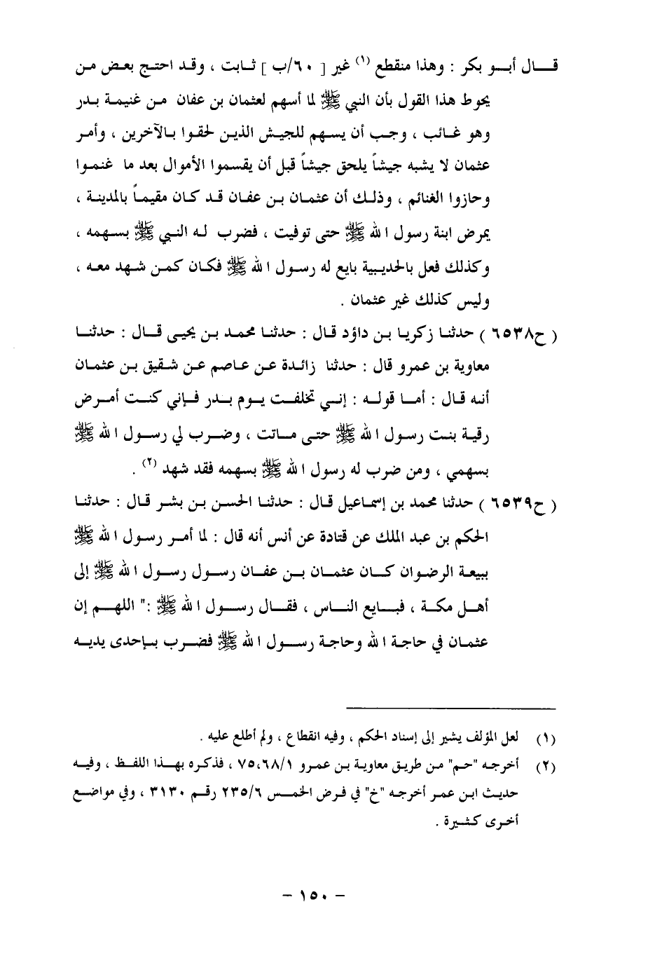 6538 - حَدَّثَنَا زَكَرِيَّا بْنُ دَاوُدَ، قَالَ: حَدَّثَنَا مُحَمَّدُ بْنُ يَحْيَى، قَالَ: حَدَّثَنَا مُعَاوِيَةُ بْنُ عَمْرٍو، حَدَّثَنَا زَائِدَةُ، عَنْ عَاصِمٍ، عَنْ شَقِيقِ عَنْ عُثْمَانَ، أَنَّهُ قَالَ: أَمَّا قَوْلُهُ: إِنِّي تَخَلَّفْتُ يَوْمَ بَدْرٍ، فَإِنِّي كُنْتُ أُمَرِّضُ رُقَيَّةَ بِنْتَ رَسُولِ اللهِ صَلَّى اللَّهُ عَلَيْهِ وَسَلَّمَ، حَتَّى مَاتَتْ، وَضَرَبَ لِي رَسُولُ اللهِ صَلَّى اللَّهُ عَلَيْهِ وَسَلَّمَ بِسَهْمِي، وَمَنْ ضَرَبَ لَهُ رَسُولُ اللهِ صَلَّى اللَّهُ عَلَيْهِ وَسَلَّمَ بِسَهْمِهِ، فَقَدْ شَهِدَ