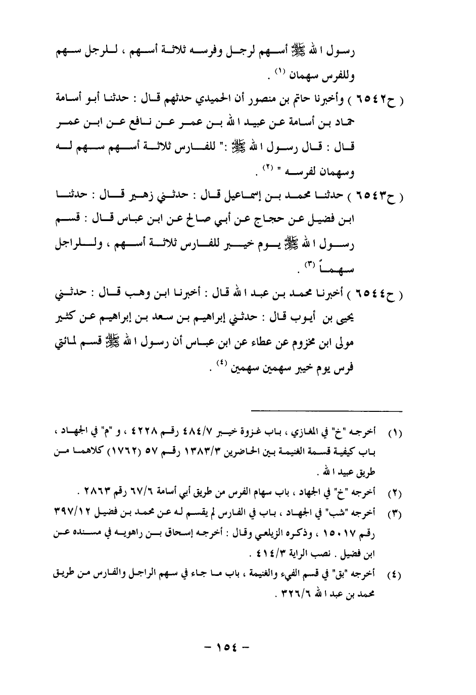 6542 - وَأَخْبَرَنَا حَاتِمُ بْنُ مَيْمُونٍ، أَنَّ الْحُمَيْدِيَّ حَدَّثَهُمْ قَالَ: حَدَّثَنَا أَبُو أُسَامَةَ حَمَّادُ بْنُ أُسَامَةَ، عَنْ عُبَيْدِ اللهِ بْنِ عُمَرَ، عَنْ نَافِعٍ، عَنِ ابْنِ عُمَرَ قَالَ: قَالَ رَسُولُ اللهِ صَلَّى اللَّهُ عَلَيْهِ وَسَلَّمَ: «لِلْفَارِسِ ثَلَاثَةُ أَسْهُمٍ سَهْمٌ لَهُ، وَسَهْمَانِ لِفَرَسِهِ»