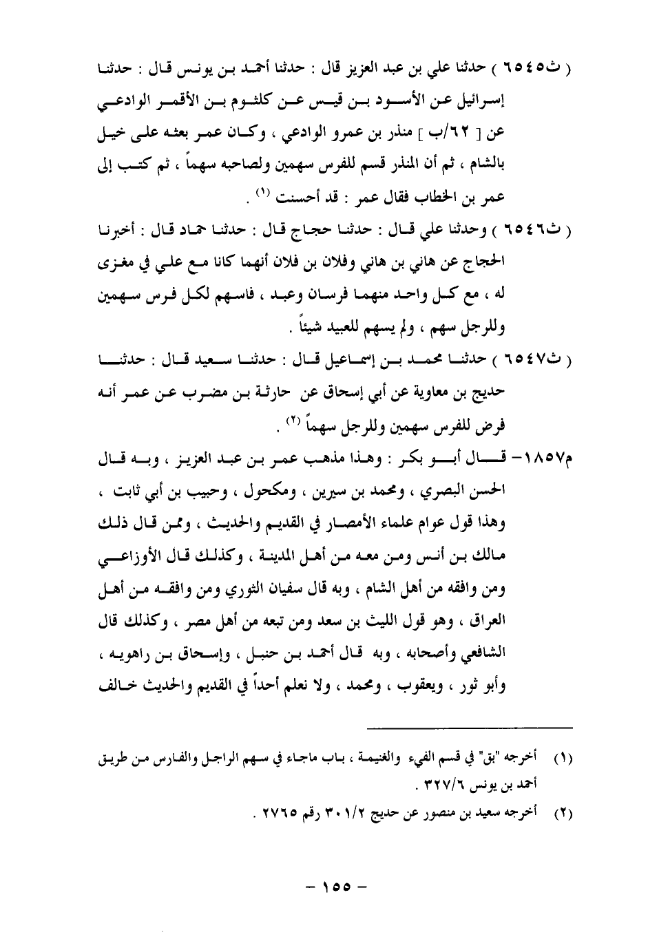 6547 - حَدَّثَنَا مُحَمَّدُ بْنُ إِسْمَاعِيلَ، قَالَ: حَدَّثَنَا سَعِيدٌ، قَالَ: حَدَّثَنَا حُدَيْجُ بْنُ مُعَاوِيَةَ، عَنْ أَبِي إِسْحَاقَ، عَنْ حَارِثَةَ بْنِ مُضَرِّبٍ، عَنْ عُمَرَ، أَنَّهُ فَرَضَ لِلْفَرَسِ سَهْمَيْنِ، وَلِلرَّجُلِ سَهْمًا قَالَ أَبُو بَكْرٍ: وَهَذَا مَذْهَبُ عُمَرَ بْنِ عَبْدِ الْعَزِيزِ، وَبِهِ قَالَ الْحَسَنُ الْبَصْرِيُّ، وَمُحَمَّدُ بْنُ سِيرِينَ، وَمَكْحُولٌ، وَحَبِيبُ بْنُ أَبِي ثَابِتٍ، وَهَذَا قَوْلُ عَوَامِّ عُلَمَاءِ الْأَمْصَارِ فِي الْقَدِيمِ وَالْحَدِيثِ، وَمِمَّنْ قَالَ ذَلِكَ مَالِكُ بْنُ أَنَسٍ، وَمَنْ مَعَهُ مِنْ أَهْلِ الْمَدِينَةِ، وَكَذَلِكَ قَالَ الْأَوْزَاعِيُّ، وَمَنْ وَافَقَهُ مِنْ أَهْلِ الشَّامِ، وَبِهِ قَالَ سُفْيَانُ الثَّوْرِيُّ وَمَنْ وَافَقَهُ مِنْ أَهْلِ الْعِرَاقِ، وَهُوَ قَوْلُ اللَّيْثِ بْنِ سَعْدٍ وَمَنْ تَبِعَهُ مِنْ أَهْلِ مِصْرَ، وَكَذَلِكَ قَالَ الشَّافِعِيُّ وَأَصْحَابُهُ، وَبِهِ قَالَ أَحْمَدُ بْنُ حَنْبَلٍ، وَإِسْحَاقُ بْنُ رَاهَوَيْهِ، وَأَبُو ثَوْرٍ، وَيَعْقُوبُ، وَمُحَمَّدٌ، وَلَا نَعْلَمُ أَحَدًا فِي الْقَدِيمِ وَالْحَدِيثِ خَالَفَ -[156]- ذَلِكَ، وَلَا عَدَلَ عَنِ الْقَوْلِ بِمَا يُثَبِّتُ بِهِ الْأَخْبَارَ عَنْ رَسُولِ اللهِ صَلَّى اللَّهُ عَلَيْهِ وَسَلَّمَ، وَمَا كَانَ عَلَيْهِ جُمْلَةُ أَهْلِ الْعِلْمِ فِي كُلِّ وَقْتٍ، إِلَّا النُّعْمَانَ فَإِنَّهُ خَالَفَ كُلَّ مَا ذَكَرْنَاهُ، فَقَالَ: لَا يُسْهَمُ لِلْفَرَسِ إِلَّا سَهْمًا وَاحِدًا، وَخَالَفَهُ أَصْحَابُهُ فَبَقِيَ قَوْلُهُ مَهْجُورًا مُخَالِفًا لِلْأَخْبَارِ الَّتِي ذَكَرْنَاهَا عَنْ رَسُولِ اللهِ صَلَّى اللَّهُ عَلَيْهِ وَسَلَّمَ، وَعَنْ مَنْ بَعْدَ رَسُولِ اللهِ صَلَّى اللَّهُ عَلَيْهِ وَسَلَّمَ. وَقَالَ الشَّافِعِيُّ: فَأَمَّا مَا حَكَى أَبُو يُوسُفَ، عَنْ أَبِي حَنِيفَةَ أَنَّهُ قَالَ: لَا أُفَضِّلُ بَهِيمَةً عَلَى مُسْلِمٍ فَلَوْ لَمْ يَكُنْ فِي هَذَا خَبَرٌ عَنْ رَسُولِ اللهِ صَلَّى اللَّهُ عَلَيْهِ وَسَلَّمَ يَكُونُ مَحْجُوجًا بِخِلَافِهِ، كَانَ قَوْلُهُ: لَا أُفَضِّلُ بَهِيمَةً عَلَى مُسْلِمٍ خَطَأً مِنْ جِهَتَيْنِ أَحَدُهُمَا: أَنَّهُ إِنْ كَانَ إِنَّمَا أُعْطِيَ بِسَبَبِ الْفَرَسِ سَهْمَيْنِ كَانَ مُفَضِّلًا لَهُ عَلَى الْمُسْلِمِ، إِذْ كَانَ إِنَّمَا يُعْطِي الْمُسْلِمَ سَهْمًا انْبَغَى لَهُ أَنْ لَا يُسَوِّيَ الْبَهِيمَةَ بِالْمُسْلِمِ، وَلَا يُقَرِّبَهَا مِنْهُ، وَإِنْ كَانَ هَذَا كَلَامًا عَرَبِيًّا، وَإِنَّمَا مَعْنَاهُ أَنْ يُعْطِيَ الْفَارِسَ سَهْمًا لَهُ، وَسَهْمَانِ بِسَبَبِ فَرَسِهِ، لِأَنَّ اللهَ نَدَبَ إِلَى اتِّخَاذِ الْخَيْلِ، فَقَالَ: {وَأَعِدُّوا لَهُمْ مَا اسْتَطَعْتُمْ مِنْ قُوَّةٍ وَمِنْ رِبَاطِ الْخَيْلِ} [الأنفال: 60] الْآيَةَ، وَأَعْطَاهُمْ رَسُولُ اللهِ صَلَّى اللَّهُ عَلَيْهِ وَسَلَّمَ كَمَا وَصَفْنَا، فَإِنَّمَا سَهْمَا الْفَرَسِ لِرَاكِبِهِ لَا لِلْفَرَسِ، وَالْفَرَسُ لَا يَمْلِكُ شَيْئًا، إِنَّمَا يَمْلِكُهُ فَارِسُهُ بِغِذَاءِ الْفَرَسِ، وَالْمُؤْتَةِ عَلَيْهِ فِيهِ، وَمَا مَلَّكَهُ بِهِ رَسُولُ اللهِ صَلَّى اللَّهُ عَلَيْهِ وَسَلَّمَ