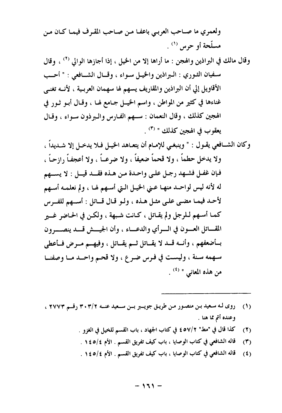 وَلَعَمْرِي مَا صَاحِبُ الْعَرَبِيِّ بِأَعْفَا مِنْ صَاحِبِ الْمُقْرِفِ، فِيمَا كَانَ مِنْ مُسَلَّحَةٍ، أَوْ حَرَسٍ وَقَالَ مَالِكٌ فِي الْبَرَاذِينَ وَالْهُجْنِ: مَا أَرَاهَا إِلَّا مِنَ الْخَيْلِ، إِذَا أَجَازَهَا الْوَالِي، قَالَ سُفْيَانُ الثَّوْرِيُّ: الْبَرَاذِينُ وَالْهُجْنُ سَوَاءٌ، وَقَالَ الشَّافِعِيُّ: أَحَبُّ الْأَقَاوِيلِ إِلَيَّ: أَنَّ الْبَرَاذِينَ، وَالْمَقَارِيفَ يُسْهَمُ لَهَا سُهْمَانَ الْعَرَبِيَّةِ، لِأَنَّهُ تُغْنِي غِنَاءَهَا فِي كَثِيرٍ مِنَ الْمَوَاطِنِ، وَاسْمُ الْخَيْلِ جَامِعٌ لَهَا، وَقَالَ أَبُو ثَوْرٍ فِي الْهَجِينِ كَذَلِكَ، وَقَالَ النُّعْمَانُ: سَهْمُ الْفَارِسِ وَالْبِرْذَوْنِ سَوَاءٌ، وَقَالَ يَعْقُوبُ فِي الْهَجِينِ كَذَلِكَ. وَكَانَ الشَّافِعِيُّ يَقُولُ: وَيَنْبَغِي لِلْإِمَامِ أَنْ يَتَعَاهَدَ الْخَيْلَ، فَلَا يُدْخِلُ إِلَّا شَدِيدًا، وَلَا يُدْخِلُ حَطِمًا، وَلَا قَحْمًا ضَعِيفًا، وَلَا ضَرَعًا، وَلَا أَعْجَفَ رَازِحًا، فَإِنْ غَفَلَ فَشَهِدَ رَجُلًا عَلَى وَاحِدَةٍ مِنْ هَذِهِ، فَقَدْ قِيلَ: لَا يُسْهِمُ لَهُ لِأَنَّهُ لَيْسَ لِوَاحِدٍ مِنْهَا مِنَ الْخَيْلِ الَّتِي أَسْهَمَ لَهَا، وَلَمْ نَعْلَمْهُ أَسْهَمَ لِأَحَدٍ فِيمَا مَضَى عَلَى مِثْلِ هَذِهِ، وَلَوْ قَالَ قَائِلٌ: أَسْهَمَ لِلْفَرَسِ كَمَا أَسْهَمَ لِلرَّجُلِ وَلَمْ يُقَاتِلْ كَانَتْ شُبْهَةً، وَلَكِنْ فِي الْحَاضِرِ غَيْرُ الْمُقَاتِلِ الْعَوْنُ فِي الرَّأْيِ وَالدُّعَاءِ، وَأَنَّ الْجَيْشَ قَدْ يُنْصَرُونَ بِأَضْعَفِهِمْ، وَأَنَّهُ قَدْ لَا يُقَاتِلُ ثُمَّ يُقَاتِلُ وَفِيهِمْ مَرَضٌ، فَأَعْطَى سَهْمَهُ سُنَّةً، وَلَيْسَتْ فِي فَرَسٍ ضَرَعٌ، وَلَا قَحْمٌ وَاحِدٌ مَا وَصَفْنَا مِنْ هَذِهِ الْمَعَانِي