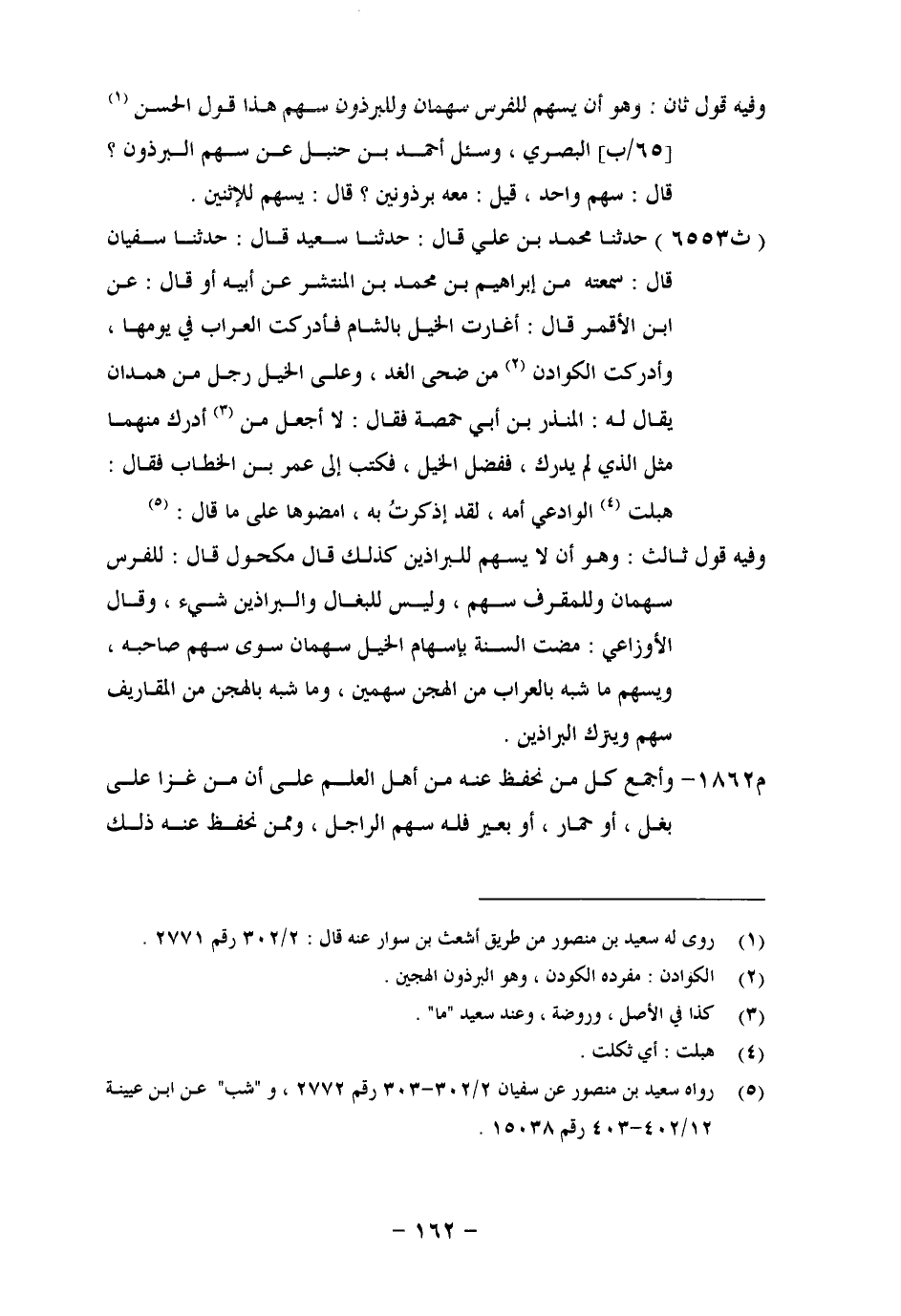 6553 - حَدَّثَنَا مُحَمَّدُ بْنُ عَلِيٍّ، قَالَ: حَدَّثَنَا سَعِيدٌ، قَالَ: حَدَّثَنَا سُفْيَانُ، قَالَ: سَمِعْتُهُ مِنْ، إِبْرَاهِيمَ بْنِ مُحَمَّدِ بْنِ الْمُنْتَشِرِ، عَنْ أَبِيهِ، أَوْ قَالَ: عَنِ ابْنِ الْأَقْمَرِ، قَالَ: أَغَارَتِ الْخَيْلُ بِالشَّامِ، فَأَدْرَكَتِ الْعِرَابَ فِي يَوْمِهَا، وَأَدْرَكَتِ الْكَوَادِنَ مِنْ ضُحَى الْغَدِ، وَعَلَى الْخَيْلِ رَجُلٌ مِنْ هَمْدَانَ يُقَالُ لَهُ: الْمُنْذِرُ بْنُ أَبِي حِمْصَةَ، فَقَالَ: لَا أَجْعَلُ مَنْ أَدْرَكَ مِنْهُمَا مِثْلَ الَّذِي لَمْ يُدْرِكْ، فَفَضَّلَ الْخَيْلَ، فَكَتَبَ إِلَى عُمَرَ بْنِ الْخَطَّابِ، فَقَالَ: هَبَلَتِ الْوَادِعِيَّ أُمُّهُ، لَقَدْ أَذْكَتْ بِهِ، أَمْضُوهَا عَلَى مَا قَالَ وَفِيهِ قَوْلٌ ثَالِثٌ: وَهُوَ أَنْ لَا يُسْهِمَ لِلْبَرَاذِينَ كَذَلِكَ، قَالَ مَكْحُولٌ قَالَ: لِلْفَرَسِ سَهْمَانِ، وَلِلْمُقْرِفِ سَهْمٌ، وَلَيْسَ لِلْبِغَالِ وَالْبَرَاذِينَ شَيْءٌ، وَقَالَ الْأَوْزَاعِيُّ: مَضَتِ السُّنَّةُ بِإِسْهَامِ الْخَيْلِ سَهْمَانِ سِوَى سَهْمِ صَاحِبِهِ، وَيُسْهِمُ مَا شُبِّهَ بِالْعِرَابِ مِنَ الْهُجْنِ سَهْمَيْنِ، وَمَا شُبِّهَ بِالْهُجْنِ مِنَ الْمَقَارِيفِ سَهْمًا، وَيَتْرُكُ الْبَرَاذِينَ وَأَجْمَعَ كُلُّ مَنْ نَحْفَظُ عَنْهُ مِنْ أَهْلِ الْعِلْمِ عَلَى أَنَّ مَنْ غَزَا عَلَى بَغْلٍ، أَوْ حِمَارٍ، أَوْ بَعِيرٍ فَلَهُ سَهْمُ الرَّاجِلِ، وَمِمَّنْ نَحْفَظُ عَنْهُ ذَلِكَ -[163]- الْحَسَنُ الْبَصْرِيُّ، وَمَكْحُولٌ، وَسُفْيَانُ الثَّوْرِيُّ، وَالشَّافِعِيُّ، وَأَبُو ثَوْرٍ، وَأَصْحَابُ الرَّأْيِ، وَلَا أَعْلَمُ أَحَدًا خَالَفَ ذَلِكَ