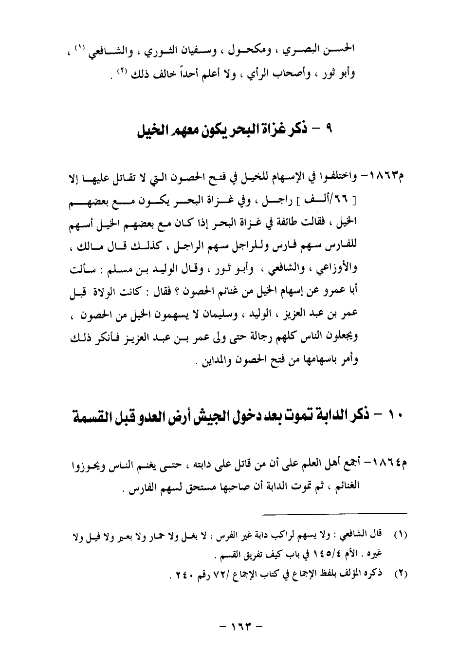 ذِكْرُ غُزَاةِ الْبَحْرِ يَكُونُ مَعَهُمُ الْخَيْلُ وَاخْتَلَفُوا فِي الْإِسْهَامِ لِلْخَيْلِ فِي فَتْحِ الْحُصُونِ الَّتِي لَا تُقَاتِلُ عَلَيْهَا إِلَّا رَاجِلٌ وَفِي غُزَاةِ الْبَحْرِ يَكُونُ مَعَ بَعْضِهِمُ الْخَيْلُ، فَقَالَتْ طَائِفَةٌ فِي غُزَاةِ الْبَحْرِ: إِذَا كَانَ مَعَ بَعْضِهِمُ الْخَيْلُ أُسْهِمَ لِلْفَارِسِ سَهْمَ فَارِسٍ، وَلِلرَّاجِلِ سَهْمَ الرَّاجِلِ، كَذَلِكَ قَالَ مَالِكٌ، وَالْأَوْزَاعِيُّ، وَالشَّافِعِيُّ، وَأَبُو ثَوْرٍ، وَقَالَ الْوَلِيدُ بْنُ مُسْلِمٍ: سَأَلْتُ أَبَا عَمْرٍو، عَنْ إِسهامِ الْخَيْلِ مِنْ غَنَائِمِ الْحُصُونِ؟ فَقَالَ: كَانَتِ الْوُلَاةُ قَبْلَ عُمَرَ بْنِ عَبْدِ الْعَزِيزِ: الْوَلِيدُ، وَسُلَيْمَانُ لَا يُسْهِمُونَ الْخَيْلَ مِنَ الْحُصُونِ، وَيَجْعَلُونَ النَّاسَ كُلَّهُمْ رَجَّالَةً، حَتَّى وَلِيَ عُمَرُ بْنُ عَبْدِ الْعَزِيزِ، فَأَنْكَرَ ذَلِكَ، وَأَمَرَ بِإِسْهَامِهَا مِنْ فَتْحِ الْحُصُونِ وَالْمَدَائِنِ
