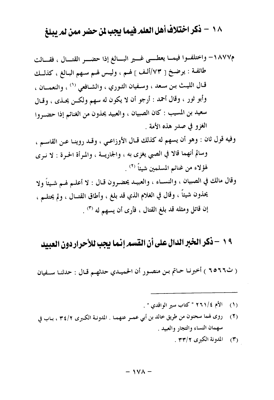 ذِكْرُ اخْتِلَافِ أَهْلِ الْعِلْمِ فِيمَا يَجِبُ لِمَنْ حَضَرَ مِمَّنْ لَمْ يَبْلُغْ وَاخْتَلَفُوا فِيمَا يُعْطَى غَيْرُ الْبَالِغِ، إِذَا حَضَرَ الْقِتَالَ، فَقَالَتْ طَائِفَةٌ: يُرْضَخُ لَهُمْ، وَلَيْسَ لَهُمْ سَهْمُ الْبَالِغِ، كَذَلِكَ قَالَ اللَّيْثُ بْنُ سَعْدٍ، وَسُفْيَانُ الثَّوْرِيُّ، وَالشَّافِعِيُّ، وَالنُّعْمَانُ، وَأَبُو ثَوْرٍ، وَقَالَ أَحْمَدُ: أَرْجُو أَنْ لَا يَكُونَ لَهُ سَهْمٌ، وَلَكِنْ يُحْذَى، وَقَالَ سَعِيدُ بْنُ الْمُسَيِّبِ: كَانَ الصِّبْيَانُ، وَالْعَبِيدُ يُحْذَوْنَ مِنَ الْغَنَائِمِ، إِذَا حَضَرُوا الْغَزْوَ فِي صَدْرِ هَذِهِ الْأُمَّةِ. وَفِيهِ قَوْلٌ ثَانٍ: وَهُوَ أَنْ يُسْهَمَ لَهُ، كَذَلِكَ قَالَ الْأَوْزَاعِيُّ، وَقَدْ رُوِّينَا عَنِ الْقَاسِمِ، وَسَالِمٍ أَنَّهُمَا قَالَا فِي الصَّبِيِّ يُغْزَى بِهِ، وَالْجَارِيَةِ، وَالْمَرْأَةِ الْحُرَّةِ: لَا نَرَى لِهَؤُلَاءِ مِنْ غَنَائِمِ الْمُسْلِمِينَ شَيْئًا، قَالَ مَالِكٌ فِي الصِّبْيَانِ، وَالنِّسَاءِ، وَالْعَبِيدِ يَحْضُرُونَ، قَالَ: لَا أَعْلَمُ لَهُمْ شَيْئًا، وَلَا يُحْذَوْنَ شَيْئًا، وَقَالَ فِي الْغُلَامِ الَّذِي قَدْ بَلَغَ، وَأَطَاقَ الْقِتَالَ، وَلَمْ يَحْتَلِمْ: إِنْ قَاتَلَ، وَمِثْلُهُ قَدْ بَلَغَ الْقِتَالَ، فَأَرَى أَنْ يُسْهَمَ لَهُ