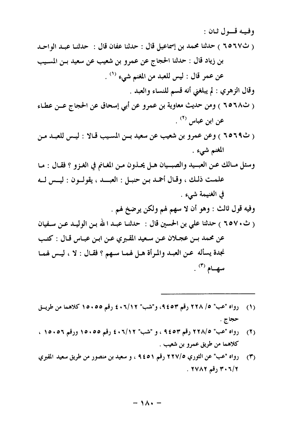 6569 - وَعَنْ عَمْرِو بْنِ شُعَيْبٍ، عَنْ سَعِيدِ بْنِ الْمُسَيِّبِ، قَالَا: لَيْسَ لِلْعَبْدِ مِنَ الْمَغْنَمِ شَيْءٌ وَسُئِلَ مَالِكٌ عَنِ الْعَبِيدِ، وَالصِّبْيَانِ، هَلْ يُحْذَوْنَ مِنَ الْمَغَانِمِ فِي الْغَزْوِ؟، فَقَالَ: مَا عَلِمْتُ ذَلِكَ. وَقَالَ أَحْمَدُ بْنُ حَنْبَلٍ: الْعَبْدُ، يَقُولُونَ: لَيْسَ لَهُ فِي الْغَنِيمَةِ شَيْءٌ وَفِيهِ قَوْلٌ ثَالِثٌ: وَهُوَ أَنْ لَا سَهْمَ لَهُمْ، وَلَكِنْ يُرْضَخُ لَهُمْ