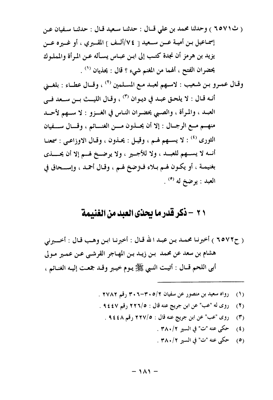 6571 - وَحَدَّثَنَا مُحَمَّدُ بْنُ عَلِيٍّ، قَالَ: حَدَّثَنَا سَعِيدٌ، قَالَ: حَدَّثَنَا سُفْيَانُ، عَنْ إِسْمَاعِيلَ بْنِ أُمَيَّةَ، عَنْ سَعِيدٍ الْمَقْبُرِيِّ، أَوْ غَيْرِهِ، عَنْ يَزِيدَ بْنِ هُرْمُزَ، أَنَّ نَجْدَةَ كَتَبَ إِلَى ابْنِ عَبَّاسٍ يَسْأَلُهُ عَنِ الْمَرْأَةِ، وَالْمَمْلُوكِ، يَحْضُرَانِ الْفَتْحَ أَلَهُمَا مِنَ الْمَغْنَمِ شَيْءٍ؟ قَالَ: يُحْذَيَانِ وَقَالَ عَمْرُو بْنُ شُعَيْبٍ: لَا سَهْمَ لِعَبْدٍ مَعَ الْمُسْلِمِينَ، وَقَالَ عَطَاءٌ: بَلَغَنِي أَنَّهُ قَالَ: لَا يُلْحَقُ عَبْدٌ فِي دِيوَانٍ، وَقَالَ اللَّيْثُ بْنُ سَعْدٍ فِي الْعَبْدِ، وَالْمَرْأَةِ، وَالصَّبِيِّ يَحْضُرُونَ النَّاسَ فِي الْغَزْوِ: لَا سَهْمَ لِأَحَدٍ مِنْهُمْ مَعَ الرِّجَالِ إِلَّا أَنْ يُحْذَوْنَ مِنَ الْغَنَائِمِ، وَقَالَ سُفْيَانُ الثَّوْرِيُّ: لَا يُسْهَمُ لَهُمْ، وَقِيلَ: يُحْذَوْنَ، وَقَالَ الْأَوْزَاعِيُّ: سَمِعْنَا أَنَّهُ لَا يُسْهَمُ لِلْعَبْدِ، وَلَا لِلْأَجِيرِ، وَلَا يُرْضَخُ لَهُمْ، إِلَّا أَنْ يُحْذَى بِغَنِيمَةٍ، أَوْ يَكُونَ لَهُمْ بَلَاءٌ، فَتُرْضَخَ لَهُمْ، وَقَالَ أَحْمَدُ، وَإِسْحَاقُ فِي الْعَبْدِ: يُرْضَخُ لَهُ