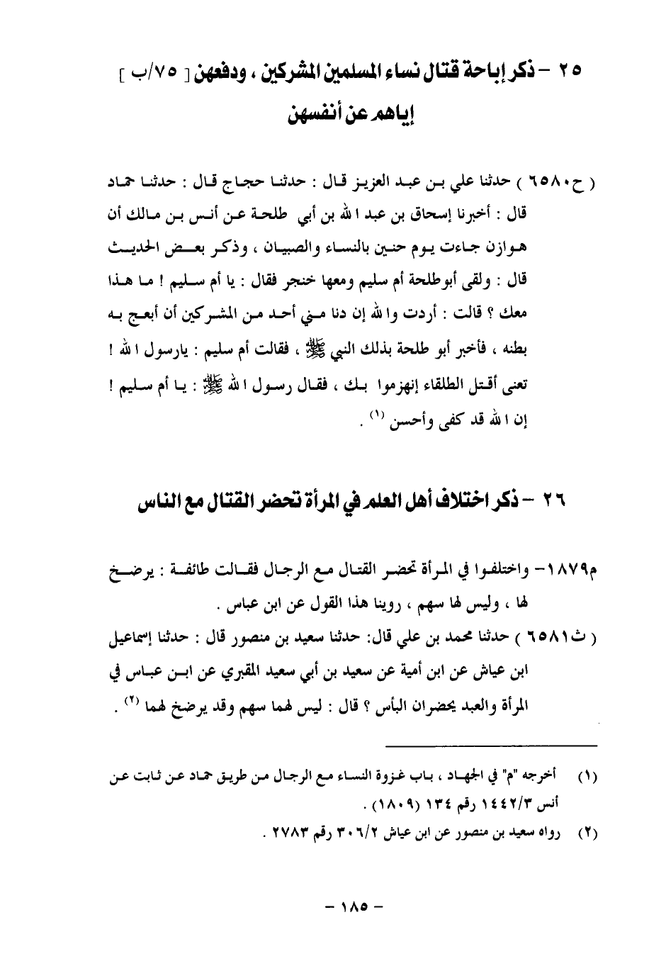 6581 - حَدَّثَنَا مُحَمَّدُ بْنُ عَلِيٍّ، قَالَ: حَدَّثَنَا سَعِيدُ بْنُ مَنْصُورٍ، قَالَ: حَدَّثَنَا إِسْمَاعِيلُ بْنُ عَيَّاشٍ، عَنِ ابْنِ أُمَيَّةَ، عَنْ سَعِيدِ بْنِ أَبِي سَعِيدٍ الْمَقْبُرِيِّ، عَنِ ابْنِ عَبَّاسٍ، فِي الْمَرْأَةِ وَالْعَبْدِ يَحْضُرَانِ الْبَأْسَ، قَالَ: لَيْسَ لَهُمَا سَهْمٌ، وَقَدْ يُرْضَخُ لَهُمَا -[186]- وَقَالَ سَعِيدُ بْنُ الْمُسَيِّبِ: كَانَ الصِّبْيَانُ وَالْعَبِيدُ يُحْذَوْنَ مِنَ الْغَنَائِمِ إِذَا حَضَرُوا الْغَزْوَ فِي سَلَفِ هَذِهِ الْأُمَّةِ، وَبِهِ قَالَ اللَّيْثُ بْنُ سَعْدٍ، وَالشَّافِعِيُّ، وَالنُّعْمَانُ، وَأَبُو ثَوْرٍ، وَقَالَ سُفْيَانِ الثَّوْرِيِّ: لَا يُسْهَمُ لِلنِّسَاءِ، وَلَا لِلْمَمْلُوكِ، وَبَلَغَنِي أَنَّهُمْ كَانُوا يُحْذَوْنَ. وَفِيهِ قَوْلٌ ثَانٍ: وَهُوَ أَنْ لَا يُسْهَمَ لَهُمْ، وَلَا يُحْذَيْنَ شَيْئًا، هَذَا قَوْلُ مَالِكٍ