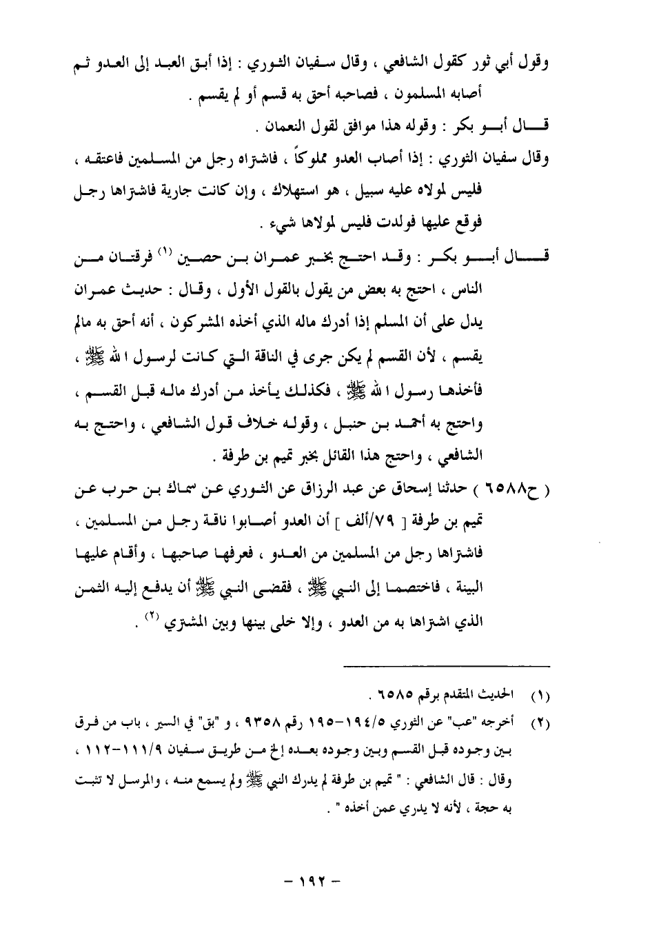 6588 - حَدَّثَنَا إِسْحَاقُ، عَنْ عَبْدِ الرَّزَّاقِ، عَنِ الثَّوْرِيِّ، عَنْ سِمَاكِ بْنِ حَرْبٍ، عَنْ تَمِيمِ بْنِ طَرَفَةَ، أَنَّ الْعَدُوَّ، أَصَابُوا نَاقَةَ رَجُلٍ مِنَ الْمُسْلِمِينَ، فَاشْتَرَاهَا رَجُلٌ مِنَ الْمُسْلِمِينَ مِنَ الْعَدُوِّ، فَعَرَفَهَا صَاحِبُهَا، وَأَقَامَ عَلَيْهَا الْبَيِّنَةَ، فَاخْتَصَمْا إِلَى رَسُولِ اللهِ صَلَّى اللَّهُ عَلَيْهِ وَسَلَّمَ، فَقَضَى رَسُولُ اللهِ صَلَّى اللَّهُ عَلَيْهِ وَسَلَّمَ أَنْ يَدْفَعَ إِلَيْهِ الثَّمَنَ الَّذِي اشْتَرَاهَا بِهِ مِنَ الْعَدُوِّ، وَإِلَّا خَلَّى بَيْنَهَا وَبَيْنَ الْمُشْتَرِي -[193]- وَدَفَعَ هَذَا الْقَائِلُ خَبَرَ ابْنِ عُمَرَ، وَقَالَ: لَيْسَ فِيهِ لِمَنْ خَالَفَنَا حُجَّةٌ، قَالَ: وَذَلِكَ أَنَّ فَرَسَ ابْنِ عُمَرَ عَادَ، فَلَحِقَ بِالرُّومِ، وَبَيْنَ الْعَائِدِ، وَالْآبِقِ، وَالْمَغْلُوبِ عَلَيْهِ فَرْقٌ قَالَ أَبُو بَكْرٍ: وَلَا أَعْلَمُ أَنَّهُ فَرَّقَ بَيْنَهُمَا بِفَرْقٍ يُلْزِمُ غَيْرَ قَوْلِهِ، بَيْنَ ذَلِكَ فَرْقٌ، وَذَكَرَ كَلَامًا طَوِيلًا، قَدْ أَثْبَتُّهُ فِي الْكِتَابِ الَّذِي اخْتَصَرْتُ مِنْهُ هَذَا الْكِتَابَ، تَرَكْتُهُ؛ طَلَبًا لِلِاخْتِصَارِ قَالَ أَبُو بَكْرٍ: وَالَّذِي بِهِ أَقُولُ: إِنَّ مَا هُوَ مِلْكٌ لِلْمُسْلِمِ لَا يَجُوزُ نَقْلُهُ عَنْهُ إِلَّا بِحُجَّةٍ، وَلَا نَعْلَمُ مَعَ مَنْ أَوْجَبَ مِلْكَ الْعَدُوِّ عَلَيْهِ، وَنَقْلَ مِلْكِ الْمُسْلِمِ عَنْهُ حُجَّةً مِنْ كِتَابٍ، وَلَا سُنَّةٍ، وَلَا إِجْمَاعٍ، إِلَّا دَعْوَاهُ الَّذِي لَا حُجَّةَ مَعَهُ، وَمَالُ الْمُسْلِمِ لَا يَحِلُّ إِلَّا بِطِيبِ نَفْسٍ مِنْهُ، أَوْ بِحُكْمٍ يُلْزِمُهُ، فَمَنْ أَزَالَ مِلْكَ الْمُسْلِمِ عَمَّا كَانَ مِلْكَهُ لَهُ بِإِجْمَاعٍ بِغَيْرِ إِجْمَاعٍ، لَمْ يَجِبْ قَبُولُ ذَلِكَ مِنْهُ، وَذَلِكَ أَنَّ الْإِجْمَاعَ يَقِينٌ، وَالِاخْتِلَافَ شَكٌّ، وَلَا يَجُوزُ الِانْتِقَالُ عَنِ الْيَقِينِ إِلَى الشَّكِّ