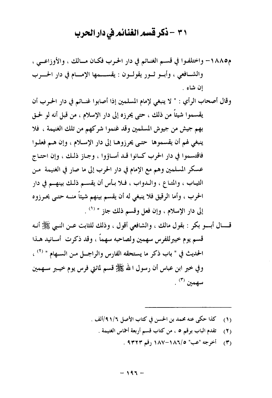 ذِكْرُ قَسْمِ الْغَنَائِمِ فِي دَارِ الْحَرْبِ وَاخْتَلَفُوا فِي قَسْمِ الْغَنَائِمِ فِي دَارِ الْحَرْبِ، فَكَانَ مَالِكٌ، وَالْأَوْزَاعِيُّ، وَالشَّافِعِيُّ، وَأَبُو ثَوْرٍ يَقُولُونَ: يَقْسِمُهَا الْإِمَامُ فِي دَارِ الْحَرْبِ إِنْ شَاءَ، وَقَالَ أَصْحَابُ الرَّأْيِ: لَا يَنْبَغِي لِإِمَامِ الْمُسْلِمِينَ إِذَا أَصَابُوا غَنَائِمَ فِي دَارِ الْحَرْبِ، أَنْ يَقْسِمُوا شَيْئًا مِنْ ذَلِكَ، حَتَّى يُحْرِزُوهُ إِلَى دَارِ الْإِسْلَامِ، مِنْ قِبَلِ أَنَّهُ لَوْ لَحِقَ بِهِمْ جَيْشٌ مِنْ جُيُوشِ الْمُسْلِمِينَ، وَقَدْ غَنِمُوا شَرَكَهُمْ مِنْ تِلْكَ الْغَنِيمَةِ، فَلَا يَنْبَغِي لَهُمْ أَنْ يَقْسِمُوهَا، حَتَّى يُحْرِزُوهَا، قَدْ أَسَاءُوا، وَجَازَ ذَلِكَ، وَإِنِ احْتَاجَ عَسْكَرُ الْمُسْلِمِينَ، وَهُمْ مَعَ الْإِمَامِ فِي دَارِ الْحَرْبِ إِلَى مَا صَارَ فِي الْغَنِيمَةِ مِنَ الثِّيَابِ، وَالْمَتَاعِ، وَالدَّوَابِّ، وَلَا بَأْسَ أَنْ يَقْسِمَ ذَلِكَ بَيْنَهُمْ فِي دَارِ الْحَرْبِ، وَأَمَّا الرَّقِيقُ، فَلَا يَنْبَغِي لَهُ أَنْ يَقْسِمَ بَيْنَهُمْ شَيْئًا مِنْهُ حَتَّى يُحْرِزُوهُ إِلَى دَارِ الْإِسْلَامِ، وَإِنْ فَعَلَ وَقَسَمَ ذَلِكَ جَازَ قَالَ أَبُو بَكْرٍ: بِقَوْلِ مَالِكٍ، وَالشَّافِعِيِّ أَقُولَ؛ وَذَلِكَ لِلثَّابِتِ عَنْ رَسُولِ اللهِ صَلَّى اللَّهُ عَلَيْهِ وَسَلَّمَ أَنَّهُ قَسَمَ يَوْمَ خَيْبَرَ لِلْفَرَسِ سَهْمَيْنِ، وَلِصَاحِبِهِ سَهْمًا، وَقَدْ ذَكَرْتُ أَسَانِيدَ هَذَا الْحَدِيثِ فِي بَابِ ذِكْرِ مَا يَسْتَحِقُّهُ الْفَارِسُ، وَالرَّاجِلُ مِنَ السِّهَامِ، وَفِي خَبَرِ ابْنِ عَبَّاسٍ أَنَّ رَسُولَ اللهِ صَلَّى اللَّهُ عَلَيْهِ وَسَلَّمَ قَسَمَ لِمِائَتَيْ فَرَسٍ يَوْمَ خَيْبَرَ سَهْمَيْنِ، سَهْمَيْنِ