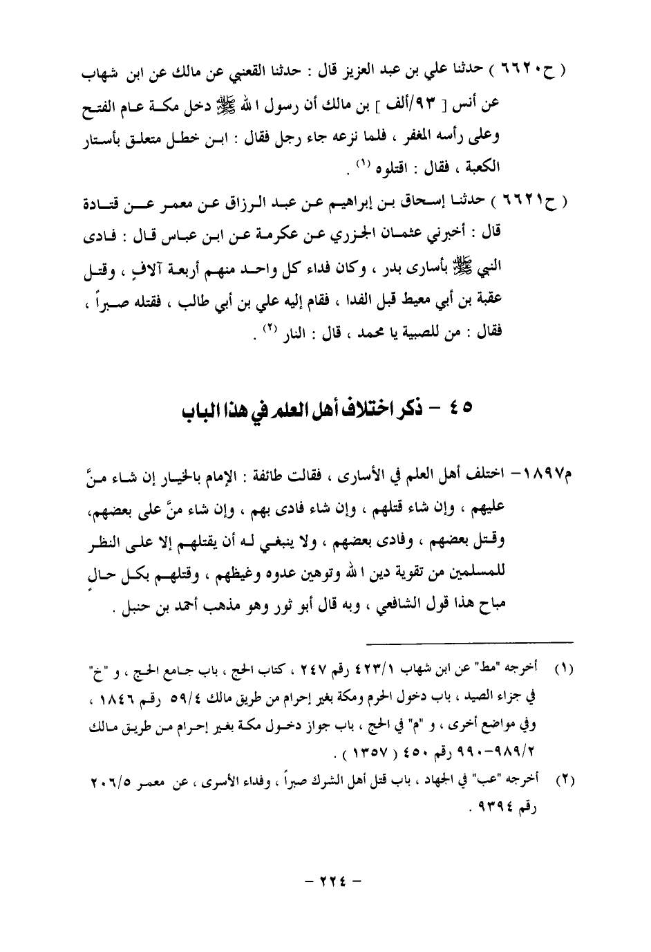 ذِكْرُ اخْتِلَافِ أَهْلِ الْعِلْمِ فِي هَذَا الْبَابِ اخْتَلَفَ أَهْلُ الْعِلْمِ فِي الْأُسَارَى، فَقَالَتْ طَائِفَةٌ: الْإِمَامُ بِالْخِيَارِ إِنْ شَاءَ مَنَّ عَلَيْهِمْ، وَإِنْ شَاءَ قَتَلَهُمْ، وَإِنْ شَاءَ فَادَى بِهِمْ، وَإِنْ شَاءَ مَنَّ عَلَى بَعْضِهِمْ، وَقَتَلَ بَعْضَهُمْ، وَفَادَى بَعْضَهُمْ، وَلَا يَنْبَغِي لَهُ أَنْ يَقْتُلَهُمْ إِلَّا عَلَى النَّظَرِ لِلْمُسْلِمِينَ مِنْ تَقْوِيَةِ دِينِ اللهِ وَتَوْهِينِ عَدُوِّهِ وَغَيْظِهِمْ، وَقَتْلِهِمْ بِكُلِّ حَالٍ مُبَاحٍ، هَذَا قَوْلُ الشَّافِعِيِّ، وَبِهِ قَالَ أَبُو ثَوْرٍ، وَهُوَ مَذْهَبُ أَحْمَدَ بْنِ حَنْبَلٍ.