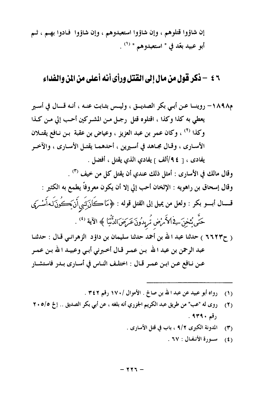 ذِكْرُ قَوْلِ مَنْ مَالَ إِلَى الْقَتْلِ وَرَأَى أَنَّهُ أَعْلَى مِنَ الْمَنِّ وَالْفِدَاءِ رُوِّينَا عَنْ أَبِي بَكْرٍ الصِّدِّيقِ، وَلَيْسَ بِثَابِتٍ عَنْهُ أَنَّهُ قَالَ فِي أَسِيرٍ: يُعْطَى بِهِ كَذَا وَكَذَا: اقْتُلُوهُ، قَتْلُ رَجُلٍ مِنَ الْمُشْرِكِينَ أَحَبُّ إِلَيَّ مِنْ كَذَا وَكَذَا، وَكَانَ عُمَرُ بْنُ عَبْدِ الْعَزِيزِ، وَعِيَاضُ بْنُ عُقْبَةَ بْنِ نَافِعٍ يَقْتُلَانِ الْأُسَارَى، وَقَالَ مُجَاهِدٌ فِي أَسِيرَيْنِ أَحَدُهُمَا يُقْتَلُ فِي الْأُسَارَى، وَالْآخَرُ يُفَادَى: يُفَادَى الَّذِي يُقْتَلُ أَفْضَلُ. وَقَالَ مَالِكٌ فِي الْأُسَارَى: أَمْثَلُ ذَلِكَ عِنْدِي أَنْ يُقْتَلَ كُلُّ مَنْ خِيفَ. وَقَالَ إِسْحَاقُ بْنُ رَاهَوَيْهِ: الْإِثْخَانُ أَحَبُّ إِلَيَّ إِلَّا أَنْ يَكُونَ مَعْرُوفًا يَطْمَعُ بِهِ الْكَثِيرُ، قَالَ أَبُو بَكْرٍ: وَلَعَلَّ مَنْ يَمِيلُ إِلَى الْقَتْلِ قَوْلُهُ: {مَا كَانَ لِنَبِيٍّ أَنْ يَكُونَ لَهُ أَسْرَى حَتَّى يُثْخِنَ فِي الْأَرْضِ تُرِيدُونَ عَرَضَ الدُّنْيَا} [الأنفال: 67] الْآيَةَ
