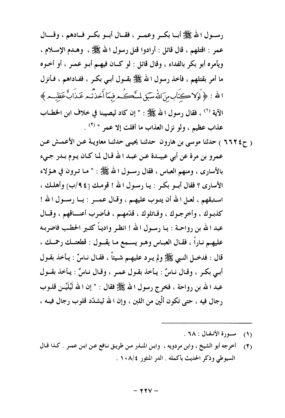 6624 - حَدَّثَنَا مُوسَى بْنُ هَارُونَ، حَدَّثَنَا يَحْيَى، حَدَّثَنَا مُعَاوِيَةُ، عَنِ الْأَعْمَشِ، عَنْ عَمْرِو بْنِ مُرَّةَ، عَنْ أَبِي عُبَيْدَةَ، عَنْ عَبْدِ اللهِ، قَالَ لَمَّا كَانَ يَوْمُ بَدْرٍ جِيءَ بِالْأَسَارَى، وَمِنْهُمُ الْعَبَّاسُ، فَقَالَ رَسُولُ اللهِ صَلَّى اللَّهُ عَلَيْهِ وَسَلَّمَ: «مَا تَرَوْنَ فِي هَؤُلَاءِ الْأُسَارَى؟» فَقَالَ أَبُو بَكْرٍ: يَا رَسُولَ اللهِ، قَوْمُكَ وَأَهْلُكَ، اسْتَبْقِهِمْ، لَعَلَّ اللهَ أَنْ يَتُوبَ عَلَيْهِمْ، وَقَالَ عُمَرُ: يَا رَسُولَ اللهِ، كَذَّبُوكَ، وَأَخْرَجُوكَ، وَقَاتَلُوكَ، قَدِّمْهُمْ، فَأَضْرِبْ أَعْنَاقَهُمْ، وَقَالَ عَبْدُ اللهِ بْنُ رَوَاحَةَ: يَا رَسُولَ اللهِ، انْظُرْ وَادِيًا كَثِيرَ الْحَطَبِ فَاضْرِبْهُ عَلَيْهِمْ نَارًا، فَقَالَ الْعَبَّاسُ وَهُوَ يَسْمَعُ مَا يَقُولُ: قَطَعَتْكَ رَحِمُكَ، قَالَ: فَدَخَلَ النَّبِيُّ صَلَّى اللَّهُ عَلَيْهِ وَسَلَّمَ وَلَمْ يَرُدَّ عَلَيْهِمْ شَيْئًا، فَقَالَ نَاسٌ: يَأْخُذُ بِقَوْلِ عَبْدِ اللهِ بْنِ رَوَاحَةَ، فَخَرَجَ رَسُولُ اللهِ صَلَّى اللَّهُ عَلَيْهِ وَسَلَّمَ فَقَالَ: " إِنَّ اللهَ لَيُلِينُ قُلُوبَ رِجَالٍ فِيهِ، حَتَّى تَكُونَ أَلْيَنَ مِنَ اللَّبَنِ، وَإِنَّ اللهَ لَيُشَدِّدُ قُلُوبَ رِجَالٍ فِيهِ، -[228]- حَتَّى تَكُونَ أَشَدَّ مِنَ الْحِجَارَةِ، مَثَلُكَ يَا أَبَا بَكْرٍ مَثَلُ إِبْرَاهِيمَ، قَالَ: {فَمَنْ تَبِعَنِي فَإِنَّهُ مِنِّي وَمَنْ عَصَانِي فَإِنَّكَ غَفُورٌ رَحِيمٌ} [إبراهيم: 36] الْآيَةَ، وَمَثَلُكَ يَا أَبَا بَكْرٍ مَثَلُ عِيسَى إِذْ قَالَ: {إِنْ تُعَذِّبْهُمْ فَإِنَّهُمْ عِبَادُكَ وَإِنْ تَغْفِرْ لَهُمْ فَإِنَّكَ أَنْتَ الْعَزِيزُ الْحَكِيمُ} [المائدة: 118] الْآيَةَ، وَمَثَلُكَ يَا عُمَرُ كَمَثَلِ نُوحٍ إِذْ قَالَ: {رَبِّ لَا تَذَرْ عَلَى الْأَرْضِ مِنَ الْكَافِرِينَ دَيَّارًا} [نوح: 26] الْآيَةَ، وَمَثَلُكَ يَا عُمَرُ مَثَلُ مُوسَى إِذْ قَالَ: {رَبَّنَا اطْمِسْ عَلَى أَمْوَالِهِمْ وَاشْدُدْ عَلَى قُلُوبِهِمْ فَلَا يُؤْمِنُوا حَتَّى يَرَوَا الْعَذَابَ الْأَلِيمَ} [يونس: 88] الْآيَةَ، أَنْتُمْ عَالَةٌ فَلَا يَنْفَلِتَنَّ أَحَدٌ إِلَّا بِفِدَاءٍ أَوْ ضَرْبَةِ عُنُقٍ، فَقَالَ عَبْدُ اللهِ: إِلَّا سُهَيْلُ بْنُ بَيْضَاءَ فَإِنِّي سَمِعْتُهُ يَذْكُرُ الْإِسْلَامَ، فَسَكَتَ رَسُولُ اللهِ صَلَّى اللَّهُ عَلَيْهِ وَسَلَّمَ، قَالَ: فَمَا رَأَيْتُنِي أَخْوَفَ أَنْ تَقَعَ عَلَيَّ حِجَارَةٌ مِنَ السَّمَاءِ مِنِّي فِي ذَلِكَ الْيَوْمِ، حَتَّى قَالَ رَسُولُ اللهِ صَلَّى اللَّهُ عَلَيْهِ وَسَلَّمَ: «إِلَّا سُهَيْلُ بْنُ بَيْضَاءَ» ، فَأَنْزَلَ اللهُ: {مَا كَانَ لِنَبِيٍّ أَنْ يَكُونَ لَهُ أَسْرَى حَتَّى يُثْخِنَ فِي الْأَرْضِ} [الأنفال: 67] الْآيَةَ، إِلَى آخِرِ الْآيَتَيْنِ -[229]- قَالَ أَبُو بَكْرٍ: وَقَدِ اخْتَلَفُوا فِي مَعْنَى قَوْلِهِ: " {حَتَّى يُثْخِنَ فِي الْأَرْضِ} [الأنفال: 67] الْآيَةَ، فَكَانَ مُجَاهِدٌ يَقُولُ: الْإِثْخَانُ الْقَتْلُ. وَقَالَ مُحَمَّدُ بْنُ إِسْحَاقَ صَاحِبُ الْمَغَازِي: حَتَّى يُثْخِنَ عَدُوَّهُمْ حَتَّى يَنْفِيَهُ مِنَ الْأَرْضِ. وَقَالَ أَبُو عُبَيْدٍ: وَمَجَازُهُ حَتَّى يَغْلِبَ وَيُبَالِغَ، وَقَالَ مُحَمَّدُ بْنُ إِسْحَاقَ فِي قَوْلِهِ: " {تُرِيدُونَ عَرَضَ الدُّنْيَا وَاللهُ يُرِيدُ الْآخِرَةَ} [الأنفال: 67] الْآيَةَ، أَيْ تَقْتُلُهُمْ لِظُهُورِ الدِّينِ الَّذِي يُرِيدُونَ إِطْفَاءَهُ الَّذِي بِهِ نُدْرِكُ الْآخِرَةَ، وَقَالَ مُجَاهِدٌ: قَتْلُ الْأَسِيرِ خَيْرٌ مِنْ إِمْسَاكِهِ، وَقَدْ رُوِّينَا عَنْهُ، أَنَّهُ قَالَ فِي قَوْلِهِ: {مَا كَانَ لِنَبِيٍّ أَنْ يَكُونَ لَهُ أَسْرَى حَتَّى يُثْخِنَ فِي الْأَرْضِ} [الأنفال: 67] الْآيَةَ، ثُمَّ نَز