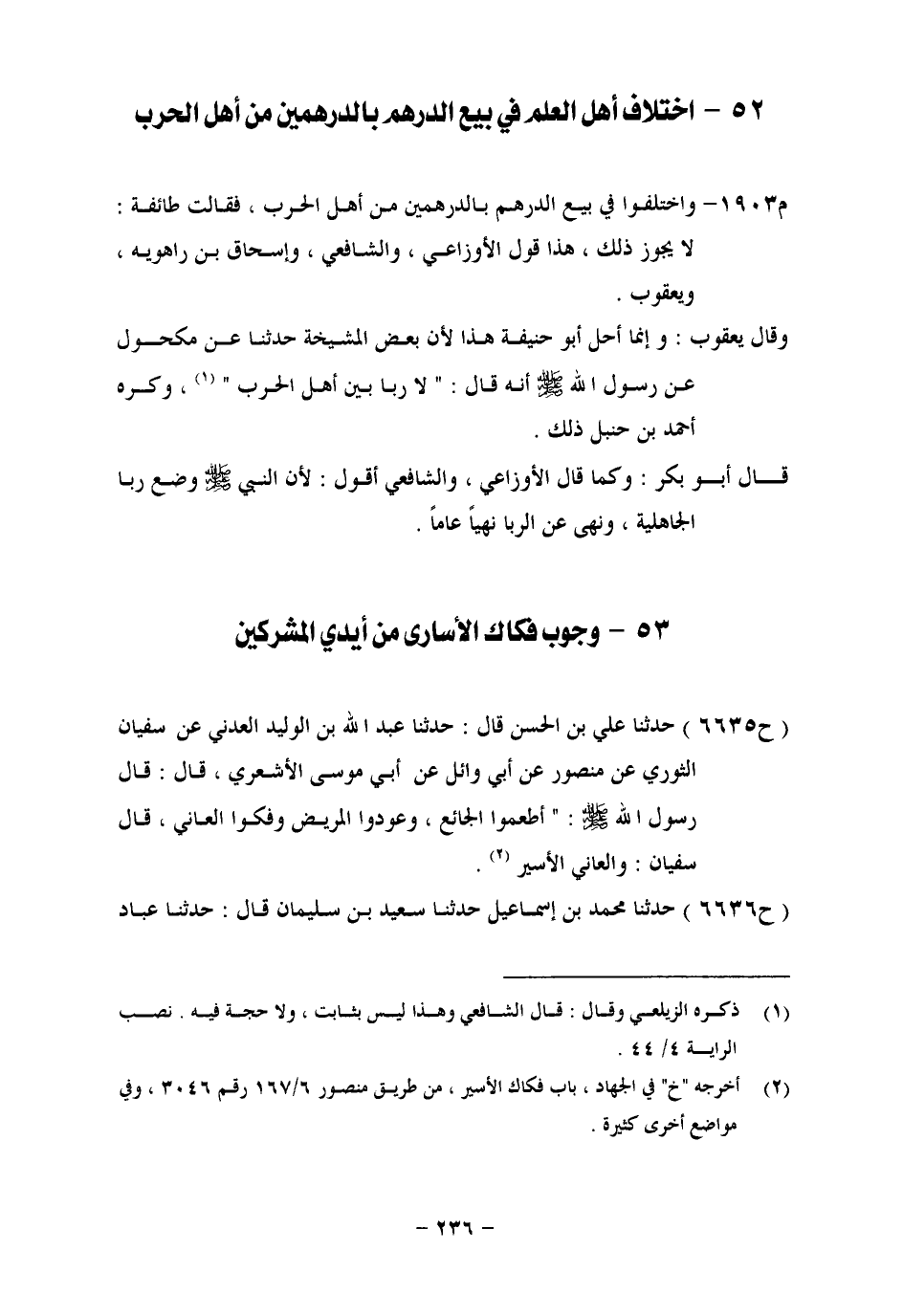 اخْتِلَافُ أَهْلِ الْعِلْمِ فِي بَيْعِ الدِّرْهَمِ بِالدِّرْهَمَيْنِ مِنْ أَهْلِ الْحَرْبِ وَاخْتَلَفُوا فِي بَيْعِ الدِّرْهَمِ بِالدِّرْهَمَيْنِ مِنْ أَهْلِ الْحَرْبِ، فَقَالَتْ طَائِفَةٌ: لَا يَجُوزُ ذَلِكَ، هَذَا قَوْلُ الْأَوْزَاعِيِّ، وَالشَّافِعِيِّ، وَإِسْحَاقَ بْنِ رَاهَوَيْهِ، وَيَعْقُوبَ، وَقَالَ يَعْقُوبُ: وَإِنَّمَا أَحَلَّ أَبُو حَنِيفَةَ هَذَا؛ لِأَنَّ بَعْضَ الْمَشْيَخَةِ حَدَّثَنَا عَنْ مَكْحُولٍ، عَنْ رَسُولِ اللهِ صَلَّى اللَّهُ عَلَيْهِ وَسَلَّمَ أَنَّهُ قَالَ: «لَا رِبَا بَيْنَ أَهْلِ الْحَرْبِ» وَكَرِهَ أَحْمَدُ بْنُ حَنْبَلٍ ذَلِكَ. قَالَ أَبُو بَكْرٍ: وَكَمَا قَالَ الْأَوْزَاعِيُّ، وَالشَّافِعِيُّ أَقُولُ؛ لِأَنَّ النَّبِيَّ صَلَّى اللَّهُ عَلَيْهِ وَسَلَّمَ وَضَعَ رِبَا الْجَاهِلِيَّةِ، وَنَهَى عَنِ الرِّبَا نَهْيًا عَامًّا