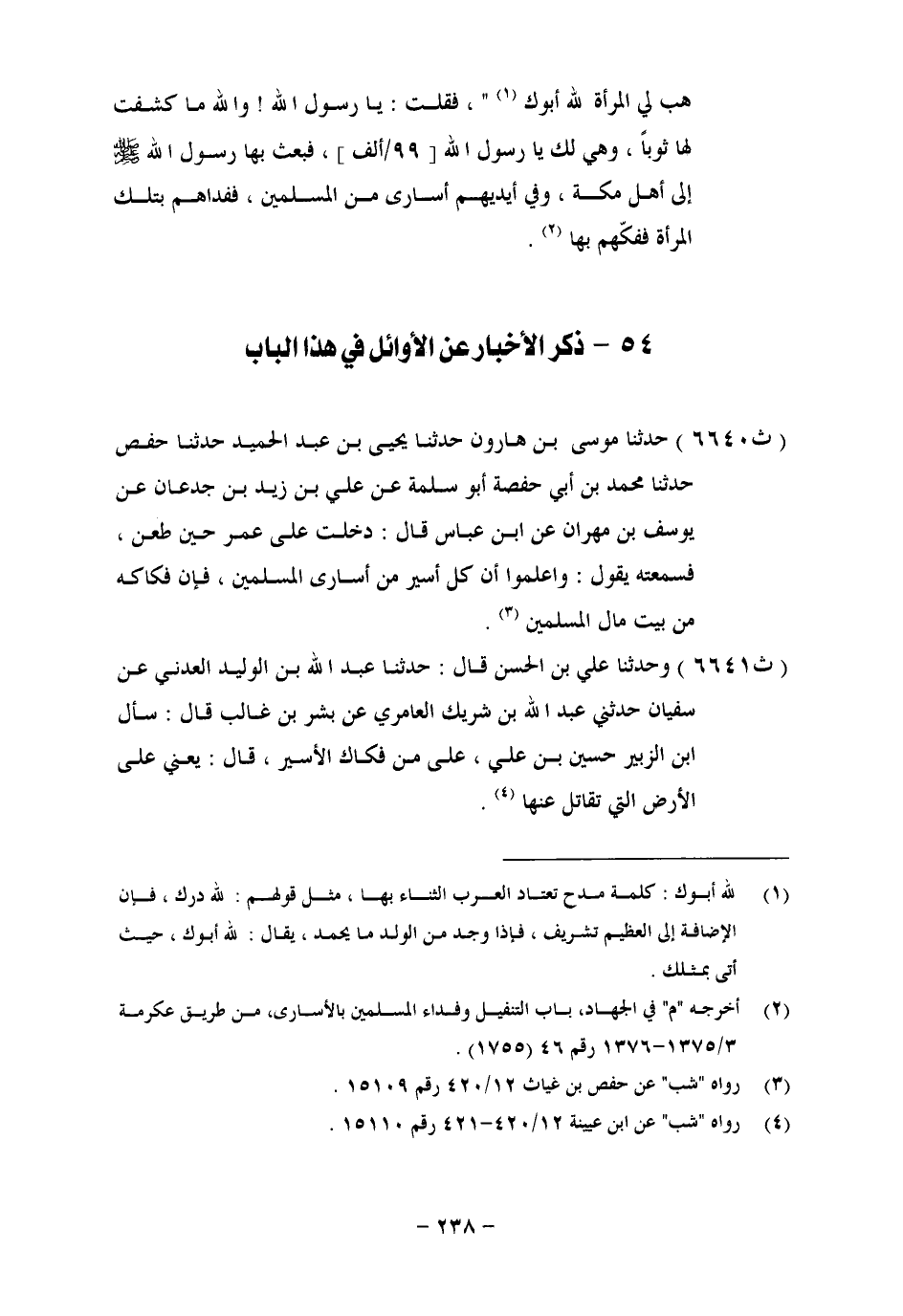 6641 - وَحَدَّثَنَا عَلِيُّ بْنُ الْحَسَنِ، قَالَ: حَدَّثَنَا عَبْدُ اللهِ بْنُ الْوَلِيدِ الْعَدَنِيُّ، عَنْ سُفْيَانَ، حَدَّثَنِي عَبْدُ اللهِ بْنُ شَرِيكٍ الْعَامِرِيُّ، عَنْ بِشْرِ بْنِ غَالِبٍ، قَالَ: سَأَلَ ابْنُ الزُّبَيْرِ حُسَيْنَ بْنَ عَلِيٍّ عَلَى مَنْ فِكَاكُ الْأَسِيرِ؟ قَالَ: يَعْنِي عَلَى الْأَرْضِ الَّتِي تُقَاتِلُ عَنْهَا -[239]- وَقَدْ رُوِّينَا عَنْ عُمَرَ بْنِ عَبْدِ الْعَزِيزِ، أَنَّهُ أَعْطَى رَجُلًا مَالًا لِيَخْرُجَ بِهِ يَفْدِي الْأُسَارَى، فَقَالَ: الرَّجُلُ: يَا أَمِيرَ الْمُؤْمِنِينَ: إِنَّا سَنَجِدُ نَاسًا فَرُّوا إِلَى الْعَدُوِّ طَوْعًا، فَنَفْدِيهُمْ؟ قَالَ: نَعَمْ، قَالَ: وَعَبِيدًا فَرُّوا طَوْعًا، وَإِمَاءً، قَالَ: افْدُوهُمْ، فَلَمْ يَذْكُرْ لَهُ صِنْفًا مِنَ النَّاسِ مِنْ خَيْرِ الْمُسْلِمِينَ إِلَّا أَمَرَ بِهِ فَفُدِيَ، وَقَالَ عُمَرُ: إِذَا خَرَجَ الرُّومِيُّ بِالْأَسِيرِ مِنَ الْمُسْلِمِينَ فَلَا يَحِلُّ لِلْمُسْلِمِينَ أَنْ يَرُدُّوهُ إِلَى الْكُفْرِ، لِيُفَادُوهُ بِمَا اسْتَطَاعُوا. قَالَ اللهُ: {وَإِنْ يَأْتُوكُمْ أُسَارَى تُفَادُوهُمْ} [البقرة: 85] الْآيَةَ. وَرُوِّينَا عَنْ عُمَرَ بْنِ عَبْدِ الْعَزِيزِ أَنَّهُ بَعَثَ عَبْدَ الرَّحْمَنِ بْنَ أَبِي عَمْرَةَ يَفْدِي أُسَارَى الْمُسْلِمِينَ مِنَ الْقُسْطَنْطِينَيَّةِ، قَالَ: قُلْتُ: يَا أَمِيرَ الْمُؤْمِنِينَ أَنْ أَبَوْا أَنْ يَفْدُوا الرَّجُلَ بِالرَّجُلِ فَكَيْفَ أَصْنَعُ؟ قَالَ: زِدْهُمْ، قَالَ: فَإِنْ أَبَوْا إِلَّا أَرْبَعًا؟ قَالَ: فَأَعْطِ لِكُلِّ مُسْلِمٍ مَا سَأَلُوكَ، وَاللهِ لَرَجُلٌ مِنَ الْمُسْلِمِينَ أَحَبُّ إِلَيَّ مِنْ كُلِّ مُشْرِكٍ عِنْدِي، وَإِنَّكَ مَا فَدَيْتَ بِهِ الْمُسْلِمَ فَقَدْ ظَفِرْتَ، وَإِنَّكَ إِنَّمَا تَشْتَرِي الْإِسْلَامَ، قُلْتُ: أَفَرَأَيْتَ إِنْ وَجَدْتُ رِجَالًا قَدْ تَنَصَّرُوا، فَأَرَادُوا أَنْ يَرْجِعُوا إِلَى الْإِسْلَامِ؟ قَالَ: نَعَمْ، أَفْدِيهِمْ بِمِثْلِ مَا تَفْدِي بِهِ غَيْرَهُمْ، وَقَالَ فِي النِّسَاءِ: وَفِيمَنْ تَنَصَّرَ مِنْهُنَّ مِثْلُ ذَلِكَ، وَقَالَ فِي الْعَبِيدِ: إِذَا كَانُوا مُسْلِمِينَ مِثْلَ ذَلِكَ، قَالَ: فَصَالَحْتُ عَظِيمَ الرُّومِ عَلَى كُلِّ رَجُلٍ مِنَ الْمُسْلِمِينَ رَجُلَيْنِ مِنَ الرُّومِ. -[240]- وَقَدْ رُوِيَ عَنْهُ أَنَّهُ قَالَ فِي أَهْلِ الذِّمَّةِ: أَفْدِيهِمْ بِمِثْلِ مَا تَفْدِي بِهِ غَيْرَهُمْ، وَسُئِلَ مَالِكٌ، وَاجِبٌ عَلَى الْمُسْلِمِينَ افْتِدَاءُ مَنْ أُسِرَ مِنْهُمْ؟ فَقَالَ: نَعَمْ، أَلَيْسَ وَاجِبٌ عَلَيْهِمْ أَنْ يُقَاتِلَهُمْ حَتَّى يَسْتَنْفِذُوهُمْ، فَقِيلَ: بَلَى، فَقَالَ: فَكَيْفَ لَا يَفْدُوهُمْ بِأَمْوَالِهِمْ، وَقَالَ عُمَرُ بْنُ عَبْدِ الْعَزِيزِ فِي فِدَاءِ الْأُسَارَى: لَا يَحِلُّ لَهُمْ أَنْ يَأْبَوْا ذَلِكَ عَلَيْهِمْ. وَقَالَ أَحْمَدُ بْنُ حَنْبَلٍ: يُفَادَى رَأْسٌ بِرُءُوسٍ، أَلَيْسَ قَدْ فادَ النَّبِيُّ صَلَّى اللَّهُ عَلَيْهِ وَسَلَّمَ، وَلَكِنْ لَا يُفَادَى بِالْأَمْوَالِ لَا أَعْرِفُهُ، وَقَالَ إِسْحَاقُ: الْفِدَاءُ بِالرُّءُوسِ أَحَبُّ إِلَيْنَا، وَلَوْ رَأْسٌ بِرُءُوسٍ، وَلَكِنْ إِنْ أَبَوْا إِلَّا أَنْ يُفَادُوا بِالذَّهَبِ وَالْفِضَّةِ، لَا يَحِلُّ لِإِمَامِ الْمُسْلِمِينَ إِلَّا أَنْ يُفَادِيَهُمْ وَلَوْ بِمَالٍ عَظِيمٍ مِنْ بَيْتِ مَالِ الْمُسْلِمِينَ، أَلَا تَرَى إِلَى مَا أَوْصَى بِهِ عُمَرُ بْنُ الْخَطَّابِ رَضِيَ اللهُ عَنْهُ حِينَ طُعِنَ