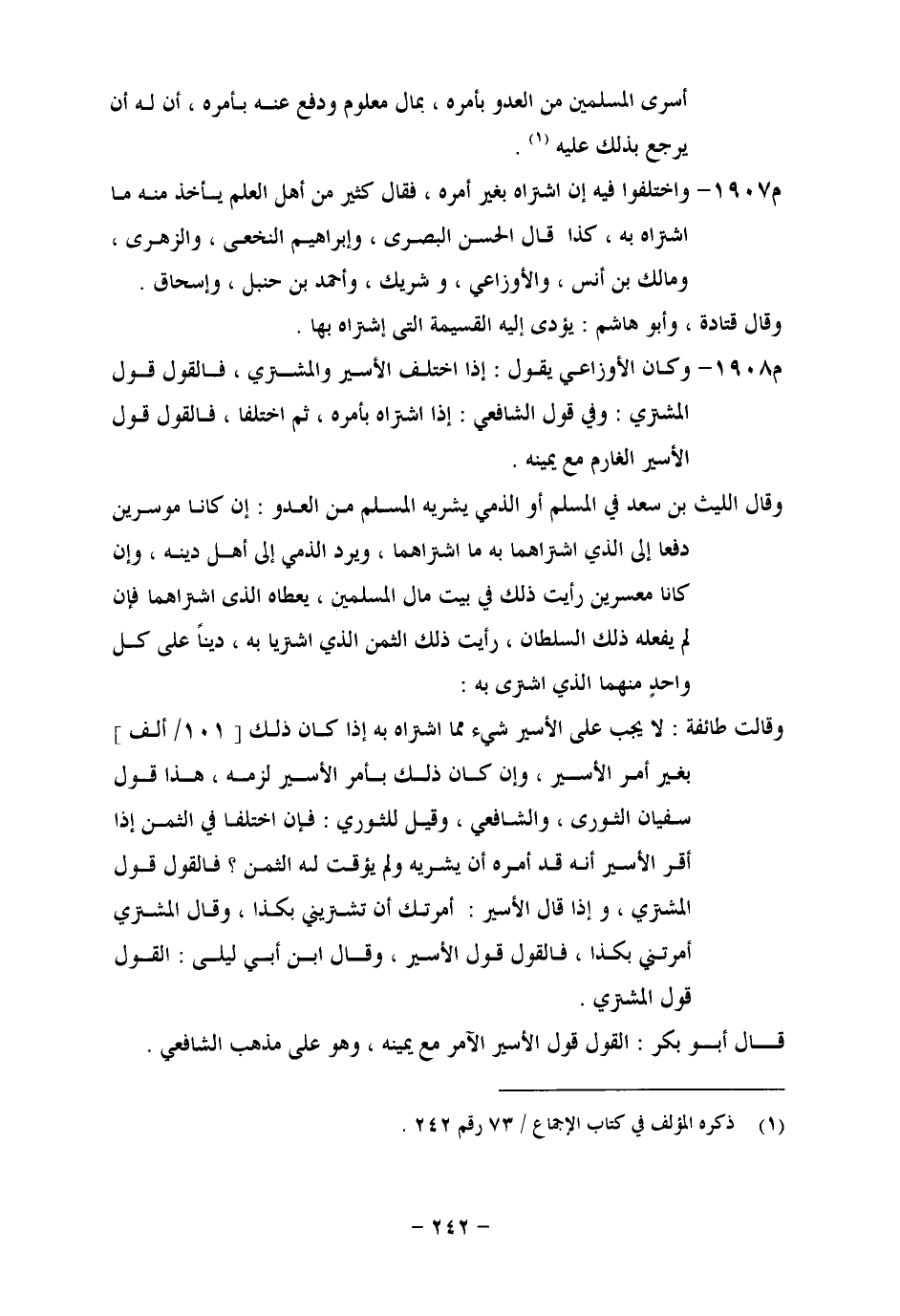 مِنْ أَسْرَى الْمُسْلِمِينَ مِنَ الْعَدُوِّ بِأَمْرِهِ بِمَالٍ مَعْلُومٍ، وَدَفَعَ عَنْهُ بِأَمْرِهِ، أَنَّ لَهُ أَنْ يَرْجِعَ بِذَلِكَ عَلَيْهِ. وَاخْتَلَفُوا فِيهِ إِنِ اشْتَرَاهُ بِغَيْرِ أَمْرِهِ، فَقَالَ كَثِيرٌ مِنْ أَهْلِ الْعِلْمِ يَأْخُذُ مِنْهُ مَا اشْتَرَاهُ بِهِ، كَذَا قَالَ الْحَسَنُ الْبَصْرِيُّ، وَإِبْرَاهِيمُ النَّخَعِيُّ، وَالزُّهْرِيُّ، وَمَالِكُ بْنُ أَنَسٍ، وَالْأَوْزَاعِيُّ، وَشَرِيكٌ، وَأَحْمَدُ بْنُ حَنْبَلٍ، وَإِسْحَاقُ. وَقَالَ قَتَادَةَ، وَأَبُو هَاشِمٍ: يُؤَدِّي إِلَيْهِ الْقَسِيمَةَ الَّتِي اشْتَرَاهُ بِهَا. وَكَانَ الْأَوْزَاعِيُّ يَقُولُ: إِذَا اخْتَلَفَ الْأَسِيرُ وَالْمُشْتَرِي، فَالْقَوْلُ قَوْلُ الْمُشْتَرِي: وَفِي قَوْلِ الشَّافِعِيِّ: إِذَا اشْتَرَاهُ بِأَمْرِهِ، ثُمَّ اخْتَلَفَا، فَالْقَوْلُ قَوْلُ الْأَسِيرِ الْغَارِمِ مَعَ يَمِينِهِ. وَقَالَ اللَّيْثُ بْنُ سَعْدٍ فِي الْمُسْلِمِ أَوِ الذِّمِّيِّ يَشْرِيهِ الْمُسْلِمُ مِنَ الْعَدُوِّ: إِنْ كَانَا مُوسِرَيْنِ دُفِعَا إِلَى الَّذِي اشْتَرَاهُمَا بِهِ مَا اشْتَرَاهُمَا، وَيُرَدُّ الذِّمِّيُّ إِلَى أَهْلِ دِينِهِ، وَإِنْ كَانَا مُعْسِرَيْنِ رَأَيْتُ ذَلِكَ فِي بَيْتِ مَالِ الْمُسْلِمِينَ، يُعْطَاهُ الَّذِي اشْتَرَاهُمَا فَإِنْ لَمْ يَفْعَلْهُ ذَلِكَ السُّلْطَانُ، رَأَيْتُ ذَلِكَ الثَّمَنَ الَّذِي اشْتَرِيَا بِهِ دَيْنًا عَلَى كُلِّ وَاحِدٍ مِنْهُمَا الَّذِي اشْتَرَى بِهِ: وَقَالَتْ طَائِفَةٌ: لَا يَجِبُ عَلَى الْأَسِيرِ شَيْءٌ مِمَّا اشْتَرَاهُ بِهِ إِذَا كَانَ ذَلِكَ بِغَيْرِ أَمْرِ الْأَسِيرِ، وَإِنْ كَانَ ذَلِكَ بِأَمْرِ الْأَسِيرِ لَزِمَهُ، هَذَا قَوْلُ سُفْيَانَ الثَّوْرِيِّ، وَالشَّافِعِيِّ، وَقِيلَ لِلثَّوْرِيِّ: فَإِنِ اخْتَلَفَا فِي الثَّمَنِ إِذَا أَقَرَّ الْأَسِيرُ أَنَّهُ قَدْ أَمَرَهُ أَنْ يَشْتَرِيَهُ، وَلَمْ يُؤَقِّتْ لَهُ الثَّمَنَ؟ فَالْقَوْلُ قَوْلُ الْمُشْتَرِي، وَإِذَا قَالَ الْأَسِيرُ: أَمَرْتُكَ أَنْ تَشْتَرِيَنِي بِكَذَا، وَقَالَ الْمُشْتَرِي: أَمَرْتَنِي بِكَذَا، فَالْقَوْلُ قَوْلُ الْأَسِيرِ، وَقَالَ ابْنُ أَبِي لِيَلِيَ: الْقَوْلُ قَوْلُ الْمُشْتَرِي. قَالَ أَبُو بَكْرٍ: الْقَوْلُ قَوْلُ الْأَسِيرِ الْآمِرُ مَعَ يَمِينِهِ، وَهُوَ عَلَى مَذْهَبِ