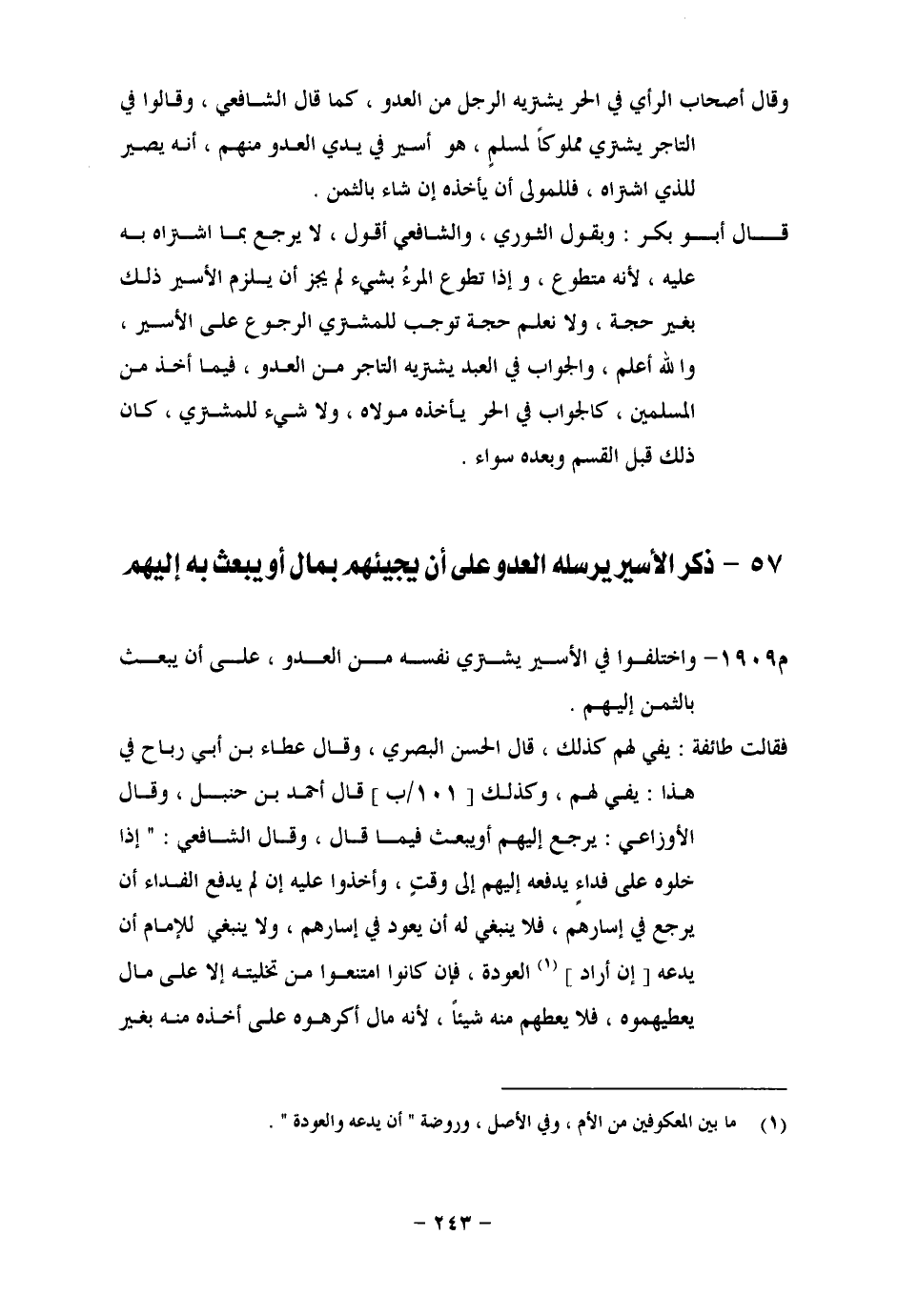 ذِكْرُ الْأَسِيرِ يُرْسِلُهُ الْعَدُوُّ عَلَى أَنْ يَجِيئَهُمْ بِمَالٍ أَوْ يَبْعَثَ بِهِ إِلَيْهِمْ وَاخْتَلَفُوا فِي الْأَسِيرِ يَشْتَرِي نَفْسَهُ مِنَ الْعَدُوِّ، عَلَى أَنْ يَبْعَثَ بِالثَّمَنِ إِلَيْهِمْ. فَقَالَتْ طَائِفَةٌ: يَفِي لَهُمْ كَذَلِكَ، قَالَ الْحَسَنُ الْبَصْرِيُّ، وَقَالَ عَطَاءُ بْنُ أَبِي رَبَاحٍ فِي هَذَا: يَفِي لَهُمْ، وَكَذَلِكَ، قَالَ أَحْمَدُ بْنُ حَنْبَلٍ، وَقَالَ الْأَوْزَاعِيُّ: يَرْجِعُ إِلَيْهِمْ أَوْ يَبْعَثُ فِيمَا قَالَ، وَقَالَ الشَّافِعِيُّ: إِذَا خَلَّوْهُ عَلَى فِدَاءٍ يَدْفَعُهُ إِلَيْهِمْ إِلَى وَقْتٍ، وَأَخَذُوا عَلَيْهِ إِنْ لَمْ يَدْفَعِ الْفِدَاءَ أَنْ يَرْجِعَ فِي إِسَارِهِمْ، فَلَا يَنْبَغِي لَهُ أَنْ يَعُودَ فِي إِسَارِهِمْ، وَلَا يَنْبَغِي لِلْإِمَامِ أَنَّهُ يَدَعُهُ إِنْ أَرَادَ الْعَوْدَةَ، فَإِنْ كَانُوا امْتَنَعُوا مِنْ تَخْلِيَتِهِ إِلَّا عَلَى مَالٍ يُعْطِيهِمُوهُ، فَلَا يُعْطِهِمْ مِنْهُ شَيْئًا، لِأَنَّهُ مَالٌ أَكْرَهُوهُ عَلَى أَخْذِهِ مِنْهُ بِغَيْرِ