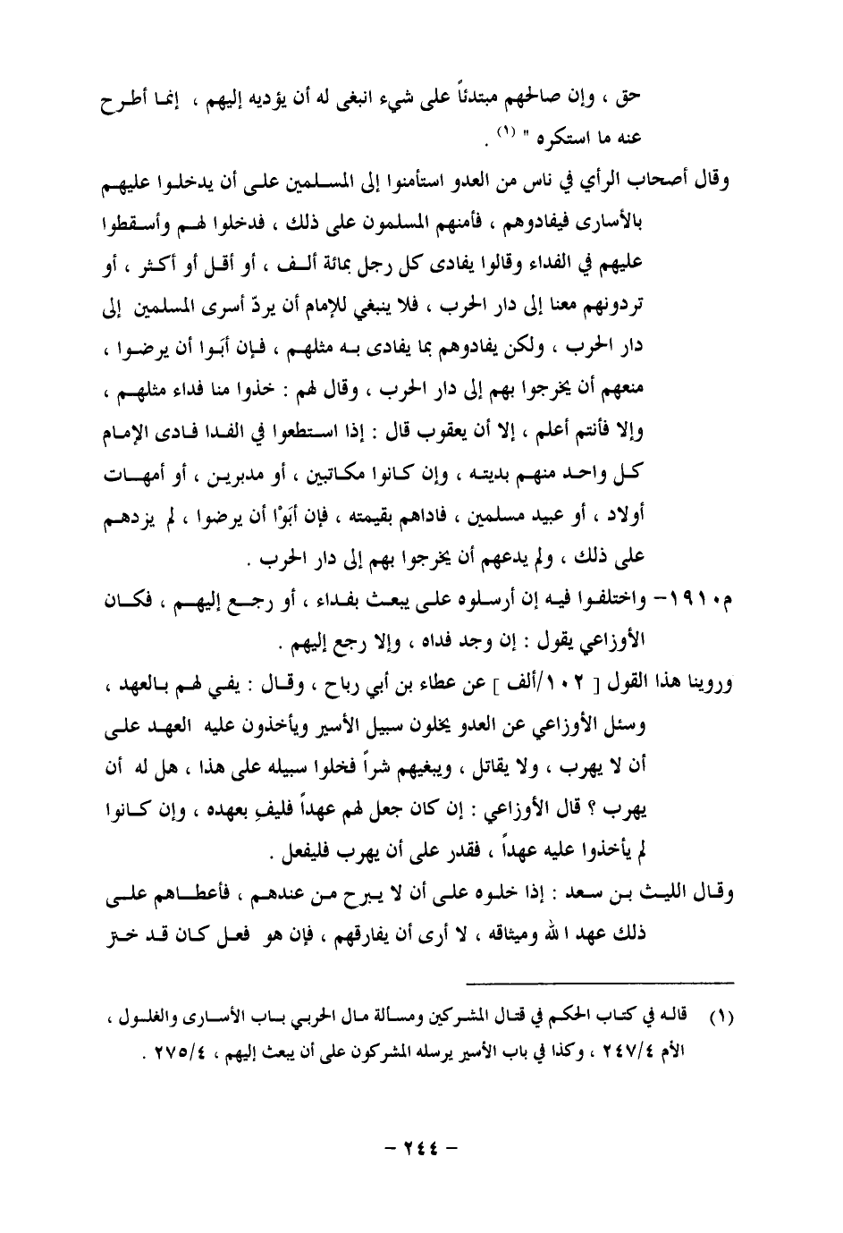حَقٍّ، وَإِنْ صَالَحَهُمْ مُبْتَدِئًا عَلَى شَيْءٍ انْبَغَى لَهُ أَنْ يُؤَدِّيَهُ إِلَيْهِمْ، إِنَّمَا اطَّرَحَ عَنْهُ مَا اسْتَكْرَهَ. وَقَالَ أَصْحَابُ الرَّأْيِ فِي نَاسٍ مِنَ الْعَدُوِّ اسْتَأْمَنُوا إِلَى الْمُسْلِمِينَ عَلَى أَنَّهُ يَدْخُلُوا عَلَيْهِمْ بِ الْأُسَارَى فَيُفَادُوهُمْ، فَأَمَّنَهُمُ الْمُسْلِمُونَ عَلَى ذَلِكَ، فَدَخَلُوا لَهُمْ، وَأَسْقَطُوا عَلَيْهِمْ فِي الْفِدَاءِ، وَقَالُوا: يُفَادَى كُلُّ رَجُلٍ بِمِائَةِ أَلْفٍ، أَوْ أَقَلَّ أَوْ أَكْثَرَ، أَوْ تَرُدُّونَهُمْ مَعَنَا إِلَى دَارِ الْحَرْبِ، فَلَا يَنْبَغِي لِلْإِمَامِ أَنْ يَرُدَّ أَسْرَى الْمُسْلِمِينَ إِلَى دَارِ الْحَرْبِ، وَلَكِنْ يُفَادُوهُمْ بِمَا يُفَادَى بِهِ مِثْلُهُمْ، فَإِنْ أَبَوْا أَنْ يَرْضَوْا، مَنَعَهُمْ أَنْ يَخْرُجُوا بِهِمْ إِلَى دَارِ الْحَرْبِ، وَقَالَ لَهُمْ: خُذُوا مِنَّا فِدَاءَ مِثْلِهِمْ، وَإِلَّا فَأَنْتُمْ أَعْلَمُ، إِلَّا أَنْ يَعْقُوبَ قَالَ: إِذَا اسْتَطَاعُوا فِي الْفِدَاءِ فَادَى الْإِمَامُ كُلَّ وَاحِدٍ مِنْهُمْ بِدِيَتِهِ، وَإِنْ كَانُوا مُكَاتَبِينَ، أَوْ مُدَبَّرِينَ، أَوْ أُمَّهَاتِ أَوْلَادٍ، أَوْ عُبَيْدٍ مُسْلِمِينَ، فَادَاهُمْ بِقِيمَتِهِ، فَإِنْ أَبَوْا أَنْ يَرْضَوْا، لَمْ يَزِدْهُمْ عَلَى ذَلِكَ، وَلَمْ يَدَعْهُمْ أَنْ يَخْرُجُوا بِهِمْ إِلَى دَارِ الْحَرْبِ. وَاخْتَلَفُوا فِيهِ إِنْ أَرْسَلُوهُ عَلَى أَنْ يَبْعَثَ بِفِدَاءٍ، أَوْ رَجَعَ إِلَيْهِمْ، فَكَانَ الْأَوْزَاعِيُّ يَقُولُ: إِنْ وَجَدَ فَدَاهُ، وَإِلَّا رَجَعَ إِلَيْهِمْ. وَرُوِّينَا هَذَا الْقَوْلُ، عَنْ عَطَاءِ بْنِ أَبِي رَبَاحٍ، وَقَالَ: يَفِي لَهُمْ بِالْعَهْدِ، وَسُئِلَ الْأَوْزَاعِيُّ عَنِ الْعَدُوِّ يُخَلُّونَ سَبِيلَ الْأَسِيرِ وَيَأْخُذُونَ عَلَيْهِ الْعَهْدَ عَلَى أَنَّهُ يَهْرَبُ، وَلَا يُقَاتِلُ، وَيَبْغِيهِمْ شَرًّا فَخَلُّوا سَبِيلَهُ عَلَى هَذَا، هَلْ لَهُ أَنْ يَهْرُبَ؟ قَالَ الْأَوْزَاعِيُّ: إِنْ كَانَ جَعَلَ لَهُمْ عَهْدًا فَلْيَفِ بِعَهْدِهِ، وَإِنْ كَانُوا لَمْ يَأْخُذُوا عَلَيْهِ عَهْدًا، فَقَدَرَ عَلَى أَنْ يَهْرُبَ فَلْيَفْعَلْ , وَقَالَ اللَّيْثُ بْنُ سَعْدٍ: إِذَا خَلَّوْهُ عَلَى أَنْ لَا يَبْرَحَ مِنْ عِنْدِهِمْ، فَأَعْطَاهُمْ عَلَى ذَلِكَ عَهْدَ اللهِ وَمِيثَاقَهُ، لَا أَرَى أَنْ يُفَارِقَهُمْ، فَإِنْ هُوَ فَعَلَ كَانَ قَدْ خَتَرَ