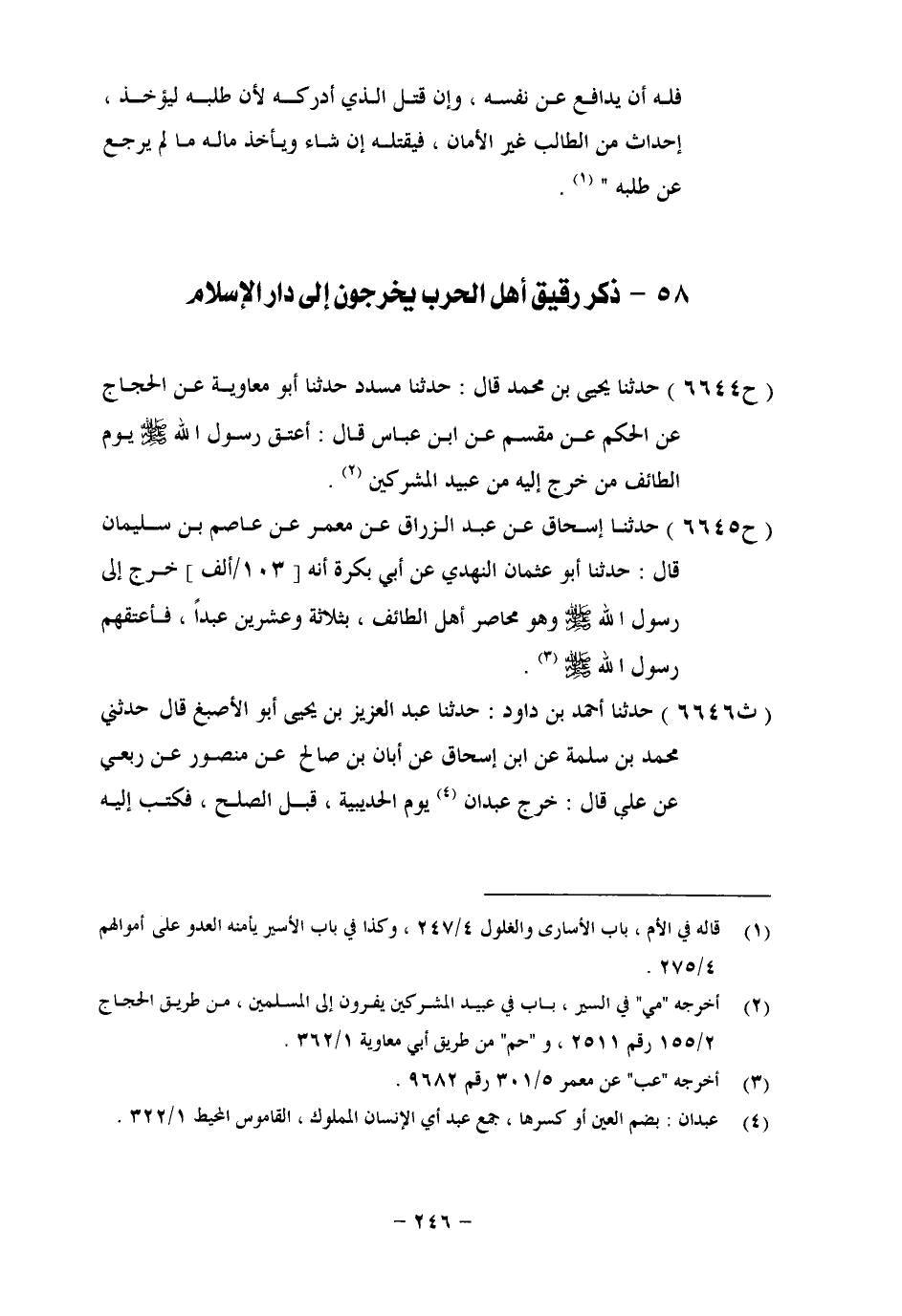6646 - حَدَّثَنَا أَحْمَدُ بْنُ دَاوُدَ، حَدَّثَنَا عَبْدُ الْعَزِيزِ بْنُ يَحْيَى أَبُو الْأَصْبَغِ، قَالَ: حَدَّثَنَا مُحَمَّدُ بْنُ سَلَمَةَ، عَنِ ابْنِ إِسْحَاقَ، عَنْ أَبَانَ بْنِ صَالِحٍ، عَنْ مَنْصُورٍ، عَنْ رِبْعِيٍّ، عَنْ عَلِيٍّ، قَالَ: خَرَجَ عِبْدَانٌ يَوْمَ الْحُدَيْبِيَةِ قَبْلَ الصُّلْحِ، فَكَتَبَ إِلَيْهِ -[247]- مَوَالِيهِمْ مِنْ أَهْلِ مَكَّةَ، فَذَكَرَ الْحَدِيثَ، فَأَبَى أَنْ يَرُدَّهُمْ، وَقَالَ: «هُمْ عُتَقَاءُ اللهِ» وَكَانَ الشَّافِعِيُّ يَقُولُ بِظَاهِرِ حَدِيثِ ابْنِ عَبَّاسٍ، وَقَالَ سُفْيَانُ الثَّوْرِيُّ: الْعَبْدُ يَجِيءُ فَيُسْلِمُ، ثُمَّ يَجِيءُ سَيِّدَهُ بَعْدُ، فَيُسَلِّمُ، قَالَ: لَا يُرَدُّ إِلَيْهِ، وَوَلَاؤُهُ لِلْمُسْلِمِينَ، فَإِنْ جَاءَ السَّيِّدُ فَأَسْلَمَ، ثُمَّ جَاءَ الْعَبْدُ فَأَسْلَمَ، رُدَّ إِلَى سَيِّدِهِ، وَكَذَلِكَ قَالَ الْأَوْزَاعِيُّ. وَقَالَ الْأَوْزَاعِيُّ: فَإِنْ أَسْلَمَ عَبْدٌ مِنْ عَبِيدِ الْعَدُوِّ، ثُمَّ أَصَابَهُ الْمُسْلِمُونَ فِي بِلَادِهِمْ قَبْلَ أَنْ يَخْرُجَ إِلَيْنَا، قَالَ: هُوَ حُرٌّ وَهُوَ أَخُوهُمْ. وَقَالَ اللَّيْثُ بْنُ سَعْدٍ فِي الْعَبْدِ مِنْ عَبِيدِ الْعَدُوِّ إِلَى الْمُسْلِمِينَ وَيُسْلِمُ، قَالَ اللَّيْثُ هُوَ حُرٌّ، وَإِنْ أَبَى أَنْ يُسْلِمَ وَرَضِيَ بِالْخَيْرِيَّةِ، فَذَلِكَ لَهُ، وَيُتْرَكُ مَا أَرَادَ. وَقَالَ النُّعْمَانُ: إِذَا أَسْلَمَ عَبْدُ الْحَرْبِيِّ فِي دَارِ الْحَرْبِ، ثُمَّ خَرَجَ إِلَيْنَا فَهُوَ حُرٌّ. قَالَ أَبُو بَكْرٍ: وَأَجْمَعَ كُلُّ مَنْ أَحْفَظُ عَنْهُ مِنْ أَهْلِ الْعِلْمِ عَلَى أَنَّ رَقِيقَ أَهْلِ الذِّمَّةِ، إِنْ أَسْلَمُوا أَنَّ بَيْعَهُمْ يَجِبُ عَلَيْهِمْ، وَمِمَّنْ حَفِظْنَا ذَلِكَ عَنْهُ عُمَرُ بْنُ عَبْدِ الْعَزِيزِ، وَالْحَسَنُ الْبَصْرِيُّ، وَإِبْرَاهِيمُ النَّخَعِيُّ، وَاللَّيْثُ بْنُ سَعْدٍ، وَالشَّافِعِيُّ، وَأَحْمَدُ، وَأَبُو ثَوْرٍ، وَأَصْحَابُ الرَّأْيِ -[248]- وَكَانَ مَالِكٌ، وَالشَّافِعِيُّ، يَقُولَانِ: إِذَا أَسَرَ النَّصْرَانِيُّ عَبْدًا مُسْلِمًا، فَالشِّرَاءُ جَائِزٌ، وَيُبَاعُ عَلَيْهِ. وَقَالَ النُّعْمَانُ فِي الْحَرْبِيِّ يَدْخُلُ إِلَيْنَا بِأَمَانٍ، فَيَشْتَرِي عَبْدًا مُسْلِمًا ثُمَّ يُدْخِلُهُ مَعَهُ دَارَ الْحَرْبِ، قَالَ: يَعْتِقُ الْعَبْدُ، وَقَالَ يَعْقُوبُ وَمُحَمَّدٌ: لَا يَعْتِقُ. وَقَالَ أَبُو بَكْرٍ: وَهَذَا لَا يَعْتِقُ، وَلَكِنَّهُ إِذَا صَارَ إِلَيْنَا بِأَمَانِ أَوْ غَيْرِهِ بِيعَ عَلَيْهِ