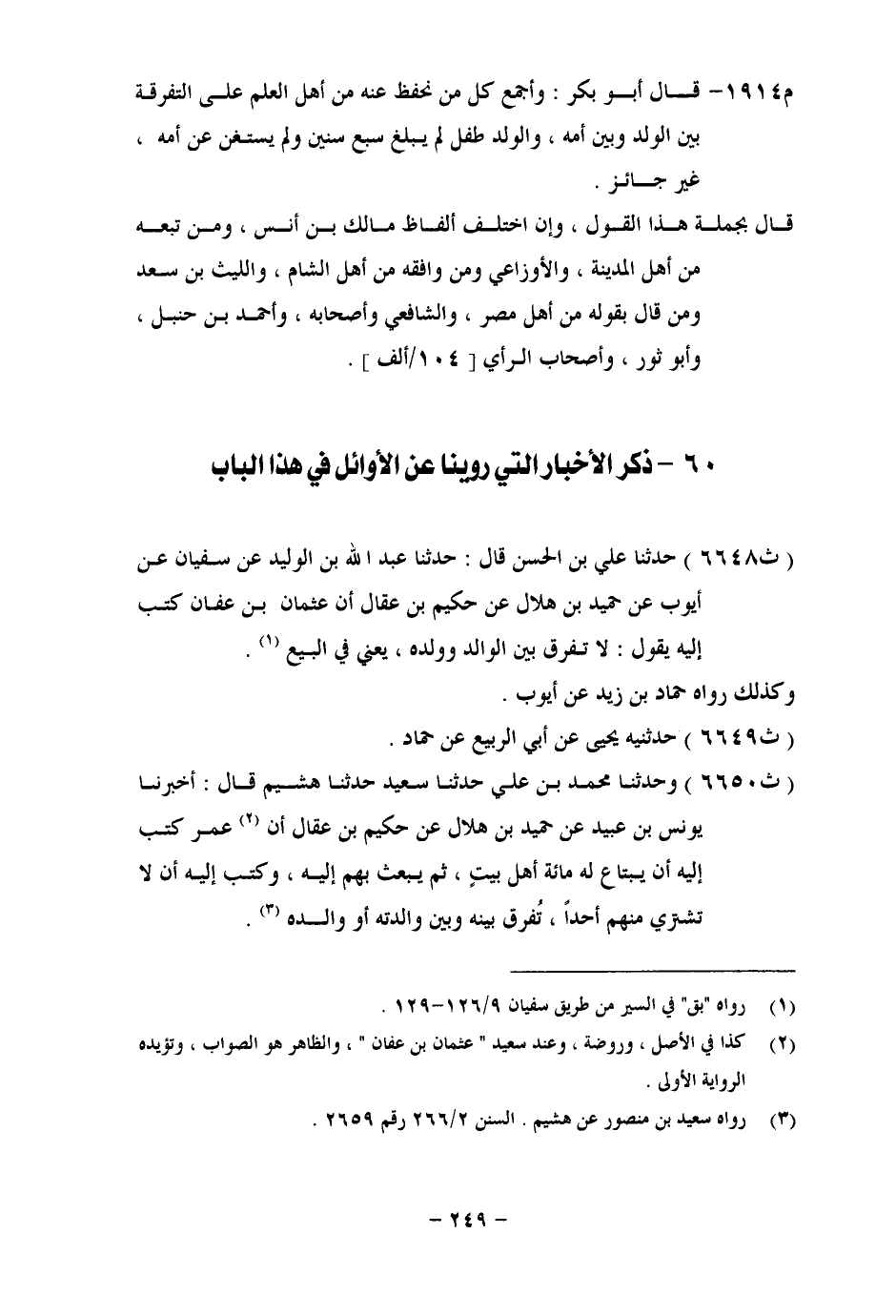 6648 - حَدَّثَنَا عَلِيُّ بْنُ الْحَسَنِ، قَالَ: حَدَّثَنَا عَبْدُ اللهِ بْنُ الْوَلِيدِ، عَنْ سُفْيَانَ، عَنْ أَيُّوبَ، عَنْ حُمَيْدِ بْنِ هِلَالٍ، عَنْ حَكِيمِ بْنِ عِقَالٍ، أَنَّ عُثْمَانَ بْنَ عَفَّانَ، كَتَبَ إِلَيْهِ يَقُولُ: «لَا تُفَرِّقْ بَيْنَ الْوَالِدِ وَوَلَدِهِ» ، يَعْنِي فِي الْبَيْعِ. وَكَذَلِكَ رَوَاهُ حَمَّادُ بْنُ زَيْدٍ، عَنْ أَيُّوبَ