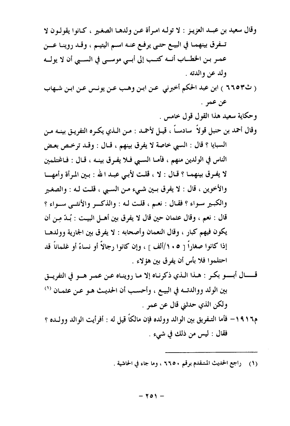 6653 - ابْنُ عَبْدِ الْحَكَمِ أَخْبَرَنِي عَنِ ابْنِ وَهْبٍ " عَنْ يُونُسَ، عَنِ ابْنِ شِهَابٍ، عَنْ عُمَرَ وَحِكَايَةُ سَعِيدٍ هَذَا الْقَوْلَ قَوْلٌ خَامِسٌ. وَقَالَ أَحْمَدُ بْنُ حَنْبَلٍ قَوْلًا سَادِسًا، قِيلَ لِأَحْمَدَ: مَنِ الَّذِي يُكْرَهُ التَّفْرِيقُ بَيْنَهُ مِنَ السَّبَايَا؟ قَالَ: السَّبْيُ خَاصَّةً لَا يُفَرَّقُ بَيْنَهُمْ، قَالَ: وَقَدْ تَرَخَّصَ بَعْضُ النَّاسِ فِي الْوَلَدَيْنِ مِنْهُمْ، فَأَمَّا السَّبْيُ فَلَا يُفَرَّقُ بَيْنَهُ، قَالَ: فَالْمُحْتَلِمَيْنِ لَا يُفَرَّقُ بَيْنَهُمَا؟ قَالَ: لَا، قُلْتُ لِأَبِي عَبْدِ اللهِ: بَيْنَ الْمَرْأَةِ وَأُمِّهَا وَالْأَخَوَيْنِ، قَالَ: لَا يُفَرَّقُ بَيْنَ شَيْءٍ مِنَ السَّبْيِ، قُلْتُ لَهُ: وَالصَّغِيرُ وَالْكَبِيرُ سَوَاءٌ؟ فَقَالَ: نَعَمْ، قُلْتُ لَهُ: وَالذَّكَرُ وَالْأُنْثَى سَوَاءٌ؟ قَالَ: نَعَمْ، وَقَالَ عُثْمَانُ حِينَ قَالَ لَا يُفَرَّقُ بَيْنَ أَهْلِ الْبَيْتِ: بُدٌّ مِنْ أَنْ يَكُونَ فِيهِمْ كِبَارٌ، وَقَالَ النُّعْمَانُ وَأَصْحَابُهُ: لَا يُفَرَّقُ بَيْنَ الْجَارِيَةِ وَوَلَدِهَا إِذَا كَانُوا صِغَارًا، وَإِنْ كَانُوا رِجَالًا أَوْ نِسَاءً أَوْ غِلْمَانًا قَدِ احْتَلَمُوا فَلَا بَأْسَ أَنْ يُفَرَّقَ بَيْنَ هَؤُلَاءِ. قَالَ أَبُو بَكْرٍ: هَذَا الَّذِي ذَكَرْنَاهُ إِلَّا مَا رُوِّينَاهُ، عَنْ عُمَرَ هُوَ فِي التَّفْرِيقِ بَيْنَ الْوَلَدِ وَوَالِدَتِهِ فِي الْبَيْعِ، وَأَحْسَبُ أَنَّ الْحَدِيثَ هُوَ عَنْ عُثْمَانَ، وَلَكِنَّ الَّذِي حَدَّثَنِي، قَالَ: عَنْ عُمَرَ فَأَمَّا التَّفْرِيقُ بَيْنَ الْوَالِدِ وَوَالِدِهِ فَإِنَّ مَالِكًا قِيلَ لَهُ: أَفَرَأَيْتَ الْوَالِدَ وَوَلَدَهُ؟ فَقَالَ: لَيْسَ مِنْ ذَلِكَ فِي شَيْءٍ. -[252]- وَقَالَ اللَّيْثُ بْنُ سَعْدٍ: أَدْرَكْتُ النَّاسَ وَهُمْ يُفَرِّقُونَ بَيْنَ الْأَخَوَيْنِ فِي الْبَيْعِ، وَبَيْنَ الْوَالِدِ وَوَلَدِهِ، وَلَا يُفَرَّقُ بَيْنَ الْأُمِّ وَوَلَدِهَا حَتَّى يَبْلُغَ. وَفِيهِ قَوْلٌ ثَانٍ: وَهُوَ أَنْ لَا يَجُوزَ أَنْ يُفَرَّقَ بَيْنَهُمَا، هَذَا قَوْلُ أَحْمَدَ بْنِ حَنْبَلٍ، قَالَ: أَمَّا الْأَبُ وَالْأَخُ وَالْوَلَدُ فَهُوَ أَبْيَنُ، وَذَكَرَ حَدِيثَ عُثْمَانَ أَنَّهُ أَمَرَ أَنْ يُشْتَرَى لَهُ مِائَةُ أَهْلِ بَيْتٍ وَلَا يُفَرَّقُ بَيْنَهُمْ، وَقَالَ أَحْمَدُ: لَا يُفَرَّقُ بَيْنَ شَيْءٍ مِنَ السَّبْيِ، وَفِي قَوْلِ أَصْحَابِ الرَّأْيِ: لَا يُفَرَّقُ بَيْنَ الْوَالِدِ وَوَلَدِهِ فِي الْبَيْعِ، وَهَذَا قِيَاسُ قَوْلِ كُلِّ مَنْ يَرَى أَنْ لَا يُفَرَّقَ بَيْنَ كُلِّ ذِي رَحِمٍ مُحَرَّمٍ. وَيُشْبِهُ مَذْهَبَ الشَّافِعِيِّ أَنْ لَا يُفَرَّقَ بَيْنَ الْوَالِدِ وَوَلَدِهِ حَتَّى يَبْلُغَ الْوَلَدُ سَبْعَ سِنِينَ، أَوْ ثَمَانَ سِنِينَ؛ لِأَنَّهُ قَالَ: " فَإِنْ قَالَ قَائِلٌ: فَكَيْفَ فَرَّقْتُمْ بَيْنَ الْأَخَوَيْنِ، وَلَمْ تُفَرِّقُوا بَيْنَ الْوَلَدِ وَأُمِّهِ، قِيلَ: السُّنَّةُ فِي الْوَلَدِ وَأُمِّهِ، وَوَجَدْتُ حَالَ الْوَلَدِ مِنَ الْوَالِدِ مُخَالِفًا حَالَ الْأَخِ مِنْ أَخِيهِ، وَوَجَدْتُنِي أَجْبُرُ الْوَلَدَ عَلَى نَفَقَةِ الْوَالِدِ، وَالْوَالِدَ عَلَى نَفَقَةِ الْوَلَدِ، وَذَكَرَ كَلَامًا تَرَكْتُ ذِكْرَهُ هَا هُنَا