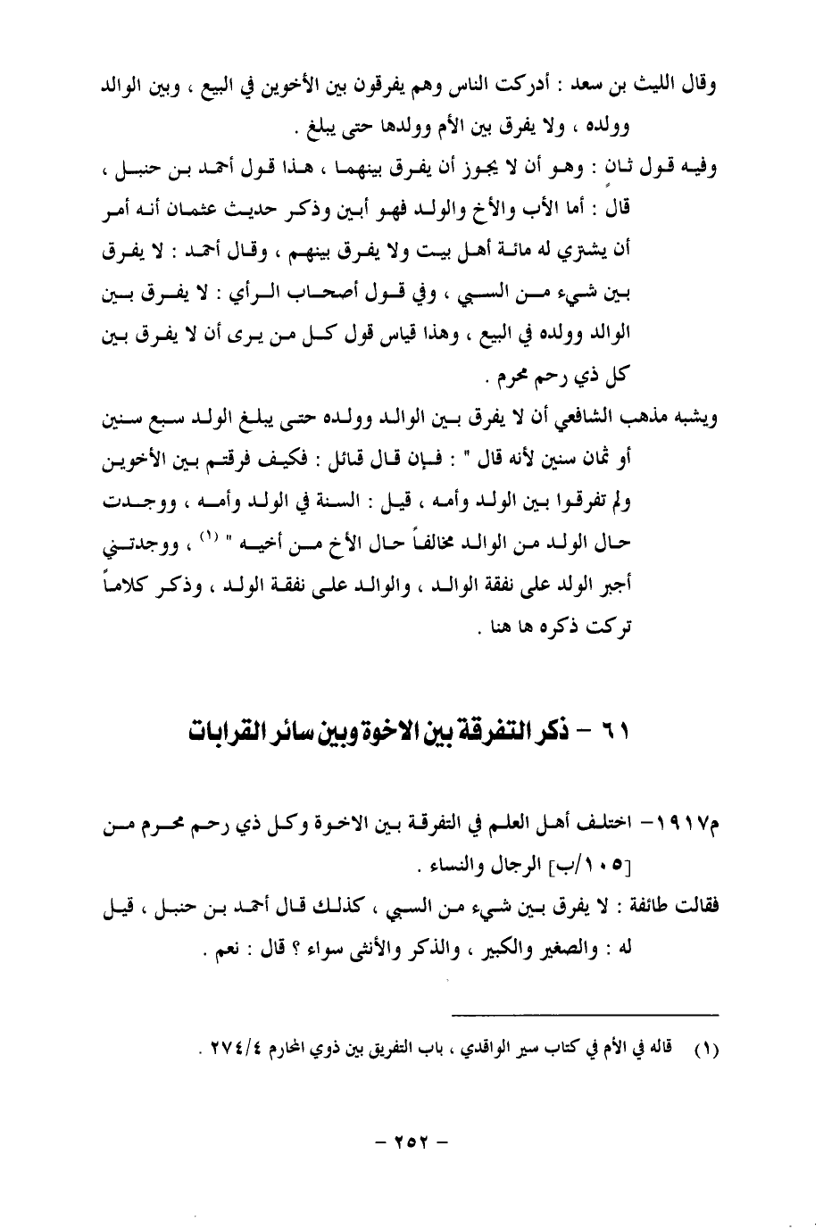 ذِكْرُ التَّفْرِقَةِ بَيْنَ الْإِخْوَةِ وَبَيْنَ سَائِرِ الْقَرَابَاتِ اخْتَلَفَ أَهْلُ الْعِلْمِ فِي التَّفْرِقَةِ بَيْنَ الْإِخْوَةِ وَكُلِّ ذِي مَحْرَمٍ مِنَ الرِّجَالِ وَالنِّسَاءِ. فَقَالَتْ طَائِفَةٌ: لَا يُفَرَّقُ بَيْنَ شَيْءٍ مِنَ السَّبْيِ، وَكَذَلِكَ قَالَ أَحْمَدُ بْنُ حَنْبَلٍ، قِيلَ لَهُ: وَالصَّغِيرُ وَالْكَبِيرُ، وَالذَّكَرُ وَالْأُنْثَى سَوَاءٌ؟ قَالَ: نَعَمْ