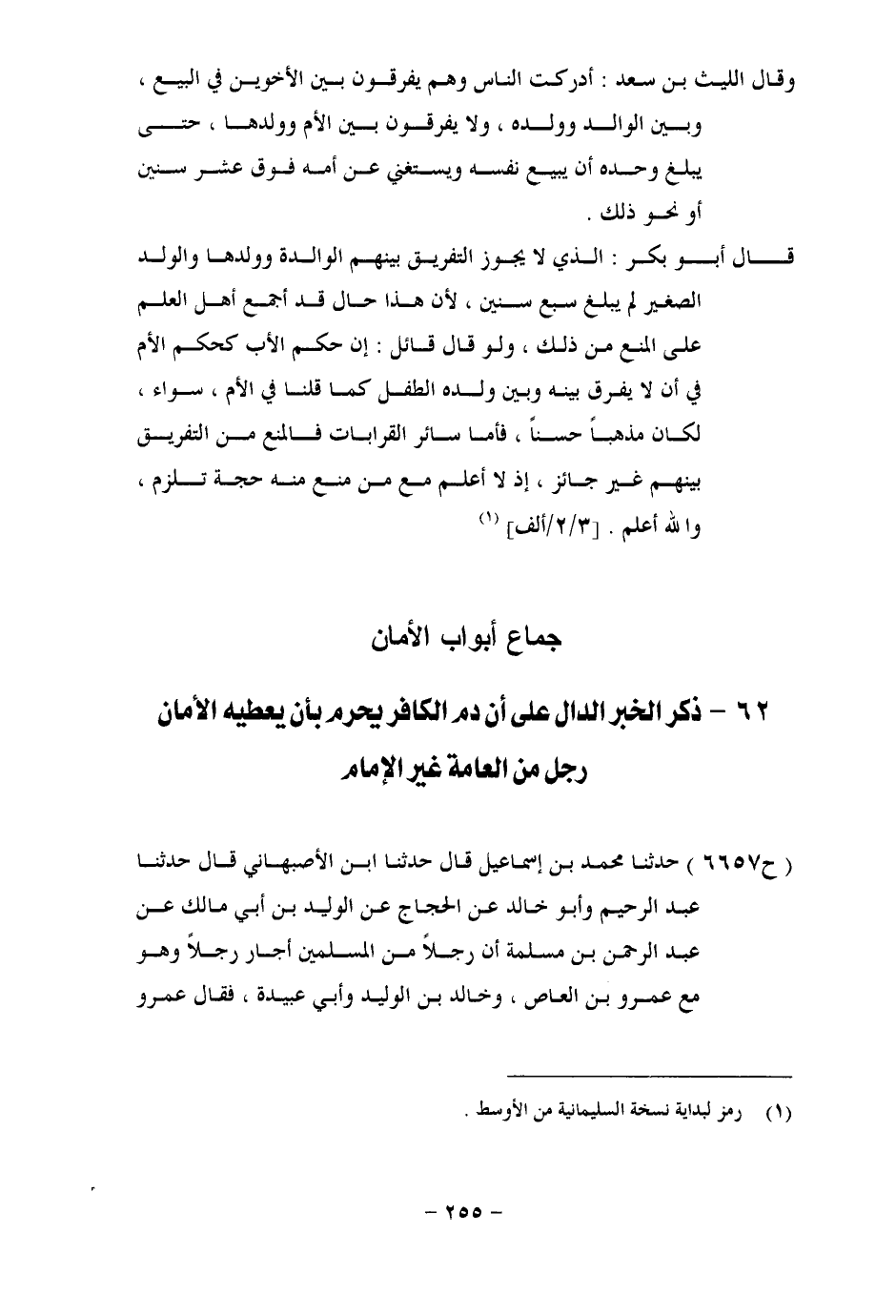 6657 - حَدَّثَنَا مُحَمَّدُ بْنُ إِسْمَاعِيلَ، قَالَ: حَدَّثَنَا ابْنُ الْأَصْبَهَانِيِّ، قَالَ: حَدَّثَنَا عَبْدُ الرَّحِيمِ، وَأَبُو خَالِدٍ، عَنِ الْحَجَّاجِ، عَنِ الْوَلِيدِ بْنِ أَبِي مَالِكٍ، عَنْ عَبْدِ الرَّحْمَنِ بْنِ مَسْلَمَةَ، أَنَّ رَجُلًا، مِنَ الْمُسْلِمِينَ أَجَارَ رَجُلًا وَهُوَ مَعَ عَمْرِو بْنِ الْعَاصِ، وَخَالِدِ بْنِ الْوَلِيدِ وَأَبِي عُبَيْدَةَ، فَقَالَ عَمْرٌو -[256]- وَخَالِدٌ: لَا يُجِيرُ مَنْ أَجَارَ، فَقَالَ أَبُو عُبَيْدَةَ: بَلَى سَمِعْتُ رَسُولَ اللهِ صَلَّى اللَّهُ عَلَيْهِ وَسَلَّمَ يَقُولُ: «يُجِيرُ عَلَى الْمُسْلِمِينَ بَعْضُهُمْ»