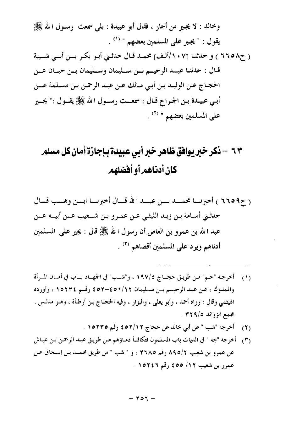 6658 - وَحَدَّثَنَا مُحَمَّدٌ، قَالَ: حَدَّثَنِي أَبُو بَكْرِ بْنُ أَبِي شَيْبَةَ، قَالَ: حَدَّثَنَا عَبْدُ الرَّحِيمِ بْنُ سُلَيْمَانَ، وَسُلَيْمَانُ بْنُ حَيَّانَ، عَنِ الْحَجَّاجِ، عَنِ الْوَلِيدِ بْنِ أَبِي مَالِكٍ، عَنْ عَبْدِ الرَّحْمَنِ بْنِ مَسْلَمَةَ، عَنْ أَبِي عُبَيْدَةَ بْنِ الْجَرَّاحِ، قَالَ: سَمِعْتُ رَسُولَ اللهِ صَلَّى اللَّهُ عَلَيْهِ وَسَلَّمَ يَقُولُ: «يُجِيرُ عَلَى الْمُسْلِمِينَ بَعْضُهُمْ»
