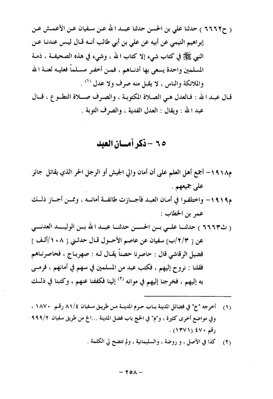 6662 - حَدَّثَنَا عَلِيُّ بْنُ الْحَسَنِ، حَدَّثَنَا عَبْدُ اللهِ، عَنْ سُفْيَانَ، عَنِ الْأَعْمَشِ، عَنْ إِبْرَاهِيمَ التَّيْمِيِّ، عَنْ أَبِيهِ، عَنْ عَلِيِّ بْنِ أَبِي طَالِبٍ، أَنَّهُ قَالَ: لَيْسَ عِنْدَنَا، عَنِ النَّبِيِّ صَلَّى اللَّهُ عَلَيْهِ وَسَلَّمَ فِي كِتَابٍ شَيْءٌ إِلَّا كِتَابَ اللهِ، وَشَيْءٌ فِي هَذِهِ الصَّحِيفَةِ: «ذِمَّةُ الْمُسْلِمِينَ وَاحِدَةٌ يَسْعَى بِهَا أَدْنَاهُمْ، فَمَنْ أَخْفَرَ مُسْلِمًا فَعَلَيْهِ لَعْنَةُ اللهِ وَالْمَلَائِكَةِ وَالنَّاسِ، لَا يُقْبَلُ مِنْهُ صَرْفٌ وَلَا عَدْلٌ» قَالَ عَبْدُ اللهِ: فَالْعَدْلُ: هِيَ الصَّلَاةُ الْمَكْتُوبَةُ، وَالصَّرْفُ: صَلَاةُ التَّطَوُّعِ، قَالَ عَبْدُ اللهِ: وَيُقَالُ: الْعَدْلُ: الْفِدْيَةُ، وَالصَّرْفُ: التَّوْبَةُ