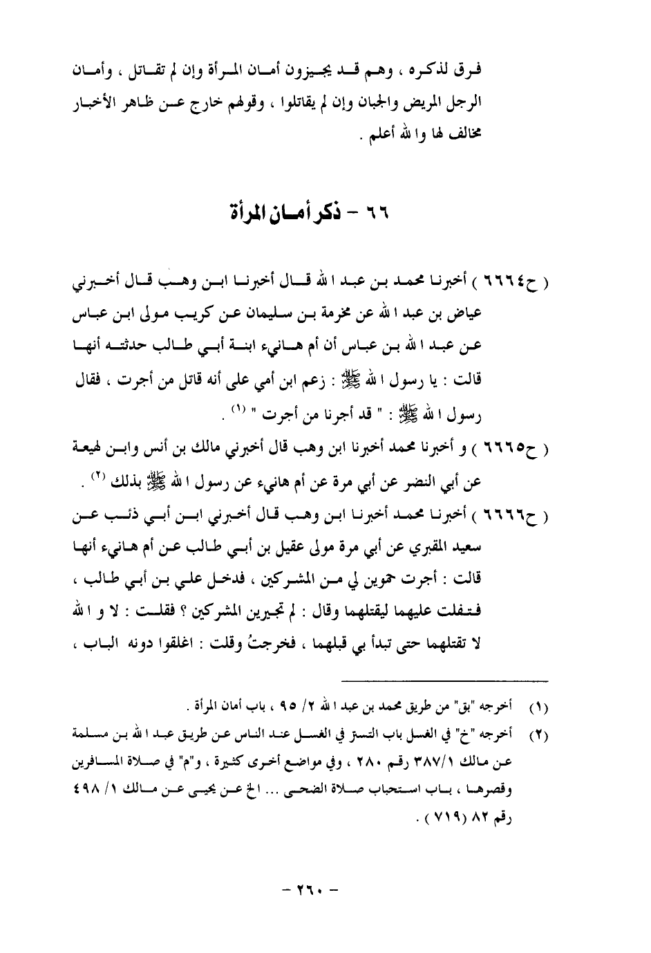6666 - وَأَخْبَرَنَا مُحَمَّدٌ، أَخْبَرَنَا ابْنُ وَهْبٍ، قَالَ: أَخْبَرَنِي ابْنُ أَبِي ذِئْبٍ، عَنْ سَعِيدٍ الْمَقْبُرِيِّ عَنْ أَبِي مُرَّة مَوْلَى عَقِيلِ بْنِ أَبِي طَالِبٍ، عَنْ أُمِّ هَانِئٍ، أَنَّهَا قَالَتْ: أَجَرْتُ حَمْوَيْنِ لِي مِنَ الْمُشْرِكِينَ، فَدَخَلَ عَلِيُّ بْنُ أَبِي طَالِبٍ، فَتَفَلَّتَ عَلَيْهِمَا لِيَقْتُلَهُمَا، وَقَالَ: لَمْ تُجِيرِينَ الْمُشْرِكِينَ؟ فَقُلْتُ: لَا وَاللهِ، لَا تَقْتُلْهُمَا حَتَّى تَبْدَأَ بِي قَبْلَهُمَا، فَخَرَجْتُ، وَقُلْتُ: أَغْلِقُوا دُونَهُ الْبَابَ، -[261]- وَذَهَبْتُ إِلَى رَسُولِ اللهِ صَلَّى اللَّهُ عَلَيْهِ وَسَلَّمَ، فَأَخْبَرْتُهُ، فَقَالَ: «مَا كَانَ ذَلِكَ لَهُ، وَقَدْ أَمَّنَّا مَنْ أَمَّنْتَ، وَأَجَرَنَا مَنْ أَجَرْتَ»