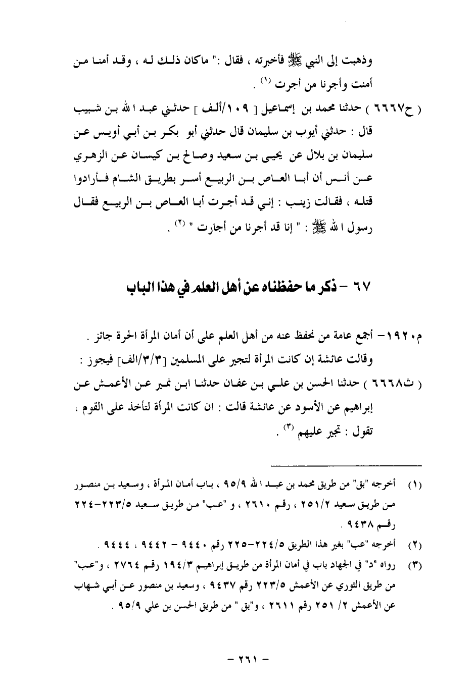6668 - حَدَّثَنَا الْحَسَنُ بْنُ عَلِيِّ بْنِ عَفَّانَ، حَدَّثَنَا ابْنُ نُمَيْرٍ، عَنِ الْأَعْمَشِ، عَنْ إِبْرَاهِيمَ، عَنِ الْأَسْوَدِ، عَنْ عَائِشَةَ، قَالَتْ: إِنْ كَانَتِ الْمَرْأَةُ لَتَأْخُذُ عَلَى الْقَوْمِ تَقُولُ: «تُجِيرُ عَلَيْهِمْ» -[262]- وَمِمَّنْ قَالَ بِأَنَّ أَمَانَ الْمَرْأَةِ جَائِزٌ مَالِكُ بْنُ أَنَسٍ، وَسُفْيَانُ الثَّوْرِيُّ، وَالْأَوْزَاعِيُّ، وَالشَّافِعِيُّ، وَأَحْمَدُ، وَإِسْحَاقُ، وَأَصْحَابُ الرَّأْيِ. وَكَذَلِكَ نَقُولُ: وَدَلَّتِ الْأَخْبَارُ الثَّابِتَةُ عَنْ رَسُولِ اللهِ صَلَّى اللَّهُ عَلَيْهِ وَسَلَّمَ الدَّالَّةُ عَلَى ذَلِكَ إِجَارَةُ أُمِّ هَانِئٍ، وَزَيْنَبَ بِنْتِ رَسُولِ اللهِ صَلَّى اللَّهُ عَلَيْهِ وَسَلَّمَ، فَأَمْضَى رَسُولُ اللهِ صَلَّى اللَّهُ عَلَيْهِ وَسَلَّمَ لَهُمَا ذَلِكَ، وَقَالَتْ عَائِشَةُ: إِنْ كَانَتِ الْمَرْأَةُ لَتُجِيرُ عَلَى الْمُسْلِمِينَ، فَيَجُوزُ ذَلِكَ؛ وَلِهَذَا قَالَ كُلُّ مَنْ نَحْفَظُ عَنْهُ مِنْ عُلَمَاءِ الْأَمْصَارِ، إِلَّا شَيْئًا ذَكَرَهُ عَبْدُ الْمَلِكِ صَاحِبُ مَالِكٍ، لَا أَحْفَظُ ذَلِكَ عَنْ غَيْرِهِ، سُئِلَ عَبْدُ الْمَلِكِ عَنِ الْأَمَانِ إِلَى مَنْ هُوَ؟ فَقَالَ: ذَاكَ إِلَى الْأَئِمَّةِ، وَوَالِي الْجَيْشِ، وَوَالِي السَّرِيَّةِ، وَالْجَيْشِ، قِيلَ: فَمَا جَاءَ أَنَّهُ يُجِيرُ عَلَى الْمُسْلِمِينَ أَدْنَاهُمْ، وَيَرُدُّ عَلَيْهِمْ أَقْصَاهُمْ، وَمَا جَاءَ مِنْ أَمْرِ أُمِّ هَانِئٍ، وَمَنْ أَجَارَتْ، فَقَالَ: لَعَلَّ الَّذِي جَاءَ مِنْ ذَلِكَ، إِنَّمَا كَانَ بَعْدَمَا بَاتَتْ وُجُوهُهُ، وَعَلِمَ أَنَّهُ فِي تِلْكَ الْحَالِ أَوْلَى، وَهُوَ الْمُصْلِحُ الْإِسْلَامَ وَأَهْلَهُ، وَلَعَلَّ ذَلِكَ فِي ذَلِكَ الْوَقْتِ خَاصَّةً، فَأَمَّا أَمْرُ الْأَمَانِ، فَهُوَ إِلَى الْإِمَامِ، وَهُوَ فِيمَا أَعْلَمُ مِنْ أَعْظَمِ مَا اسْتَعْمَلَ لَهُ. قَالَ أَبُو بَكْرٍ: يَتْرُكُ ظَاهِرَ الْأَخْبَارِ بِأَنْ يُكَرِّرَ «لَعَلَّ» فِي كَلَامِهِ، وَقَلَّ شَيْءٌ إِلَّا وَهُوَ يَحْتَمِلُ «لَعَلَّ» وَتَرْكُ ظَاهِرِ الْأَخْبَارِ غَيْرُ جَائِزٍ لِلْعِلَلِ، وَفِي قَوْلِ رَسُولِ اللهِ صَلَّى اللَّهُ عَلَيْهِ وَسَلَّمَ: «وَيَسْعَى بِذِمَّتِهِمْ أَدْنَاهُمْ» ، دَلِيلٌ عَلَى إِغْفَالِ هَذَا الْقَائِلِ، ثُمَّ هُوَ مَعَ ذَلِكَ خِلَافُ خَبَرِ أُمِّ هَانِئٍ، وَزَيْنَبَ بِنْتِ رَسُولِ اللهِ صَلَّى اللَّهُ عَلَيْهِ وَسَلَّمَ، وَخِلَافُ قَوْلِ عَائِشَةَ، وَخِلَافُ مَا قَالَ أُسْتَاذُهُ مَالِكٌ، وَمَا عَلَيْهِ أَهْلُ الْمَدِينَةِ، وَأَهْلُ الْكُوفَةِ، وَأَهْلُ الشَّامِ، وَأَصْحَابُ الْحَدِيثِ، وَأَهْلُ الرَّأْيِ، وَبِخَبَرِ عَائِشَةَ فِي ذَلِكَ فِيمَا مَضَى، كَانَ يَجُوزُ