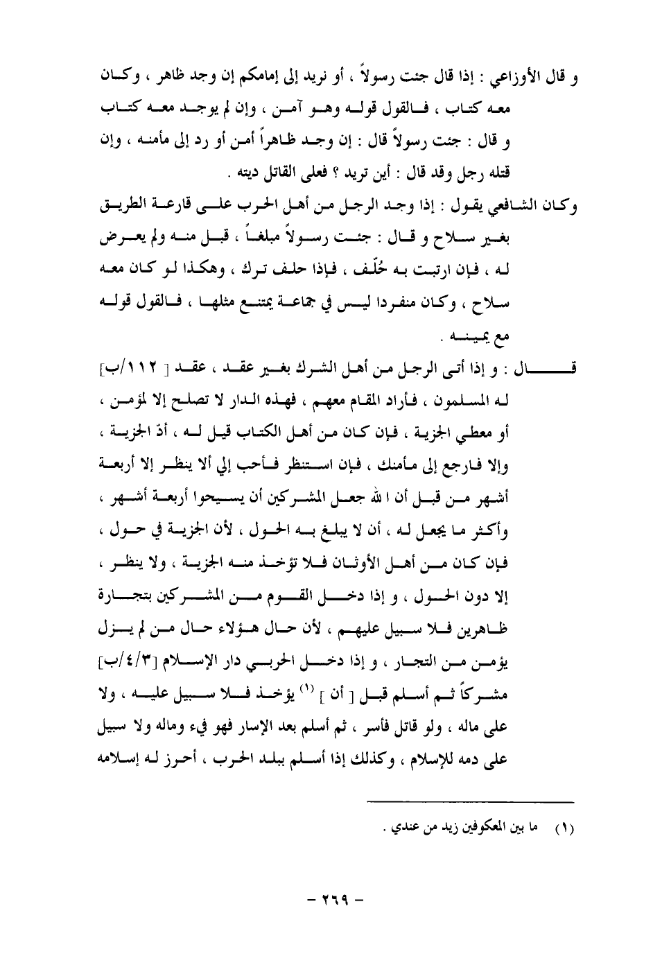 وَقَالَ الْأَوْزَاعِيُّ: إِذَا قَالَ: جِئْتُ رَسُولًا، أَوْ نُرِيدُ إِلَى إِمَامِكُمْ إِنْ وُجِدَ ظَاهِرًا، وَكَانَ مَعَهُ كِتَابٌ، فَالْقَوْلُ قَوْلُهُ، وَهُوَ آمِنٌ، وَإِنْ لَمْ يُوجَدْ مَعَهُ كِتَابٌ، وَقَالَ: جِئْتُ رَسُولًا، قَالَ: إِنْ وُجِدَ ظَاهِرًا أُمِّنَ أَوْ رُدَّ إِلَى مَأْمَنِهِ، وَإِنْ قَتَلَهُ رَجُلٌ وَقَدْ قَالَ: أَيْنَ تُرِيدُ؟ فَعَلَى الْقَاتِلِ دِيَتُهُ. وَكَانَ الشَّافِعِيُّ يَقُولُ: إِذَا وُجِدَ الرَّجُلُ مِنْ أَهْلِ الْحَرْبِ عَلَى قَارِعَةِ الطَّرِيقِ بِغَيْرِ سِلَاحٍ، وَقَالَ: جِئْتُ رَسُولًا مُبَلِّغًا، قَبْلَ مِنْهُ وَلَمْ يَعْرِضْ لَهُ، فَإِنِ ارْتَبْتَ بِهِ حُلِّفَ، فَإِذَا حَلَفَ تُرِكَ، وَهَكَذَا لَوْ كَانَ مَعَهُ سِلَاحٌ، وَكَانَ مُنْفَرِدًا لَيْسَ فِي جَمَاعَةٍ يَمْتَنِعُ مِثْلُهَا، فَالْقَوْلُ قَوْلُهُ مَعَ يَمِينِهِ. قَالَ: وَإِذَا أَتَى الرَّجُلُ مِنْ أَهْلِ الشِّرْكِ بِغَيْرِ عَقْدٍ، عَقَدَ لَهُ الْمُسْلِمُونَ، فَأَرَادَ الْمُقَامَ مَعَهُمْ، فَهَذِهِ الدَّارُ لَا تَصْلُحُ إِلَّا لِمُؤْمِنٍ، أَوْ مُعْطِي الْجِزْيَةِ، فَإِنْ كَانَ مِنْ أَهْلِ الْكِتَابِ قِيلَ لَهُ: أَدِّ الْجِزْيَةَ، وَإِلَّا فَارْجِعْ إِلَى مَأْمَنِكَ، فَإِنِ اسْتُنْظِرَ فَأَحَبُّ إِلَيَّ أَلَّا يُنْظَرَ إِلَّا أَرْبَعَةَ أَشْهُرٍ مِنْ قِبَلِ أَنَّ اللهَ جَعَلَ الْمُشْرِكِينَ أَنْ يَسِيحُوا أَرْبَعَةَ أَشْهُرٍ، وَأَكْثَرُ مَا يُجْعَلُ لَهُ أَنْ لَا يَبْلُغَ بِهِ الْحَوْلُ؛ لِأَنَّ الْجِزْيَةَ فِي حَوْلٍ، فَإِنْ كَانَ مِنْ أَهْلِ الْأَوْثَانِ فَلَا تُؤْخَذُ مِنْهُ الْجِزْيَةُ، وَلَا يُنْظَرُ، إِلَّا دُونَ الْحَوْلِ، وَإِذَا دَخَلَ الْقَوْمُ مِنَ الْمُشْرِكِينَ بِتِجَارَةٍ ظَاهِرِينَ فَلَا سَبِيلَ عَلَيْهِمْ؛ لِأَنَّ حَالَ هَؤُلَاءِ حَالُ مَنْ لَمْ يَزَلْ يُؤَمَّنُ مِنَ التُّجَّارِ، وَإِذَا دَخَلَ الْحَرْبِيُّ دَارَ الْإِسْلَامِ مُشْرِكًا، ثُمَّ أَسْلَمَ قَبْلَ أَنْ يُؤْخَذَ فَلَا سَبِيلَ عَلَيْهِ، وَلَا عَلَى مَالِهِ، وَلَوْ قَاتَلَ فَأُسِرَ، ثُمَّ أَسْلَمَ بَعْدَ الْإِسَارِ فَهُوَ فَيْءٌ وَمَالُهُ، وَلَا سَبِيلَ عَلَى دَمِهِ لِلْإِسْلَامِ، وَكَذَلِكَ إِذَا أَسْلَمَ بِبَلَدِ الْحَرْبِ، أَحْرَزَ لَهُ إِسْلَامُهُ