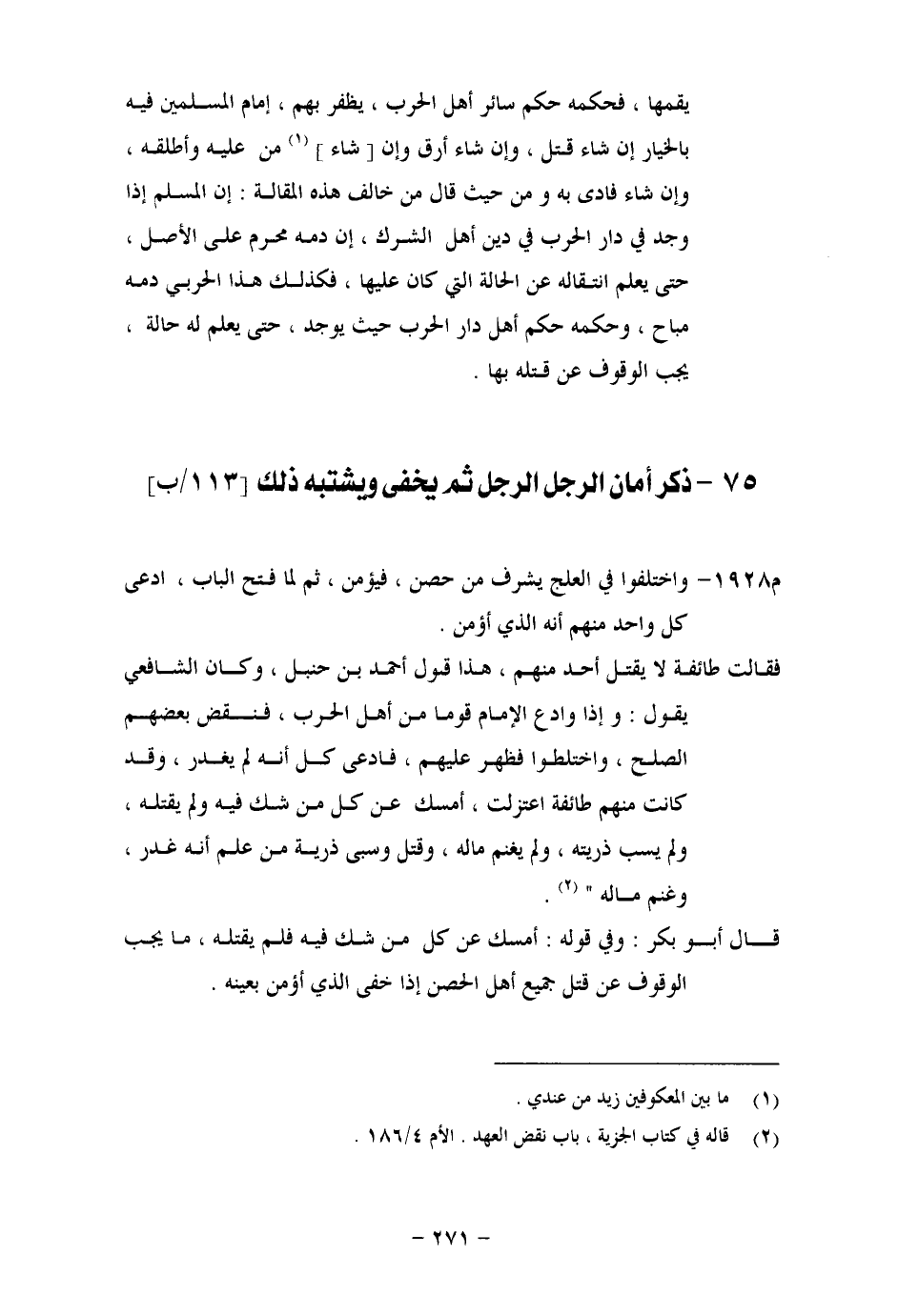 ذِكْرُ أَمَانِ الرَّجُلِ الرَّجُلَ ثُمَّ يَخْفَى وَيَشْتَبِهُ ذَلِكَ وَاخْتَلَفُوا فِي الْعِلْجِ يُشْرِفُ مِنْ حِصْنٍ، فَيُؤَمَّنُ، ثُمَّ لَمَّا فُتِحَ الْبَابُ، ادَّعَى كُلُّ وَاحِدٍ مِنْهُمْ أَنَّهُ الَّذِي أُمِّنَ. فَقَالَتْ طَائِفَةٌ: لَا يُقْتَلُ أَحَدٌ مِنْهُمْ، هَذَا قَوْلُ أَحْمَدَ بْنِ حَنْبَلٍ، وَكَانَ الشَّافِعِيُّ يَقُولُ: وَإِذَا وَادَعَ الْإِمَامُ قَوْمًا مِنْ أَهْلِ الْحَرْبِ فَنَقَضَ بَعْضُهُمُ الصُّلْحَ، وَاخْتَلَطُوا فَظَهَرَ عَلَيْهِمْ، فَادَّعَى كُلٌّ أَنَّهُ لَمْ يَغْدِرْ، وَقَدْ كَانَتْ مِنْهُمْ طَائِفَةٌ اعْتَزَلَتْ، أَمْسَكَ عَنْ كُلِّ مَنْ شَكَّ فِيهِ وَلَمْ يَقْتُلْهُ، وَلَمْ يَسُبَّ ذُرِّيَّتَهُ، وَلَمْ يَغْنَمْ مَالَهُ، وَقَتَلَ وَسَبَى ذُرِّيَّةَ مَنْ عَلِمَ أَنَّهُ غَدَرَ، وَغَنَمَ مَالَهُ ". قَالَ أَبُو بَكْرٍ: وَفِي قَوْلِهِ: " أَمْسَكَ عَنْ كُلِّ مَنْ شَكَّ فِيهِ فَلَمْ يَقْتُلْهُ، مَا يَجِبُ الْوُقُوفُ عَنْ قَتْلِ جَمِيعِ أَهْلِ الْحِصْنِ إِذَا خَفِيَ الَّذِي أُمِّنَ بِعَيْنِهِ.