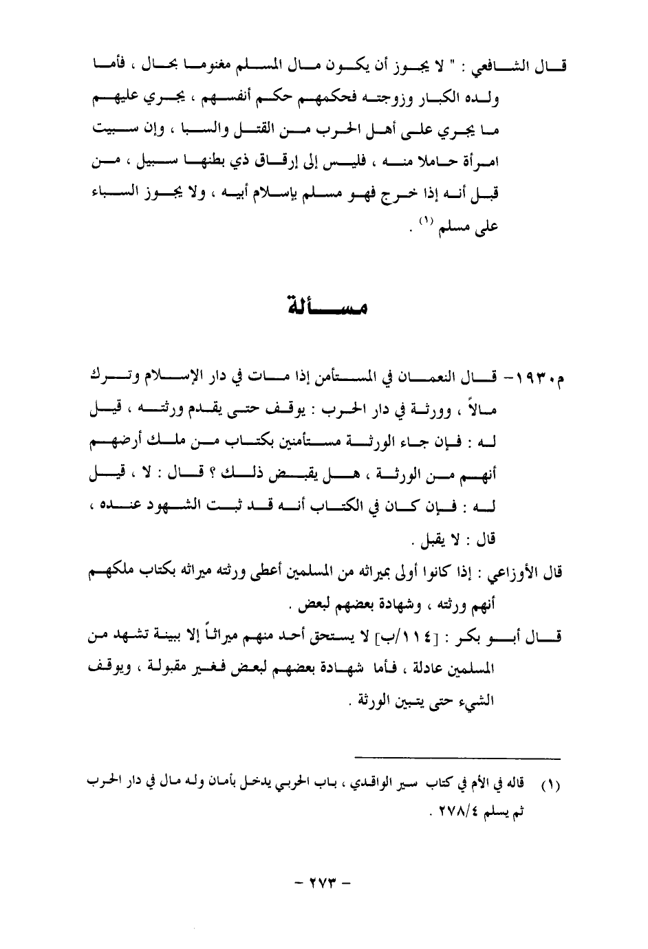 مَسْأَلَةٌ قَالَ النُّعْمَانُ فِي الْمُسْتَأْمَنِ إِذَا مَاتَ فِي دَارِ الْإِسْلَامِ وَتَرَكَ مَالًا، وَوَرَثَةً فِي دَارِ الْحَرْبِ: يُوقَفُ حَتَّى يَقْدَمَ وَرَثَتُهُ، قِيلَ لَهُ: فَإِنْ جَاءَ الْوَرَثَةُ مُسْتَأْمَنِينَ بِكِتَابٍ مِنْ مَلِكِ أَرْضِهِمْ أَنَّهُمْ مِنَ الْوَرَثَةِ، هَلْ يَقْبِضُ ذَلِكَ؟ قَالَ: لَا، قِيلَ لَهُ: فَإِنْ كَانَ فِي الْكِتَابِ أَنَّهُ قَدْ ثَبَتَ الشُّهُودُ عِنْدَهُ، قَالَ: لَا يُقْبَلُ. قَالَ الْأَوْزَاعِيُّ: إِذَا كَانُوا أَوْلَى بِمِيرَاثِهِ مِنَ الْمُسْلِمِينَ أُعْطِيَ وَرَثَتُهُ مِيرَاثَهُ بِكِتَابِ مَلِكِهِمْ أَنَّهُمْ وَرَثَتُهُ، وَشَهَادَةُ بَعْضِهِمْ لِبَعْضٍ. قَالَ أَبُو بَكْرٍ: لَا يَسْتَحِقُّ أَحَدٌ مِنْهُمْ مِيرَاثًا إِلَّا بِبَيِّنَةٍ تَشْهَدُ مِنَ الْمُسْلِمِينَ عَادِلَةٍ، فَأَمَّا شَهَادَةُ بَعْضِهِمْ لِبَعْضٍ فَغَيْرُ مَقْبُولَةٍ، وَيُوقَفُ الشَّيْءُ حَتَّى يَتَبَيَّنَ الْوَرَثَةُ