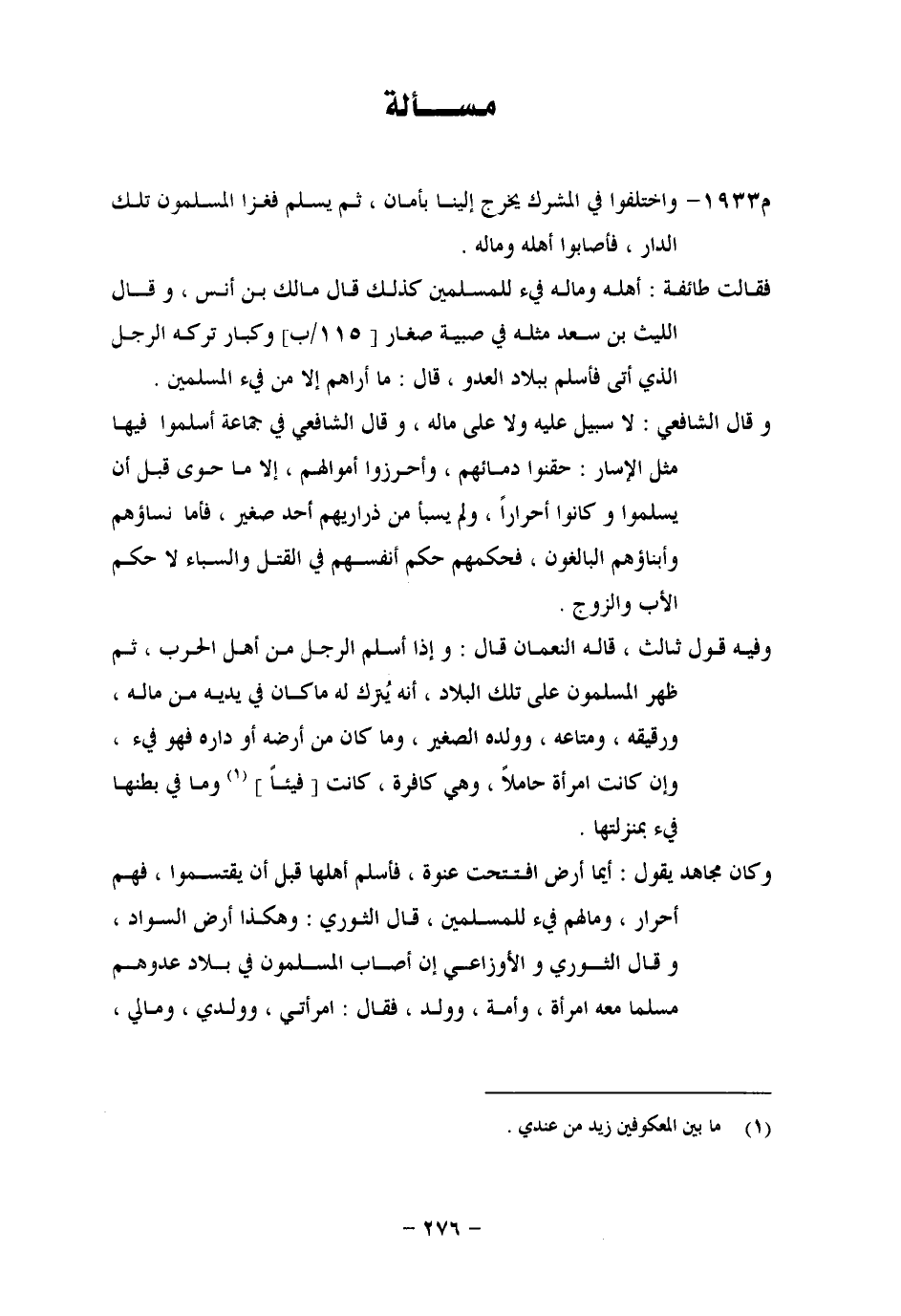 مَسْأَلَةٌ وَاخْتَلَفُوا فِي الْمُشْرِكِ يَخْرُجُ إِلَيْنَا بِأَمَانٍ، ثُمَّ يُسْلِمُ فَغَزَا الْمُسْلِمُونَ تِلْكَ الدَّارَ، فَأَصَابُوا أَهْلَهُ وَمَالَهُ. فَقَالَتْ طَائِفَةٌ: أَهْلُهُ وَمَالُهُ فَيْءُ الْمُسْلِمِينَ، كَذَلِكَ قَالَ مَالِكُ بْنُ أَنَسٍ، وَقَالَ اللَّيْثُ بْنُ سَعْدٍ مِثْلَهُ فِي صِبْيَةٍ صِغَارٍ، وَكِبَارٍ تَرَكَهُ الرَّجُلُ الَّذِي أَتَى فَأَسْلَمَ بِبِلَادِ الْعَدُوِّ، قَالَ: مَا أَرَاهُمْ مِنْ فَيْءِ الْمُسْلِمِينَ. وَقَالَ الشَّافِعِيُّ: لَا سَبِيلَ عَلَيْهِ وَعَلَى مَالِهِ، وَقَالَ الشَّافِعِيُّ فِي جَمَاعَةٍ أَسْلَمُوا فِيهَا مِثْلُ الْإِسَارِ: حَقَنُوا دِمَاءَهُمْ، وَأَحْرَزُوا أَمْوَالَهُمْ، إِلَّا مَا حَوَى قَبْلَ أَنْ يُسْلِمُوا، وَكَانُوا أَحْرَارًا، وَلَمْ يُسْبَى مِنْ ذَرَارِيِّهِمْ أَحَدٌ صَغِيرٌ، فَأَمَّا نِسَاؤُهُمْ وَأَبْنَاؤُهُمُ الْبَالِغُونَ، فَحُكْمُهُمْ حُكْمُ أَنْفُسِهِمْ فِي الْقَتْلِ وَالسِّبَاءِ لَا حُكْمُ الْأَبِ وَالزَّوْجِ. وَفِيهِ قَوْلٌ ثَالِثٌ، قَالَهُ النُّعْمَانُ، قَالَ: وَإِذَا أَسْلَمَ الرَّجُلُ مِنْ أَهْلِ الْحَرْبِ، ثُمَّ ظَهَرَ الْمُسْلِمُونَ عَلَى تِلْكَ الْبِلَادِ، أَنَّهُ يُتْرَكُ لَهُ مَا كَانَ فِي يَدَيْهِ مِنْ مَالِهِ، وَرَقِيقِهِ، وَمَتَاعِهِ، وَوَلَدِهِ الصَّغِيرِ، وَمَا كَانَ مِنْ أَرْضِهِ أَوْ دَارِهِ فَهُوَ فَيْءٌ، وَإِنْ كَانَتِ امْرَأَةٌ حَامِلًا، وَهِيَ كَافِرَةٌ، كَانَتْ فَيْئًا، وَمَا فِي بَطْنِهَا فَيْءٌ بِمَنْزِلَتِهَا. وَكَانَ مُجَاهِدٌ يَقُولُ: أَيُّمَا أَرْضٍ افْتُتِحَتْ عَنْوَةً، فَأَسْلَمَ أَهْلُهَا قَبْلَ أَنْ يَقْتَسِمُوا، فَهُمْ أَحْرَارٌ، وَمَا لَهُمْ فَيْءٌ لِلْمُسْلِمِينَ، قَالَ الثَّوْرِيُّ: وَهَكَذَا أَرْضُ السَّوَادِ، وَقَالَ الثَّوْرِيُّ وَالْأَوْزَاعِيُّ: إِنْ أَصَابَ الْمُسْلِمُونَ فِي بِلَادِ عَدُوِّهِمْ مُسْلِمًا مَعَهُ امْرَأَةٌ وَأَمَةٌ وَوَلَدٌ، فَقَالَ: امْرَأَتِي وَوَلَدِي وَمَالِي