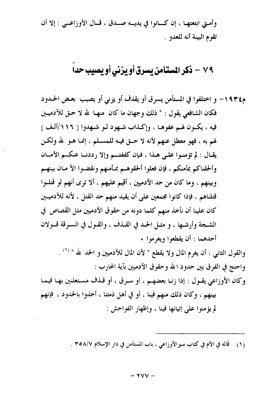 ذِكْرُ الْمُسْتَأْمَنِ يَسْرِقُ أَوْ يَزْنِي أَوْ يُصِيبُ حَدًّا وَاخْتَلَفُوا فِي الْمُسْتَأْمَنِ يَسْرِقُ، أَوْ يَقْذِفُ، أَوْ يَزْنِي، أَوْ يُصِيبُ بَعْضَ الْحُدُودِ، فَكَانَ الشَّافِعِيُّ يَقُولُ: ذَلِكَ وَجْهَانِ مَا كَانَ مِنْهَا لِلَّهِ لَا حَقَّ لِلْآدَمَيِّينَ فِيهِ، يَكُونُ لَهُمْ عَفْوُهَا، وَإِكْذَابُ شُهُودٍ لَوْ شَهِدُوا لَهُمْ بِهِ، فَهُوَ مُعَطَّلٌ عَنْهُمْ؛ لِأَنَّهُ لَا حَقَّ فِيهِ لِلْمُسْلِمِ، إِنَّمَا هُوَ لِلَّهِ، وَلَكِنْ يُقَالُ: لَمْ تُؤَمَّنُوا عَلَى هَذَا، فَإِنْ كَفَفْتُمْ وَإِلَّا رَدَدْنَا عَنْكُمُ الْأَمَانَ وَأَلْحَقْنَاكُمْ بِمَأْمَنِكُمْ، فَإِنْ فَعَلُوا أَلْحَقُوهُمْ بِمَأْمَنِهِمْ وَنَقَضُوا الْأَمَانَ بَيْنَهُمْ وَبَيْنَهُمْ، وَمَا كَانَ مِنْ حَدِّ الْآدَمِيِّينَ أُقِيمَ عَلَيْهِمْ، أَلَا تَرَى أَنَّهُمْ لَوْ قَتَلُوا قَتَلْنَاهُمْ، فَإِذَا كَانُوا مُجْتَمِعِينَ عَلَى أَنْ يُقِيدَ مِنْهُمْ حَدُّ الْقَتْلِ، لِأَنَّهُ لِلْآدَمَيِّينَ كَانَ عَلَيْنَا أَنْ نَأْخُذَ مِنْهُمْ كُلَّ مَا دُونَهُ مِنْ حُقُوقِ الْآدَمِيِّينَ مِثْلَ الْقِصَاصِ فِي الشَّجَّةِ وَأَرْشِهَا، وَمَثَلَ الْحَدِّ فِي الْقَذْفِ. وَالْقَوْلُ فِي السَّرِقَةِ قَوْلَانِ أَحَدُهُمَا: أَنْ يُقَطَّعُوا وَيُغَرَّمُوا. وَالْقَوْلُ الثَّانِي: أَنْ يُغَرَّمَ الْمَالَ، وَلَا يُقَطَّعُ؛ لِأَنَّ الْمَالَ لِلْآدَمَيِّينَ وَالْحَدَّ لِلَّهِ ". وَاحْتُجَّ فِي الْفَرْقِ بَيْنَ حُدُودِ اللهِ وَحُقُوقِ الْآدَمِيِّينَ بِآيَةِ الْمُحَارِبِ. وَكَانَ الْأَوْزَاعِيُّ يَقُولُ: إِذَا زَنَى بَعْضُهُمْ، أَوْ سَرَقَ، أَوْ قَذَفَ مُسْتَعْلِنِينَ بِهَا فِيمَا بَيْنَهُمْ، وَكَانَ ذَلِكَ مِنْهُمْ فِينَا، أَوْ فِي أَهْلِ ذِمَّتِنَا، أُخِذُوا بِالْحُدُودِ، فَإِنَّهُمْ لَمْ يُؤَمَّنُوا عَلَى إِتْيَانِهَا فِينَا، وَإِظْهَارِ الْفَوَاحِشِ،