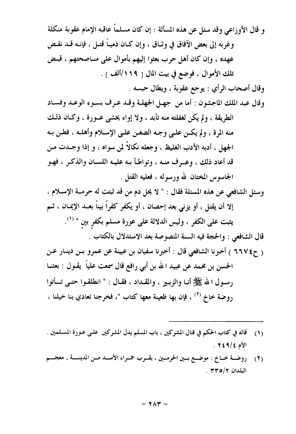 6674 - أَخْبَرَنَا الشَّافِعِيُّ، قَالَ: أَخْبَرَنَا سُفْيَانُ بْنُ عُيَيْنَةَ، عَنْ عَمْرِو بْنِ دِينَارٍ، عَنِ الْحَسَنِ بْنِ مُحَمَّدِ بْنِ عُبَيْدِ اللهِ بْنِ أَبِي رَافِعٍ، قَالَ: سَمِعْتُ عَلِيًّا، يَقُولُ: بَعَثَنَا رَسُولُ اللهِ صَلَّى اللَّهُ عَلَيْهِ وَسَلَّمَ أَنَا وَالزُّبَيْرُ، وَالْمِقْدَادُ، فَقَالَ: «انْطَلِقُوا حَتَّى تَأْتُوا رَوْضَةَ خَاخٍ، فَإِنَّ بِهَا ظَعِينَةً مَعَهَا كِتَابٌ» ، فَخَرَجْنَا تُعَادِي بِنَا خَيْلُنَا، -[284]- فَإِذَا نَحْنُ بِظَعِينَةٍ، فَقُلْنَا: أَخْرِجِي الْكِتَابَ، فَقَالَتْ: مَا مَعِي كِتَابٌ، فَقُلْنَا: لَتُخْرِجِنَّ الْكِتَابَ أَوْ لَتُلْقِيَنَّ الثِّيَابَ، فَأَخْرَجَتْهُ مِنْ عِقَاصِهَا، فَأَتَيْنَا بِهِ رَسُولَ اللهِ صَلَّى اللَّهُ عَلَيْهِ وَسَلَّمَ فَإِذَا فِيهِ: مِنْ حَاطِبِ بْنِ أَبِي بَلْتَعَةَ إِلَى أُنَاسٍ مِنَ الْمُشْرِكِينَ مِمَّنْ بِمَكَّةَ، يُخْبِرُ بِبَعْضِ أَمَرِ رَسُولِ اللهِ صَلَّى اللَّهُ عَلَيْهِ وَسَلَّمَ، فَقَالَ: «مَا هَذَا يَا حَاطِبُ؟» ، فَقَالَ: لَا تَعْجَلْ عَلَيَّ إِنِّي كُنْتُ امْرَأً مُلْصَقًا فِي قُرَيْشٍ، وَلَمْ أَكُنْ مِنْ أَنْفُسِهَا، وَكَانَ مَنْ مَعَكَ مِنَ الْمُهَاجِرِينَ مَنْ لَهُمْ قَرَابَاتٌ يَحْمُونَ بِهَا قَرَابَاتِهِمْ، وَلَمْ يَكُنْ لِي بِمَكَّةَ قَرَابَةٌ، فَأَحْبَبْتُ إِذْ فَاتَنِي ذَلِكَ، أَنْ أَتَّخِذَ عِنْدَهُمْ يَدًا، وَاللهِ مَا فَعَلْتُهُ شَكًّا فِي دِينِي، وَلَا رِضًا بِالْكُفْرِ بَعْدَ الْإِسْلَامِ، فَقَالَ رَسُولُ اللهِ صَلَّى اللَّهُ عَلَيْهِ وَسَلَّمَ: «صَدَقَ» ، فَقَالَ عُمَرُ: يَا رَسُولَ اللهِ، دَعْنِي أَضْرِبُ هَذَا الْمُنَافِقَ، فَقَالَ النَّبِيُّ صَلَّى اللَّهُ عَلَيْهِ وَسَلَّمَ: " إِنَّهُ قَدْ شَهِدَ، وَمَا يُدْرِيكَ لَعَلَّ اللهَ قَدِ اطَّلَعَ عَلَى أَهْلِ بَدْرٍ، فَقَالَ: اعْمَلُوا مَا شِئْتُمْ قَدْ غَفَرْتُ لَكُمْ "، وَنَزَلَتْ: {يَا أَيُّهَا الَّذِينَ آمَنُوا لَا تَتَّخِذُوا عَدُوِّي وَعَدُوَّكُمْ أَوْلِيَاءَ} [الممتحنة: 1] الْآيَةُ قَالَ الشَّافِعِيُّ: وَفِي هَذَا الْحَدِيثِ مَعَ مَا وَصَفْتُ لَكَ طَرْحُ الْحُكْمِ بِاسْتِعْمَالِ الظُّنُونِ، لِأَنَّهُ لَمَّا كَانَ الْكِتَابُ يَحْتَمِلُ أَنْ يَكُونَ مَا قَالَ حَاطِبٌ كَمَا قَالَ، وَاحْتَمَلَ الْمَعْنَى الْأَصَحَّ، كَانَ الْقَوْلُ قَوْلُهُ فِيمَا احْتَمَلَ فِعْلَهُ، وَحُكْمُ رَسُولِ اللهِ صَلَّى اللَّهُ عَلَيْهِ وَسَلَّمَ فِيهِ بِأَنْ لَمْ يَقْتُلْهُ، وَلَمْ يَسْتَعْمِلْ عَلَيْهِ الْأَغْلَبَ، وَلَا أَعْلَمُ أَحَدًا -[285]- أَتَى فِي مِثْلِ هَذَا أَعْظَمَ فِي الظَّاهِرِ مِنْ هَذَا، لِأَنَّ أَمْرَ رَسُولِ اللهِ صَلَّى اللَّهُ عَلَيْهِ وَسَلَّمَ مُبَايِنٌ فِي عَظَمَتِهِ لِجَمِيعِ الْآدَمِيِّينَ بَعْدَهُ، وَإِذَا كَانَ مَنْ خَانَ مِنَ الْمُسْلِمِينَ رَسُولَ اللهِ، وَرَسُولُ اللهِ صَلَّى اللَّهُ عَلَيْهِ وَسَلَّمَ يُرِيدُ عُزْلَتَهُمْ فَصَدَّقَهُ عَلَى مَا عَابَ عَلَيْهِ مِنْ ذَلِكَ، غَيْرُ مُسْتَعْمَلٍ عَلَيْهِ الْأَغْلَبَ مِمَّا يَقَعُ فِي النُّفُوسِ، فَيَكُونُ لِذَلِكَ مَقْبُولًا، كَانَ مَنْ بَعْدَهُ فِي أَقَلِّ مِنْ حَالِهِ وَأَوْلَى أَنْ يُقْبَلَ مِنْهُ مَا قِيلَ فِيهِ. قَالَ الشَّافِعِيُّ: فَإِذَا كَانَ هَذَا مِنَ الرَّجُلِ ذِي الْهَيْئَةِ بِجَهَالَةٍ، كَمَا كَانَ هَذَا مِنْ حَاطِبٍ بِجَهَالَةٍ، وَكَانَ غَيْرَ مُتَّهَمٍ، أَحْبَبْتُ أَنْ يُتَجَافَى عَنْهُ، وَإِنْ كَانَ مِنْ غَيْرِ ذِي الْهَيْئَةِ كَانَ لِلْإِمَامِ، وَاللهُ أَعْلَمُ، تَعْزِيرُهُ