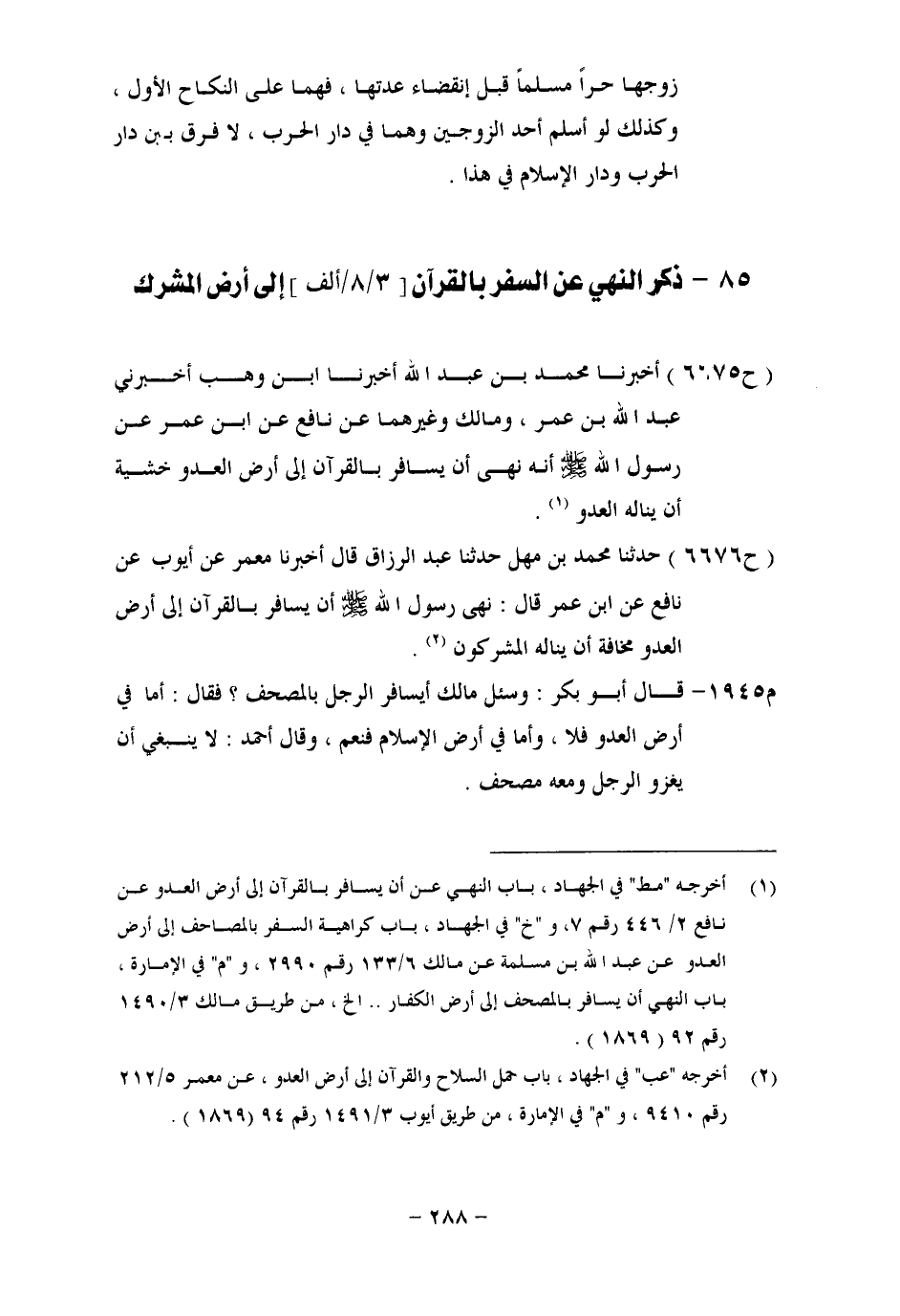 6676 - حَدَّثَنَا مُحَمَّدُ بْنُ مَهَلٍ، حَدَّثَنَا عَبْدُ الرَّزَّاقِ، قَالَ: أَخْبَرَنَا مَعْمَرٌ، عَنْ أَيُّوبَ، عَنْ نَافِعٍ، عَنِ ابْنِ عُمَرَ، قَالَ: نَهَى رَسُولُ اللهِ صَلَّى اللَّهُ عَلَيْهِ وَسَلَّمَ أَنْ يُسَافَرَ بِالْقُرْآنِ إِلَى أَرْضِ الْعَدُوِّ؛ مَخَافَةَ أَنْ يَنَالَهُ الْمُشْرِكُونَ " قَالَ أَبُو بَكْرٍ: وَسُئِلَ مَالِكٌ: أَيُسَافَرُ الرَّجُلُ بِالْمُصْحَفِ؟ فَقَالَ: أَمَّا فِي أَرْضِ الْعَدُوِّ فَلَا، وَأَمَّا فِي أَرْضِ الْإِسْلَامِ فَنَعْمَ. وَقَالَ أَحْمَدُ: لَا يَنْبَغِي أَنْ يَغْزُوَ الرَّجُلُ مَعَهُ مُصْحَفٌ. -[289]- قَالَ أَبُو بَكْرٍ: وَخَالَفَ النُّعْمَانُ الْخَبَرَ الثَّابِتَ عَنْ رَسُولِ اللهِ صَلَّى اللَّهُ عَلَيْهِ وَسَلَّمَ فِي هَذَا الْبَابِ، وَمَا جَاءَ فِي ذَلِكَ عَنْ عُمَرَ بْنِ الْخَطَّابِ، وَعُمَرَ بْنِ عَبْدِ الْعَزِيزِ، فَقَالَ: لَا بَأْسَ أَنْ يُسَافَرَ بِالْقُرْآنِ فِي أَرْضِ الْحَرْبِ
