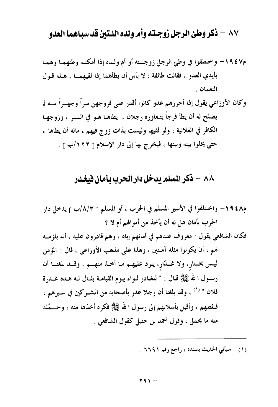 ذِكْرُ الْمُسْلِمِ يَدْخُلُ دَارَ الْحَرْبِ بِأَمَانٍ فَيَغْدِرُ وَاخْتَلَفُوا فِي الْأَسِيرِ الْمُسْلِمِ فِي الْحَرْبِ، أَوِ الْمُسْلِمِ يَدْخُلُ دَارَ الْحَرْبِ بِأَمَانٍ هَلْ لَهُ أَنْ يَأْخُذَ مِنْ أَمْوَالِهِمْ أَمْ لَا؟ فَكَانَ الشَّافِعِيُّ يَقُولُ: مَعْرُوفٌ عِنْدَهُمْ فِي أَمَانِهِمْ إِيَّاهُ، وَهُمْ قَادِرُونَ عَلَيْهِ، أَنَّهُ يَلْزَمُهُ لَهُمْ، أَنْ يَكُونُوا مِثْلَهُ آمِنِينَ، وَهَذَا عَلَى مَذْهَبِ الْأَوْزَاعِيِّ؛ قَالَ: الْمُؤْمِنُ لَيْسَ بِخَتَّارٍ، وَلَا غَدَّارٍ، يَرُدُّ عَلَيْهِمْ مَا أَخَذَ مِنْهُمْ، وَقَدْ بَلَغَنَا أَنَّ رَسُولَ اللهِ صَلَّى اللَّهُ عَلَيْهِ وَسَلَّمَ قَالَ: «لِلْغَادِرِ لِوَاءٌ يَوْمَ الْقِيَامَةِ يُقَالُ لَهُ هَذِهِ غَدْرَةُ فُلَانٍ» ، وَقَدْ بَلَغَنَا أَنَّ رَجُلًا غَدَرَ بِأَصْحَابِهِ مِنَ الْمُشْرِكِينَ فِي سَيْرِهِمْ، فَقَتَلَهُمْ، وَأَقْبَلَ بِأَسْلَابِهِمْ إِلَى رَسُولِ اللهِ صَلَّى اللَّهُ عَلَيْهِ وَسَلَّمَ فَكَرِهَ أَخْذَهَا مِنْهُ، وَحَمَّلَهُ مِنْهُ مَا يُحَمَّلُ، وَقَوْلُ أَحْمَدَ بْنِ حَنْبَلٍ كَقَوْلِ الشَّافِعِيِّ.