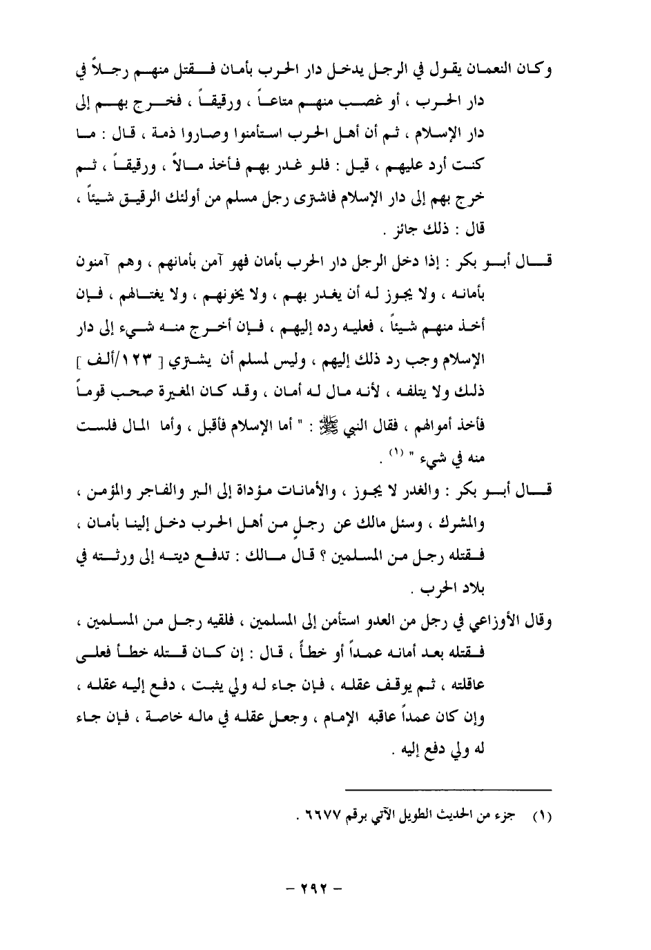 وَكَانَ النُّعْمَانُ يَقُولُ فِي الرَّجُلِ يَدْخُلُ دَارَ الْحَرْبِ بِأَمَانٍ , فَقَتَلَ مِنْهُمْ رَجُلًا فِي دَارِ الْحَرْبِ، أَوْ غَضِبَ مِنْهُمْ مَتَاعًا، وَرَقِيقًا، فَخَرَجَ بِهِمْ إِلَى دَارِ الْإِسْلَامِ، ثُمَّ إِنَّ أَهْلَ الْحَرْبِ اسْتَأْمَنُوا وَصَارُوا ذِمَّةً، قَالَ: مَا كُنْتُ أَرُدُّ عَلَيْهِمْ، قِيلَ: فَلَوْ غَدَرَ بِهِمْ فَأَخَذَ مَالًا، وَرَقِيقًا، ثُمَّ خَرَجَ بِهِمْ إِلَى دَارِ الْإِسْلَامِ , فَاشْتَرَى رَجُلٌ مُسْلِمٌ مِنْ أُولَئِكَ الرَّقِيقِ شَيْئًا، قَالَ: ذَلِكَ جَائِزٌ. قَالَ أَبُو بَكْرٍ: إِذَا دَخَلَ الرَّجُلُ دَارَ الْحَرْبِ بِأَمَانٍ فَهُوَ آمِنٌ بِأَمَانِهِمْ، وَهُمْ آمِنُونَ بِأَمَانِهِ , وَلَا يَجُوزُ لَهُ أَنْ يَغْدِرَ بِهِمْ، وَلَا يُخَوِّنَهُمْ، وَلَا يَغْتَالَهُمْ، فَإِنْ أَخَذَ مِنْهُمْ شَيْئًا، فَعَلَيْهِ رَدُّهُ إِلَيْهِمْ، فَإِنْ أَخْرَجَ مِنْهُ شَيْءٌ إِلَى دَارِ الْإِسْلَامِ وَجَبَ رَدَّ ذَلِكَ إِلَيْهِمْ، وَلَيْسَ لِمُسْلِمٍ أَنْ يَشْتَرِيَ ذَلِكَ وَلَا يُتْلِفَهُ؛ لِأَنَّهُ مَالٌ لَهُ أَمَانٌ، وَقَدْ كَانَ الْمُغِيرَةُ صَحِبَ قَوْمًا , فَأَخَذَ أَمْوَالَهُمْ، فَقَالَ النَّبِيُّ صَلَّى اللَّهُ عَلَيْهِ وَسَلَّمَ: أَمَّا الْإِسْلَامُ فَأَقْبَلُ، وَأَمَّا الْمَالُ فَلَسْتُ مِنْهُ فِي شَيْءٍ ". قَالَ أَبُو بَكْرٍ: وَالْغَدْرُ لَا يَجُوزُ، وَالْأَمَانَاتُ مُؤَدَّاةٌ إِلَى الْبَرِّ وَالْفَاجِرِ وَالْمُؤْمِنِ، وَالْمُشْرِكِ. وَسُئِلَ مَالِكٌ عَنْ رَجُلٍ مِنْ أَهْلِ الْحَرْبِ دَخَلَ إِلَيْنَا بِأَمَانٍ، فَقَتَلَهُ رَجُلٌ مِنَ الْمُسْلِمِينَ؟ قَالَ مَالِكٌ: تَدْفَعُ دِيَتَهُ إِلَى وَرَثَتِهِ فِي بِلَادِ الْحَرْبِ. وَقَالَ الْأَوْزَاعِيُّ فِي رَجُلٍ مِنَ الْعَدُوِّ اسْتَأْمَنَ إِلَى الْمُسْلِمِينَ، فَلَقِيَهُ رَجُلٌ مِنَ الْمُسْلِمِينَ، فَقَتَلَهُ بَعْدَ أَمَانِهِ عَمْدًا أَوْ خَطَأً، قَالَ: إِنْ كَانَ قَتَلَهُ خَطَأً فَعَلَى عَاقِلَتِهِ، ثُمَّ يُوقَفُ عَقْلُهُ، فَإِنْ جَاءَ لَهُ وَلِيٌ يُثْبِتُ، دَفَعَ إِلَيْهِ عَقْلَهُ، وَإِنْ كَانَ عَمْدًا عَاقَبَهُ الْإِمَامُ، وَجَعَلَ عَقْلَهُ فِي مَالِهِ خَاصَّةً، فَإِنْ جَاءَ لَهُ وَلِيٌ دَفَعَ إِلَيْهِ