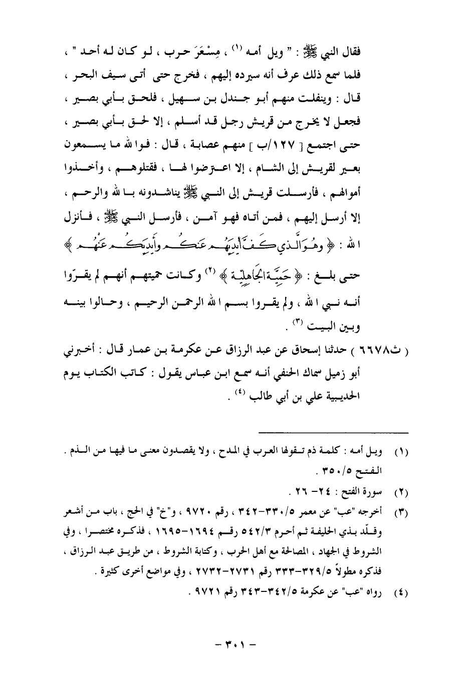 6678 - حَدَّثَنَا إِسْحَاقُ، عَنْ عَبْدِ الرَّزَّاقِ، عَنْ عِكْرِمَةَ بْنِ عَمَّارٍ، قَالَ: أَخْبَرَنِي أَبُو زُمَيْلٍ، سِمَاكُ الْحَنَفِيُّ، أَنَّهُ سَمِعَ ابْنَ عَبَّاسٍ، يَقُولُ: " كَاتِبُ الْكِتَابِ يَوْمَ الْحُدَيْبِيَةِ عَلِيُّ بْنُ أَبِي طَالِبٍ. -[302]- قَالَ أَبُو بَكْرٍ: وَقَدْ تَكَلَّمَ بَعْضُ أَهْلِ الْعِلْمِ فِي مَعَانِي أَحْرُفٍ مِنْ هَذَا الْحَدِيثِ، مِنْ ذَلِكَ قَوْلُهُ: الْغَمِيمِ، قَالَ: هُوَ مَا بَيْنَ عُسْفَانَ وَضَجَنَانَ، وَقَوْلُهُ: قَتَرَةُ الْجَيْشِ، الْقَتَرَةُ هُوَ الْغُبَارُ، يُرِيدُ غَبَرَةَ الْجَيْشِ، وَحُكِيَ عَنْ أَبِي عُبَيْدَةَ أَنَّهُ قَالَ فِي قَوْلِهِ: " {وَلَا يَرْهَقُ وُجُوهَهُمْ قَتَرٌ وَلَا ذِلَّةٌ} [يونس: 26] ، الْآيَةَ، قَالَ: الْقَتَرُ الْغُبَارُ. وَقَوْلُهُ: فَأَلَحَّتْ، يُرِيدُ لَزِمَتْ مَكَانَهَا، أَوْ لَمْ تَبْرَحْ، يُقَالُ: أَلَحَّ الْجَمَلُ، وَخَلَدَتِ النَّاقَةُ، وَحَرَنَ الْفَرَسُ، وَالثَّمَدُ: الْمَاءُ الْقَلِيلُ، وَجَمْعُهُ ثِمَادٌ، وَيُقَالُ: مَاءٌ مَثْمُودٌ، إِذَا كَثُرَ عَلَيْهِ النَّاسُ حَتَّى يَفْنَى، وَرَجُلٌ مَثْمُودٌ، وَقَدْ ثَمِدَتْهُ النِّسَاءُ، إِذَا نَزَفَتْ مَاءَهُ لِكَثْرَةِ الْجِمَاعِ. وَقَوْلُهُ: يَتَبَرَّضُ النَّاسُ تَبَرُّضًا، أَيْ يَأْخُذُونَهُ قَلِيلًا قَلِيلًا، يُقَالُ: بَرَضْتُ لَهُ بَرْضًا إِذَا أَعْطَيْتُهُ شَيْئًا يَسِيرًا. وَقَوْلُهُ: مَا زَالَ يَجِيشُ لَهُمْ بِالرِّيِّ أَيْ يَرْتَفِعُ مَاؤُهُ. وَقَوْلُهُ: إِذْ جَاءَ بُدَيْلُ بْنُ وَرْقَاءَ الْخُزَاعِيُّ فِي نَفَرٍ مِنْ قَوْمِهِ مِنْ خُزَاعَةَ، وَكَانَ عَيْبَةَ نُصْحِ رَسُولِ اللهِ مِنْ أَهْلِ تِهَامَةَ , قَوْلُهُ: عَيْبَةُ نُصْحِ رَسُولِ اللهِ: يَعْنِي مَوْضِعَ سِرِّهِ، وَمَنْ يُسْتَنْصَحُ وَيُؤُتَمَنُ عَلَى أَمْرِهِ، وَمِنْهُ قَوْلُهُ: الْأَنْصَارُ كَرِشِي وَعَيْبَتِي. وَقَوْلُهُ: مَعَهُمُ الْعُوذُ الْمَطَافِيلُ، يُرِيدُ النِّسَاءَ وَالصِّبْيَانَ، وَالْعُوذُ جَمْعُ عَائِذٍ. وَقَوْلُهُ: فَوَالَّذِي نَفْسِي بِيَدِهِ لَأُقَاتِلَنَّهُمْ عَلَى أَمْرِي هَذَا حَتَّى تَنْفَرِدَ سَالِفَتِي، أَوْ يُنْفِذَنَّ اللهُ أَمَرَهُ، وَالسَّالِفَتَانِ نَاحِيَتَا مُقَدَّمِ الْعُنُقِ مِنْ بَدَنِ مُعَلَّقِ الْقُرْطِ إِلَى التَّرْقُوَةِ، كَأَنَّهُ قَالَ: لَا أَزَالُ أُجَاهِدُ حَتَّى أَنْفُذَ لِأَمْرِ اللهِ وَأُبَلِّغَهُ، أَوْ يُفَرَّقَ بَيْنَ رَأْسِي وَجِسْمِي. -[303]- وَقَوْلُهُ: فَوَاللهِ إِنِّي لَأَرَى وُجُوهًا، وَأَرَى أَشْوَابًا مِنَ النَّاسِ، خَلِقًا أَنْ يَفِرُّوا وَيَدَعُوكَ، قَالَ: هُمُ الْأَخْلَاطُ مِنَ النَّاسِ، وَكَذَلِكَ الْأَوْبَاشُ. قَالَ أَبُو بَكْرٍ: وَقَدْ تَضَمَّنَ خَبَرُ الْمِسْوَرِ بْنِ مَخْرَمَةَ، وَمَرْوَانَ بْنِ الْحَكَمِ عَدَدَ أَبْوَابٍ مِنْ كِتَابِ الْمَنَاسِكِ، وَالْجِهَادِ، وَغَيْرِ ذَلِكَ مِنَ الْأَحْكَامِ، وَالْآدَابِ أَحْبَبْتُ إِثْبَاتَ مَا حَضَرَنِي مِنْ ذَلِكَ بِعَقِبِ حَدِيثِهِمَا، فَمِنْ ذَلِكَ. أَنَّ نَبِيَّ اللهِ سَنَّ ذَا الْحُلَيْفَةِ مِيقَاتًا لِمَنْ أَرَادَ الْعُمْرَةَ مِنْ أَهْلِ الْمَدِينَةِ فِي سَنَةِ سِتٍّ، وَسَنَّ الْمَوَاقِيتَ بَعْدَ ذَلِكَ، قَالَ رَسُولُ اللهِ صَلَّى اللَّهُ عَلَيْهِ وَسَلَّمَ بَعْدَ ذَلِكَ قَبْلَ أَنْ يَحُجَّ: يُهِلُّ أَهْلُ الْمَدِينَةِ مِنْ ذِي الْحُلَيْفَةِ، وَأَهْلُ الشَّامِ مِنَ الْجُحْفَةِ، وَأَهْلُ نَجْدٍ مِنْ قَرْنٍ، وَأَهْلُ الْيَمَنِ مِنْ يَلَمْلَمَ. وَمِنْ ذَلِكَ: أَنَّ الْأَفْضَلَ وَالْأَعْلَى الْإِحْرَامُ مِنَ الْمَوَاقِيتِ اسْتِدْلَالًا بِأَنَّ النَّبِيَّ صَلَّى اللَّهُ عَلَيْهِ وَسَلَّمَ لَمَّا خَرَجَ يُرِيدُ الْعُمْرَةَ عَامَ الْحُدَيْبِيَةِ تَرَكَ الْإِحْرَامَ مِنْ مَنْ