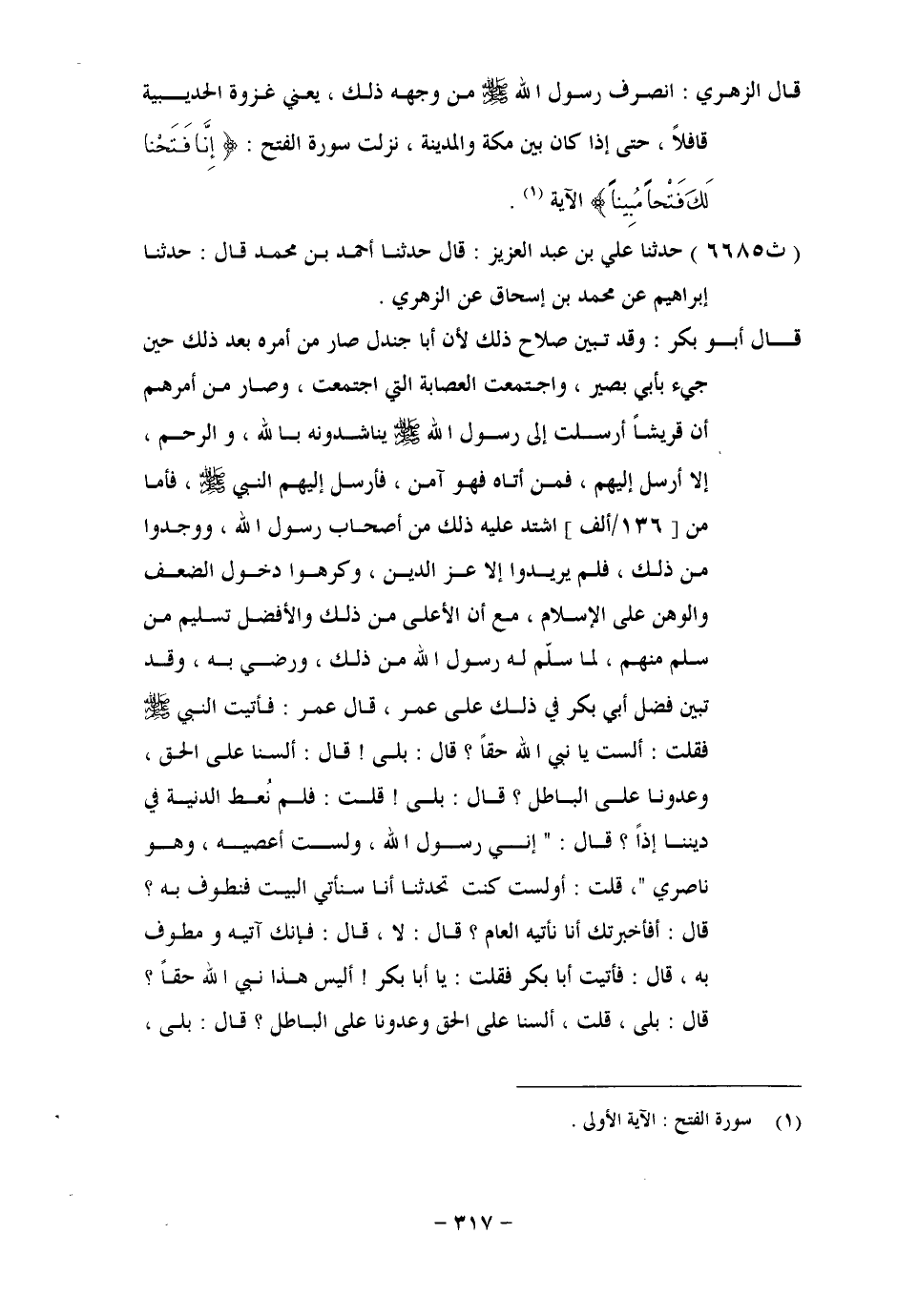 6685 - حَدَّثَنَا عَلِيُّ بْنُ عَبْدِ الْعَزِيزِ: قَالَ حَدَّثَنَا أَحْمَدُ بْنُ مُحَمَّدٍ، قَالَ: حَدَّثَنَا إِبْرَاهِيمُ، عَنْ مُحَمَّدِ بْنِ إِسْحَاقَ، عَنِ الزُّهْرِيِّ قَالَ أَبُو بَكْرٍ: وَقَدْ تَبَيَّنَ صَلَاحُ ذَلِكَ لِأَنَّ أَبَا جَنْدَلٍ صَارَ مِنْ أَمْرِهِ بَعْدَ ذَلِكَ حِينَ جِيءَ بِأَبِي بَصِيرٍ، وَاجْتَمَعَتِ الْعِصَابَةُ الَّتِي اجْتَمَعَتْ، وَصَارَ مِنْ أَمْرِهِمْ أَنَّ قُرَيْشًا أَرْسَلَتْ إِلَى رَسُولِ اللهِ صَلَّى اللَّهُ عَلَيْهِ وَسَلَّمَ يُنَاشِدُونَهُ بِاللهِ وَالرَّحِمِ، إِلَّا أَرْسَلَ إِلَيْهِمْ، فَمَنْ أَتَاهُ فَهُوَ آمِنٌ، فَأَرْسَلَ إِلَيْهِمُ النَّبِيُّ صَلَّى اللَّهُ عَلَيْهِ وَسَلَّمَ، فَأَمَّا مَنِ اشْتَدَّ عَلَيْهِ ذَلِكَ مِنْ أَصْحَابِ رَسُولِ اللهِ، وَوَجَدُوا مِنْ ذَلِكَ، فَلَمْ يُرِيدُوا إِلَّا عَزَّ الدِّينِ، وَكَرِهُوا دُخُولَ الضَّعْفِ وَالْوَهَنِ عَلَى الْإِسْلَامِ، مَعَ أَنَّ الْأَعْلَى مِنْ ذَلِكَ وَالْأَفْضَلَ تَسْلِيمُ مَنْ سَلِمَ مِنْهُمْ، لِمَا سَلَّمَ لَهُ رَسُولُ اللهِ مِنْ ذَلِكَ، وَرَضِيَ بِهِ، وَقَدْ تَبَيَّنَ فَضْلُ أَبِي بَكْرٍ فِي ذَلِكَ عَلَى عُمَرَ، قَالَ عُمَرُ: فَأَتَيْتُ النَّبِيَّ صَلَّى اللَّهُ عَلَيْهِ وَسَلَّمَ، فَقُلْتُ: أَلَسْتَ يَا نَبِيَّ اللهِ حَقًّا؟ قَالَ: بَلَى "، قَالَ: أَلَسْنَا عَلَى الْحَقِّ، وَعَدُوُّنَا عَلَى الْبَاطِلِ؟ قَالَ: بَلَى "، قُلْتُ: فَلِمَ نُعْطِ الدَّنِيَّةَ فِي دِينِنَا إِذًا؟ قَالَ: إِنِّي رَسُولُ اللهِ، وَلَسْتُ أَعْصِيهِ، وَهُوَ نَاصِرِي "، قُلْتُ: أَوَ لَسْتَ كُنْتَ تُحَدِّثُنَا أَنَّا سَنَأْتِي الْبَيْتَ فَنَطُوفُ بِهِ؟، قَالَ: أَفَأَخْبَرْتُكَ أَنَّا نَأْتِيهِ الْعَامَ؟ "، قَالَ: لَا، قَالَ: فَإِنَّكَ آتِيهِ وَمُطَوِّفٌ بِهِ "، قَالَ: فَأَتَيْتُ أَبَا بَكْرٍ فَقُلْتُ: يَا أَبَا بَكْرٍ، أَلَيْسَ هَذَا نَبِيَّ اللهِ حَقًّا؟، قَالَ: بَلَى، قُلْتُ: أَلَسْنَا عَلَى الْحَقِّ وَعَدُوُّنَا عَلَى الْبَاطِلِ؟، قَالَ: بَلَى، -[318]- قُلْتُ: فَلِمَ نُعْطِ الدَّنِيَّةَ فِي دِينِنَا؟، قَالَ: أَيْهِ الرَّجُلُ إِنَّهُ رَسُولُ اللهِ، لَيْسَ يَعْصِي رَبَّهُ، وَهُوَ نَاصِرُهُ، فَاسْتَمْسِكْ بِغَرْزِهِ حَتَّى تَمُوتَ، فَوَاللهِ إِنَّهُ لَعَلَى الْحَقِّ، قُلْتُ: أَوَلَيْسَ كَانَ عُدَّتُنَا أَنَّا سَنَأْتِي الْبَيْتَ وَنَطُوفُ بِهِ، قَالَ: بَلَى، أَفَأَخْبَرَكَ أَنَّكَ تَأْتِيَهُ الْعَامَ؟ قَالَ: لَا، وَقَالَ: فَإِنَّكَ آتِيهِ وَمُطَوِّفٌ بِهِ، قَالَ الزُّهْرِيُّ: قَالَ عُمَرُ: فَفَعَلْتُ لِذَلِكَ أَعْمَالًا. فَفِي جَوَّابِ أَبِي بَكْرٍ بِمِثْلِ مَا أَجَابَ بِهِ رَسُولُ اللهِ صَلَّى اللَّهُ عَلَيْهِ وَسَلَّمَ دَلِيلٌ عَلَى أَنَّ أَبَا بَكْرٍ كَانَ أَعْلَمَ النَّاسِ بِأَحْكَامِ اللهِ، وَأَحْكَامِ رَسُولِهِ صَلَّى اللَّهُ عَلَيْهِ وَسَلَّمَ وَدِينِهِ بَعْدَ نَبِيِّ اللهِ صَلَّى اللَّهُ عَلَيْهِ وَسَلَّمَ، وَفِي قَوْلِهِ: «إِنِّي رَسُولُ اللهِ، وَلَسْتُ أَعْصِيهِ، وَهُوَ نَاصِرِي» دَلِيلٌ عَلَى أَنَّهُ أَجَابَ إِلَى مَا أَجَابَ بِهِ بِأَمْرِ اللهِ. وَيَدُلُّ قَوْلُ رَسُولِ اللهِ صَلَّى اللَّهُ عَلَيْهِ وَسَلَّمَ: فَإِنَّكَ آتِيهِ وَمُطَوِّفٌ بِهِ، بَعْدَمَا قَدْ تَقَدَّمَ مِنَ الْكَلَامِ، عَلَى أَنَّ مَنْ حَلَفَ لَيَفْعَلَنَّ فِعْلًا لَمْ يَجْعَلْ لِذَلِكَ وَقْتًا: أَنَّ وَقْتَ ذَلِكَ جَمِيعُ حَيَاتِهِ. وَقَدِ اخْتُلِفَ فِيمَا يَجِبُ عَلَيْهِ إِذَا لَمْ يَفْعَلْ ذَلِكَ حَتَّى مَاتَ إِذَا كَانَتِ الْيَمِينُ بِطَلَاقٍ أَوْ عِتْقٍ، وَقَدْ بَيَّنْتُهُ فِي غَيْرِ هَذَا الْمَوْضِعِ. وَفِي إِجَابَةِ أَبِي بَكْرٍ بِمِثْلِ مَا أَجَابَ بِهِ النَّبِيُّ صَلَّى اللَّهُ عَلَيْهِ وَسَلَّمَ بَيَانُ فَضْلِ أَب