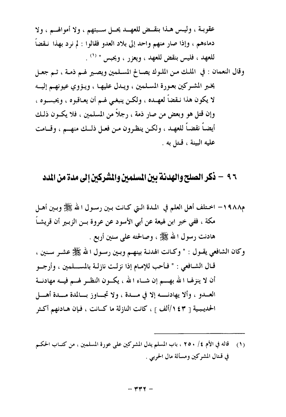 فَفِي خَبَرِ ابْنِ لَهِيعَةَ، عَنْ أَبِي الْأَسْوَدِ، عَنْ عُرْوَةَ بْنِ الزُّبَيْرِ أَنَّ قُرَيْشًا هَادَنَتْ رَسُولَ اللهِ صَلَّى اللَّهُ عَلَيْهِ وَسَلَّمَ، وَصَالَحَتْهُ عَلَى سِنِينَ أَرْبَعٍ وَكَانَ الشَّافِعِيُّ يَقُولُ: وَكَانَتِ الْهُدْنَةُ بَيْنَهُمْ وَبَيْنَ رَسُولِ اللهِ صَلَّى اللَّهُ عَلَيْهِ وَسَلَّمَ عَشْرَ سِنِينَ، قَالَ الشَّافِعِيُّ: فَأُحِبُّ لِلْإِمَامِ إِذَا نَزَلَتْ بِالْمُسْلِمِينَ، وَأَرْجُو أَنْ لَا يُنْزِلَهَا اللهُ بِهِمْ إِنْ شَاءَ اللهُ، يَكُونُ النَّظَرُ لَهُمْ فِيهِ مُهَادَنَةُ الْعَدُوِّ، وَأَلَّا يُهَادِنَهُ إِلَّا فِي مُدَّةٍ، وَلَا تَجَاوَزَ بِالْمُدَّةِ مُدَّةَ أَهْلِ الْحُدَيْبِيَةِ، كَانَتِ النَّازِلَةُ مَا كَانَتْ، فَإِنْ هَادَنَهُمْ أَكْثَرَ