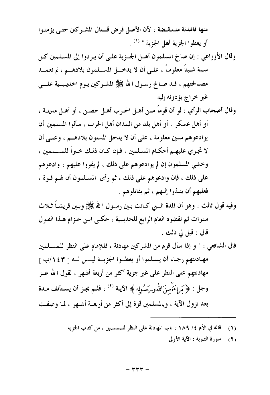 مِنْهَا فَالْهُدْنَةُ مُنْتَقِضَةٌ، لِأَنَّ الْأَصْلَ فَرْضُ قِتَالِ الْمُشْرِكِينَ حَتَّى يُؤْمِنُوا أَوْ يُعْطُوا الْجِزْيَةَ أَهْلَ الْجِزْيَةِ. وَقَالَ الْأَوْزَاعِيُّ: إِنْ صَالَحَ الْمُسْلِمُونَ أَهْلَ الْجِزْيَةِ عَلَى أَنْ يَرُدُّوا إِلَى الْمُسْلِمِينَ كُلَّ سَنَةٍ شَيْئًا مَعْلُومًا، عَلَى أَنْ لَا يَدْخُلَ الْمُسْلِمُونَ بِلَادَهُمْ، لَمْ نَعْمَدْ مُصَالَحَتَهُمْ، قَدْ صَالَحَ رَسُولُ اللهِ صَلَّى اللَّهُ عَلَيْهِ وَسَلَّمَ الْمُشْرِكِينَ يَوْمَ الْحُدَيْبِيَةِ عَلَى غَيْرِ خَرَاجٍ يُؤَدُّنَهُ إِلَيْهِ، وَقَالَ أَصْحَابُ الرَّأْيِ: لَوْ أَنَّ قَوْمًا مِنْ أَهْلِ الْحَرْبِ، أَهْلُ حِصْنٍ، وَأَهْلُ مَدِينَةٍ، أَوْ أَهْلُ عَسْكَرٍ، أَوْ أَهْلُ بَلَدٍ مِنَ الْبُلْدَانِ أَهْلِ الْحَرْبِ سَأَلُوا الْمُسْلِمِينَ أَنْ يُوَادِعُوهُمْ سِنِينَ مَعْلُومَةً، عَلَى أَنْ لَا يَدْخُلَ الْمُسْلِمُونَ بِلَادَهُمْ، وَعَلَى أَنْ لَا تَجْرِيَ عَلَيْهِمْ أَحْكَامُ الْمُسْلِمِينَ، فَإِنْ كَانَ خَيْرًا لِلْمُسْلِمِينَ، وَخَشِيَ الْمُسْلِمُونَ إِنْ لَمْ يُوَادِعُوهُمْ عَلَى ذَلِكَ، لَمْ يَقْوَوْا عَلَيْهِمْ وَادَعُوهُمْ عَلَى ذَلِكَ، فَإِنْ وَادَعُوهُمْ عَلَى ذَلِكَ، ثُمَّ رَأَى الْمُسْلِمُونَ أَنَّ لَهُمْ قُوَّةً، فَعَلَيْهِمْ أَنْ يَنْبُذُوا إِلَيْهِمْ، ثُمَّ يُقَاتِلُوهُمْ. وَفِيهِ قَوْلٌ ثَالِثٌ: وَهُوَ أَنَّ الْمُدَّةَ الَّتِي كَانَتْ بَيْنَ رَسُولِ اللهِ صَلَّى اللَّهُ عَلَيْهِ وَسَلَّمَ وَبَيْنَ قُرَيْشٍ ثَلَاثَ سَنَوَاتٍ ثُمَّ نَقَضُوهُ الْعَامَ الرَّابِعَ لِلْحُدَيْبِيَةِ، حَكَى ابْنُ حِزَامٍ هَذَا الْقَوْلَ، قَالَ: قِيلَ لِي ذَلِكَ. قَالَ الشَّافِعِيُّ: وَإِذَا سَأَلَ قَوْمٌ مِنَ الْمُشْرِكِينَ مُهَادَنَةً، فَلِلْإِمَامِ عَلَى النَّظَرِ لِلْمُسْلِمِينَ مُهَادَنَتُهُمْ رَجَاءَ أَنْ يُسْلِمُوا أَوْ يُعْطُوا الْجِزْيَةَ، لَيْسَ لَهُ مُهَادَنَتُهُمْ عَلَى النَّظَرِ عَلَى غَيْرِ جِزْيَةٍ أَكْثَرَ مِنْ أَرْبَعَةِ أَشْهُرٍ، لِقَوْلِ اللهِ عَزَّ وَجَلَّ: {بَرَاءَةٌ مِنَ اللهِ وَرَسُولِهِ} [التوبة: 1] الْآيَةَ، فَلَمْ يُجِزْ أَنْ يَسْتَأْنِفَ مُدَّةً بَعْدَ نُزُولِ الْآيَةِ، وَبِالْمُسْلِمِينَ قُوَّةٌ إِلَى أَكْثَرَ مِنْ أَرْبَعَةِ أَشْهُرٍ، لِمَا وَصَفْتُ
