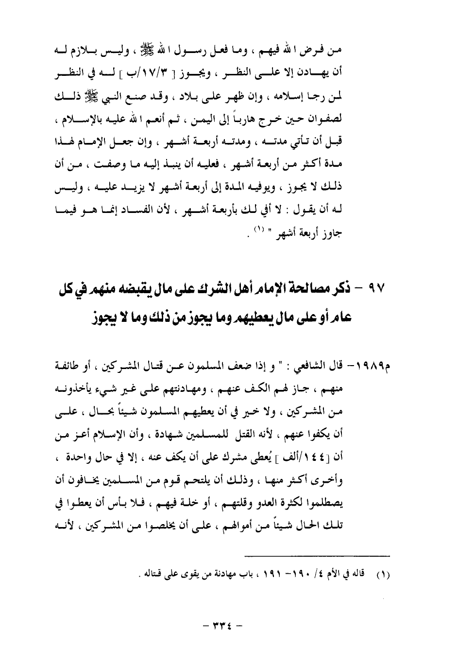 مِنْ فَرْضِ اللهِ فِيهِمْ، وَمَا فَعَلَ رَسُولُ اللهِ صَلَّى اللَّهُ عَلَيْهِ وَسَلَّمَ، وَلَيْسَ بِلَازِمٍ لَهُ أَنْ يُهَادِنَ إِلَّا عَلَى النَّظَرِ، وَيَجُوزُ لَهُ فِي النَّظَرِ لِمَنْ رَجَا إِسْلَامَهُ، وَإِنْ ظَهَرَ عَلَى بِلَادٍ، وَقَدْ صَنَعَ النَّبِيُّ صَلَّى اللَّهُ عَلَيْهِ وَسَلَّمَ ذَلِكَ لِصَفْوَانَ حِينَ خَرَجَ هَارِبًا إِلَى الْيَمَنِ، ثُمَّ أَنْعَمَ اللهُ عَلَيْهِ بِالْإِسْلَامِ، قَبْلَ أَنْ تَأْتِيَ مُدَّتُهُ، وَمُدَّتُهُ أَرْبَعَةُ أَشْهُرٍ، وَإِنْ جَعَلَ الْإِمَامُ لِهَذَا مُدَّةً أَكْثَرَ مِنْ أَرْبَعَةِ أَشْهُرٍ، فَعَلَيْهِ أَنْ يَنْبُذَ إِلَيْهِ، مَا وَصَفْتُ مِنْ أَنَّ ذَلِكَ لَا يَجُوزُ، وَيُوَفِّيَهُ الْمُدَّةَ إِلَى أَرْبَعَةِ أَشْهُرٍ لَا يَزِيدُ عَلَيْهِ، وَلَيْسَ لَهُ أَنْ يَقُولَ: لَا أَفِي بِأَرْبَعَةِ أَشْهُرٍ، لِأَنَّ الْفَسَادَ إِنَّمَا هُوَ فِيمَا جَاوَزَ أَرْبَعَةَ أَشْهُرٍ