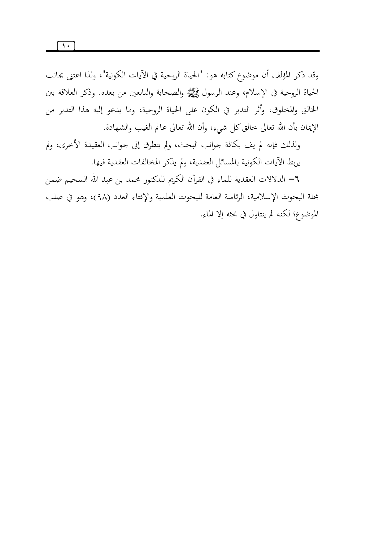 ولذلك فإنه لم يف بكافة جوانب البحث، ولم يتطرق إلى جوانب العقيدة الأخرى، ولم يربط الآيات الكونية بالمسائل العقدية، ولم يذكر المخالفات العقدية فيها.