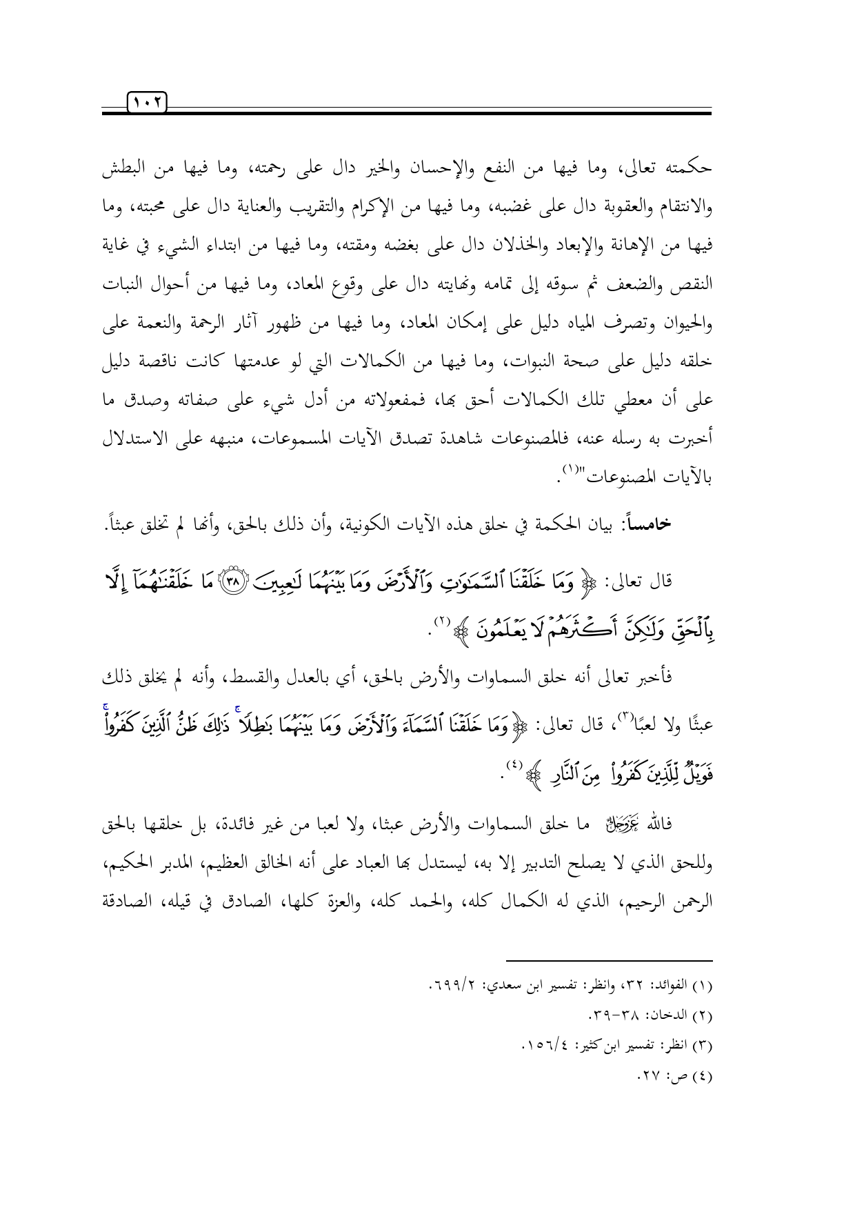 قال تعالى: {وَمَا خَلَقْنَا السَّمَاوَاتِ وَالْأَرْضَ وَمَا بَيْنَهُمَا لَاعِبِينَ (38) مَا خَلَقْنَاهُمَا إِلَّا بِالْحَقِّ وَلَكِنَّ أَكْثَرَهُمْ لَا يَعْلَمُونَ} (¬2).