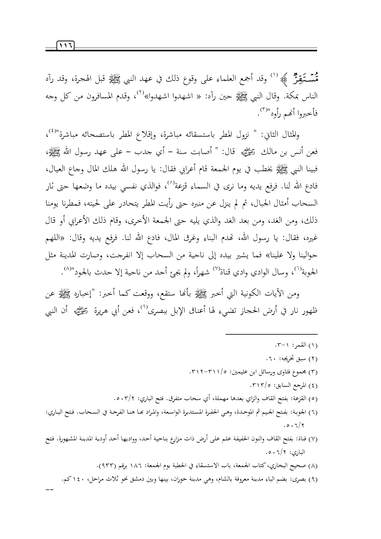 والمثال الثاني: " نزول المطر باستسقائه مباشرة، وإقلاع المطر باستصحائه مباشرة" (¬4)، فعن أنس بن مالك -رضي الله عنه- قال: " أصابت سنة - أي جدب - على عهد رسول الله -صلى الله عليه وسلم-، فبينا النبي -صلى الله عليه وسلم- يخطب في يوم الجمعة قام أعرابي فقال: يا رسول الله هلك المال وجاع العيال، فادع الله لنا. فرفع يديه وما نرى في السماء قزعة (¬5)، فوالذي نفسي بيده ما وضعها حتى ثار السحاب أمثال الجبال، ثم لم ينزل عن منبره حتى رأيت المطر يتحادر على لحيته، فمطرنا يومنا ذلك، ومن الغد، ومن بعد الغد والذي يليه حتى الجمعة الأخرى، وقام ذلك الأعرابي أو قال غيره، فقال: يا رسول الله، تهدم البناء وغرق المال، فادع الله لنا. فرفع يديه وقال: «اللهم حوالينا ولا علينا» فما يشير بيده إلى ناحية من السحاب إلا انفرجت، وصارت المدينة مثل الجوبة (¬6)، وسال الوادي وادي قناة (¬7) شهراً، ولم يجئ أحد من ناحية إلا حدث بالجود" (¬8).