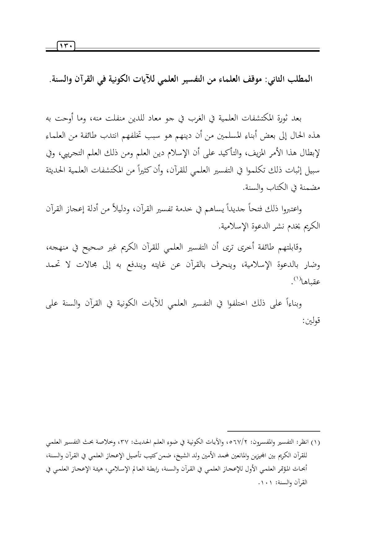 (¬1) انظر: التفسير والمفسرون: 2/ 567، والآيات الكونية في ضوء العلم الحديث: 37، وخلاصة بحث التفسير العلمي للقرآن الكريم بين المجيزين والمانعين لمحمد الأمين ولد الشيخ، ضمن كتيب تأصيل الإعجاز العلمي في القرآن والسنة، أبحاث المؤتمر العلمي الأول للإعجاز العلمي في القرآن والسنة، رابطة العالم الإسلامي، هيئة الإعجاز العلمي في القرآن والسنة: 101.