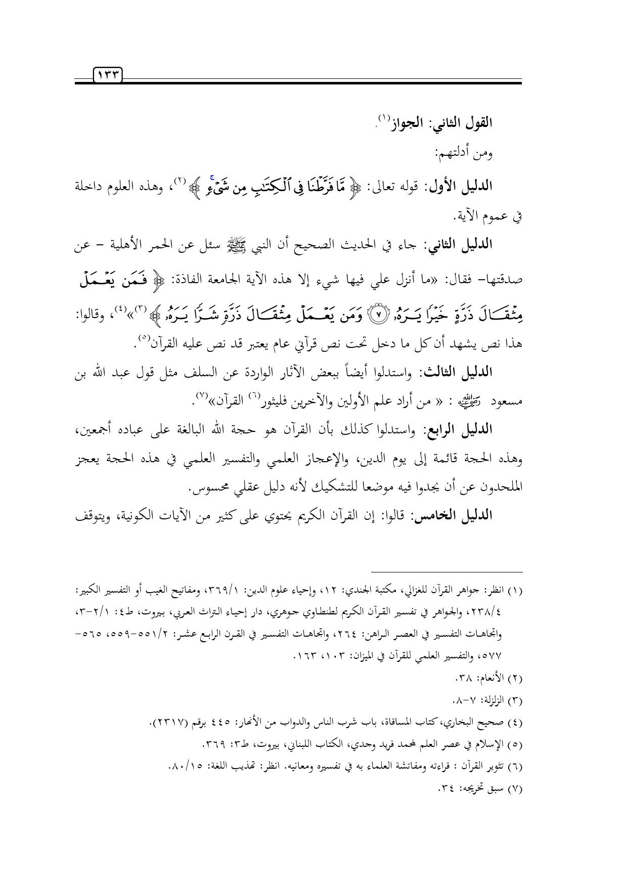 (¬1) انظر: جواهر القرآن للغزالي، مكتبة الجندي: 12، وإحياء علوم الدين: 1/ 369، ومفاتيح الغيب أو التفسير الكبير: 4/ 238، والجواهر في تفسير القرآن الكريم لطنطاوي جوهري، دار إحياء التراث العربي، بيروت، ط4: 1/ 2 - 3، واتجاهات التفسير في العصر الراهن: 264، واتجاهات التفسير في القرن الرابع عشر: 2/ 551 - 559، 565 - 577، والتفسير العلمي للقرآن في الميزان: 103، 163.