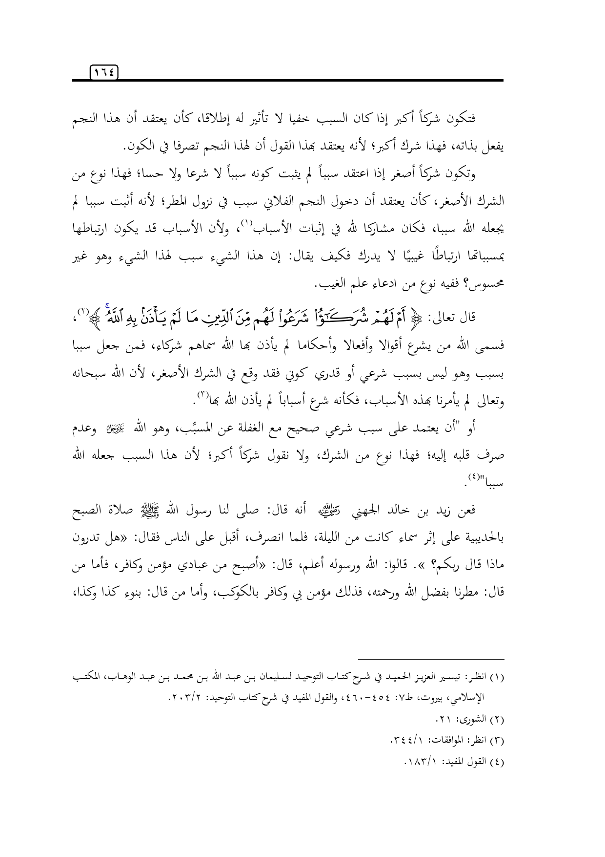 وتكون شركاً أصغر إذا اعتقد سبباً لم يثبت كونه سبباً لا شرعا ولا حسا; فهذا نوع من الشرك الأصغر، كأن يعتقد أن دخول النجم الفلاني سبب في نزول المطر; لأنه أثبت سببا لم يجعله الله سببا، فكان مشاركا لله في إثبات الأسباب (¬1)، ولأن الأسباب قد يكون ارتباطها بمسبباتها ارتباطًا غيبيًا لا يدرك فكيف يقال: إن هذا الشيء سبب لهذا الشيء وهو غير محسوس؟ ففيه نوع من ادعاء علم الغيب.